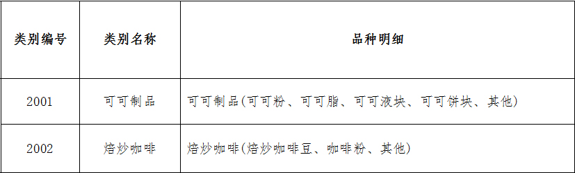 可可及焙烤咖啡產品類別編號及類別名稱:2001可可制品;2002焙炒咖啡