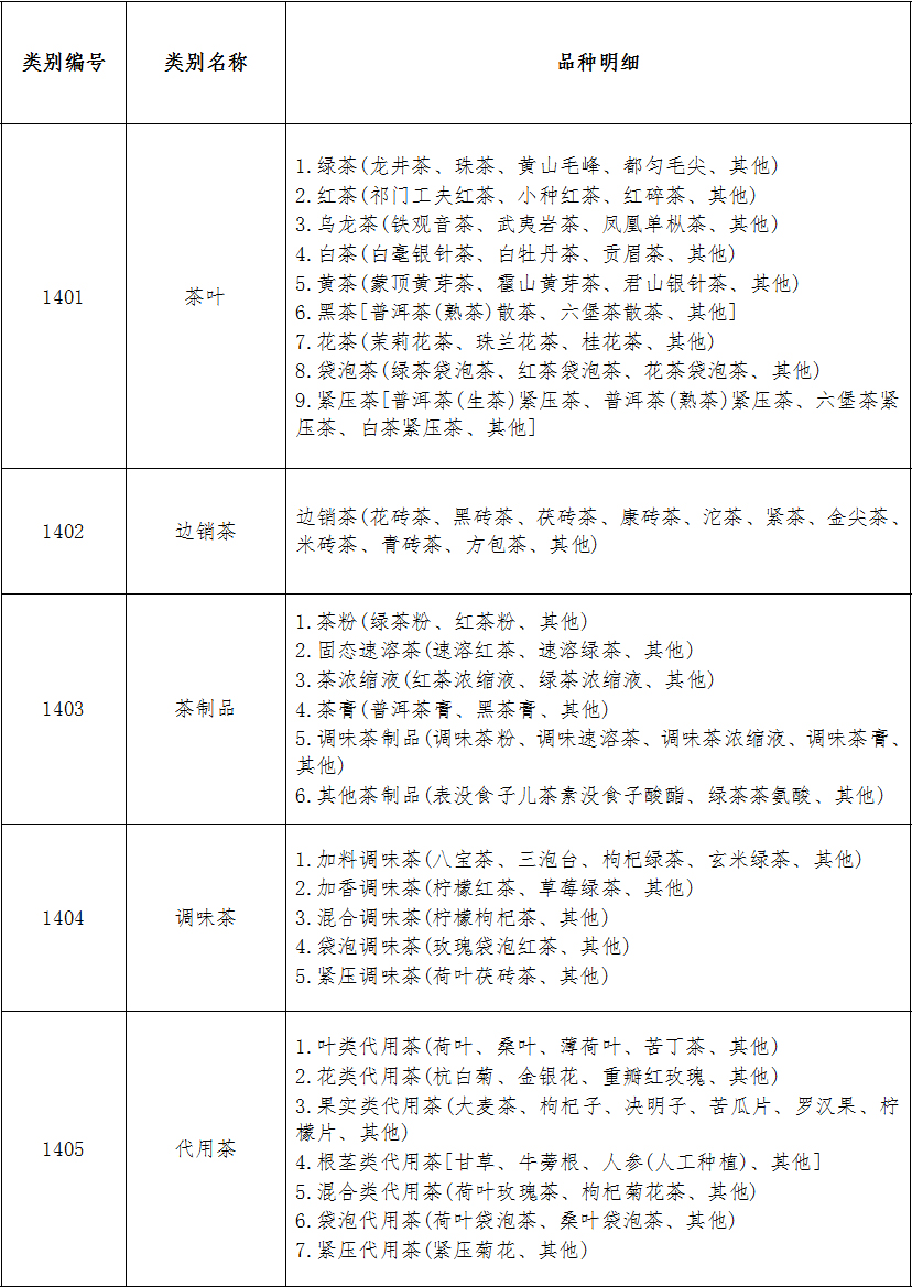 茶葉及相關制品類別編號及類別名稱:1401茶葉;1402邊銷茶;1403茶制品;1404調味茶;1405代用茶