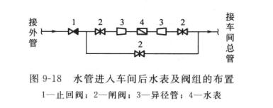 水管進入車間后,應先裝一個止回閥,然后再裝水表,以防停水或壓力不足時設備內的水倒流至全廠的管網中,如圖9-18所示。