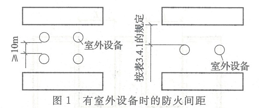3.4.11室外變、配電站是各類企業(yè)、工廠的動(dòng)力中心,電氣設(shè)備在運(yùn)行中可能產(chǎn)生電火花,存在燃燒或爆裂的危險(xiǎn)。一旦發(fā)生燃燒或爆炸,不但本身遭到破壞,而且會(huì)使一個(gè)企業(yè)或由變、配電站供電的所有企業(yè)、工廠的生產(chǎn)停頓。為保護(hù)保證生產(chǎn)的重點(diǎn)設(shè)施,室外變、配電站與其他建筑、堆場(chǎng)、儲(chǔ)罐的防火間距要求比一般廠房嚴(yán)格些。