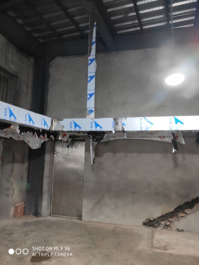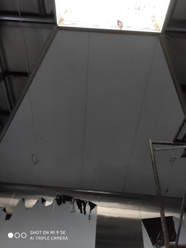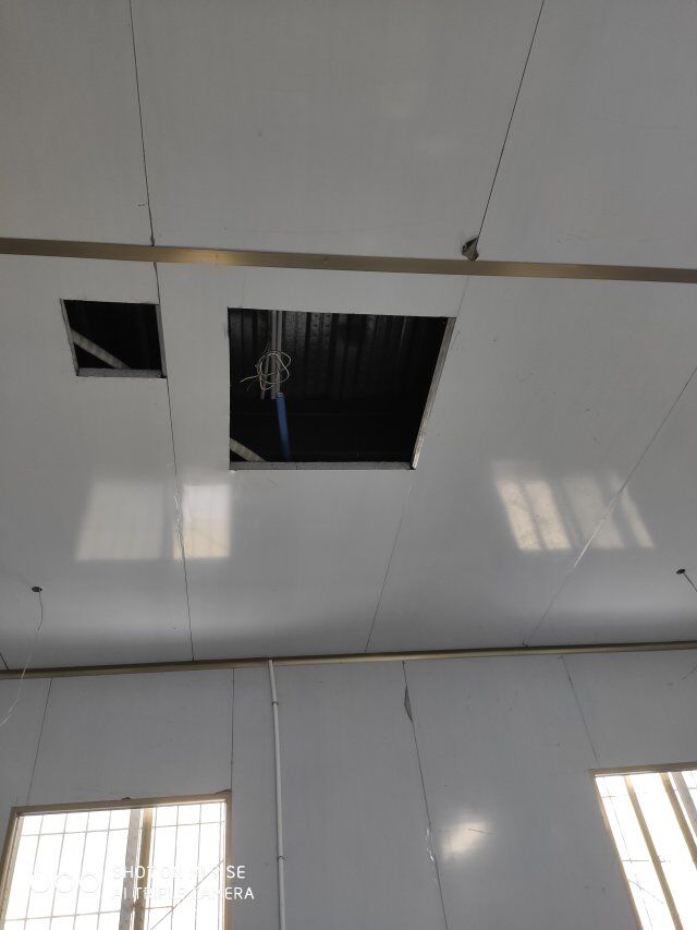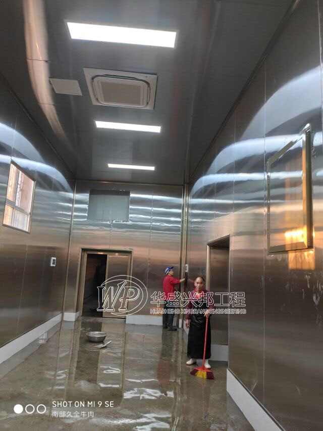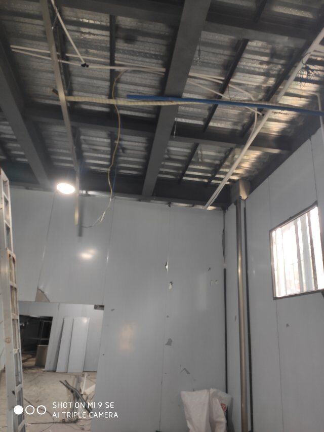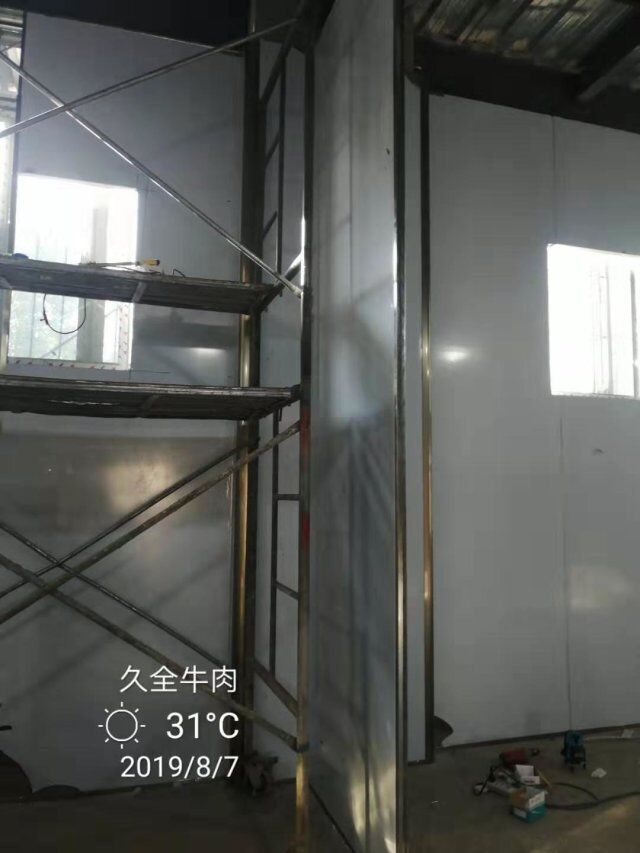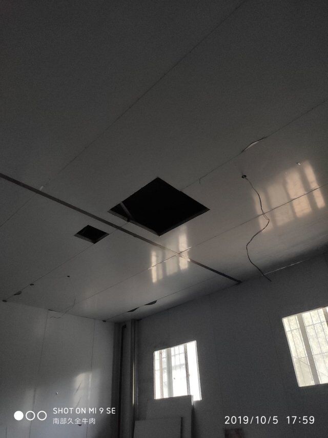 四川升鐘湖久全食品有限公司廠房裝修現場,墻板立完,風口開孔