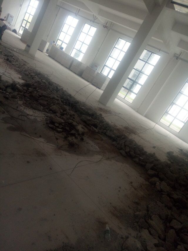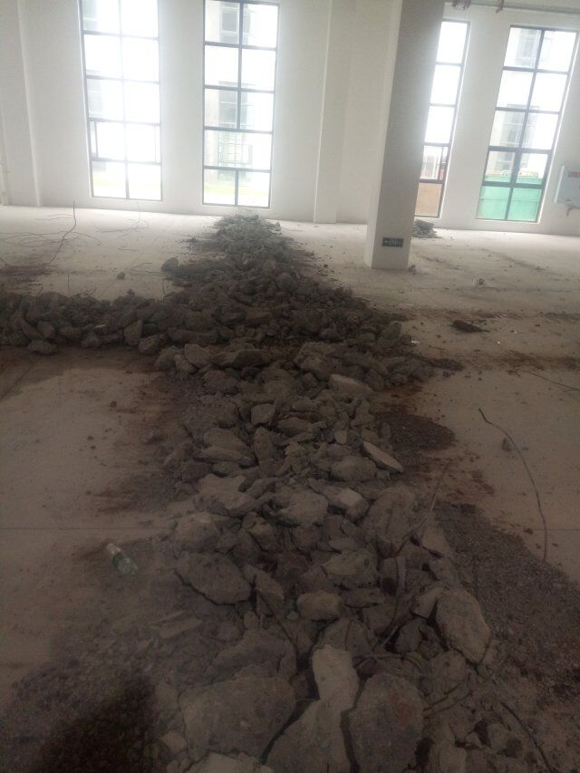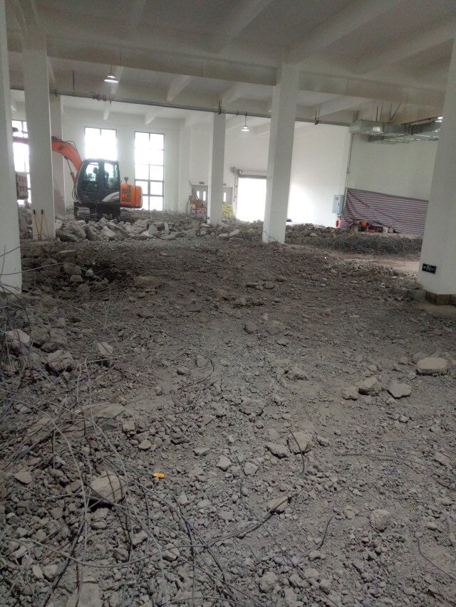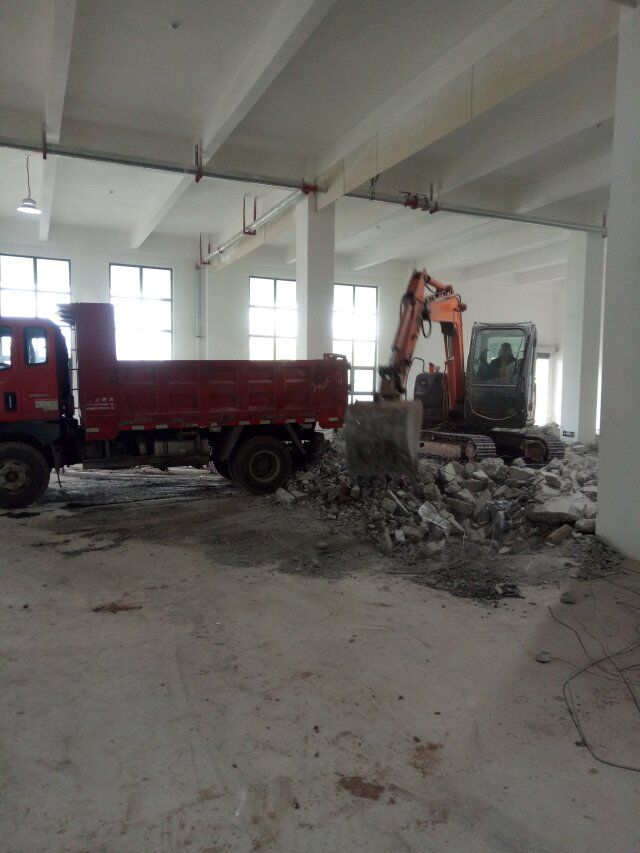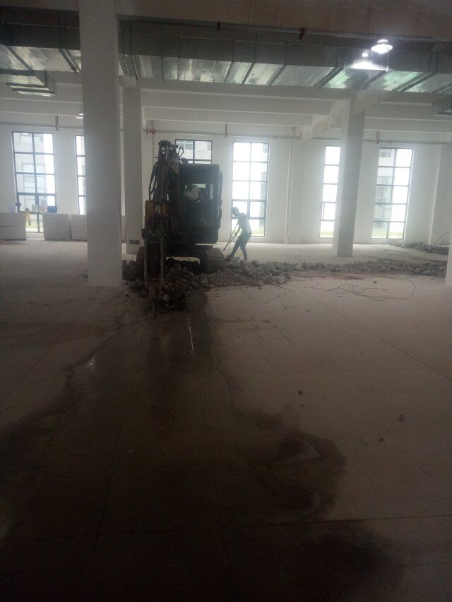 萬康川美食品工程有限公司廠房裝修現場,室內排水系統地面破碎完成