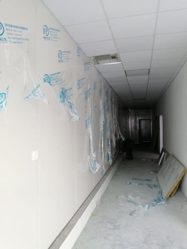 成都王老鴨食品有限公司廠房裝修現場,放線完成,隔斷擋水施工