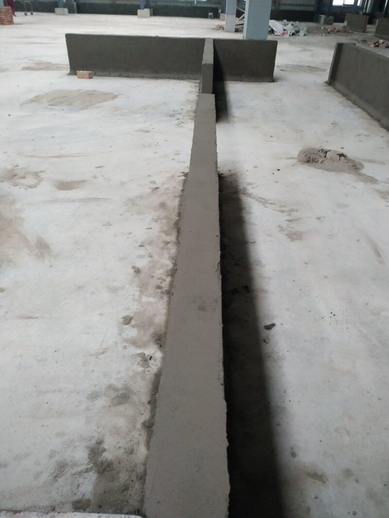 車間施工現場,鋼筋預制捆扎完成,擋水墻抹灰施工,排水溝貼磚完。