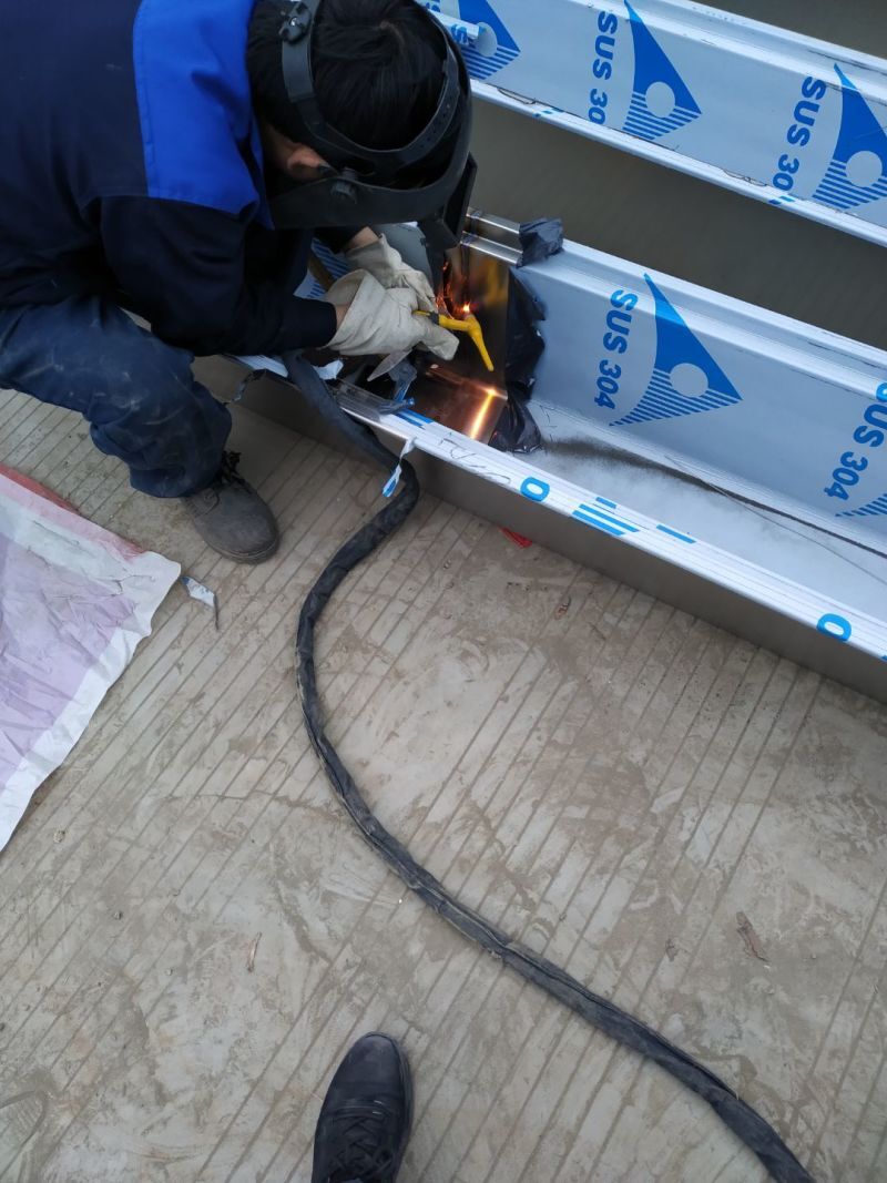 鋼筋墊高打點完成,排水溝收邊條安裝焊接,鋼筋預制,擋水墻抹灰,電梯口護邊安裝焊接完成,伸縮縫處砌磚抹灰完成。