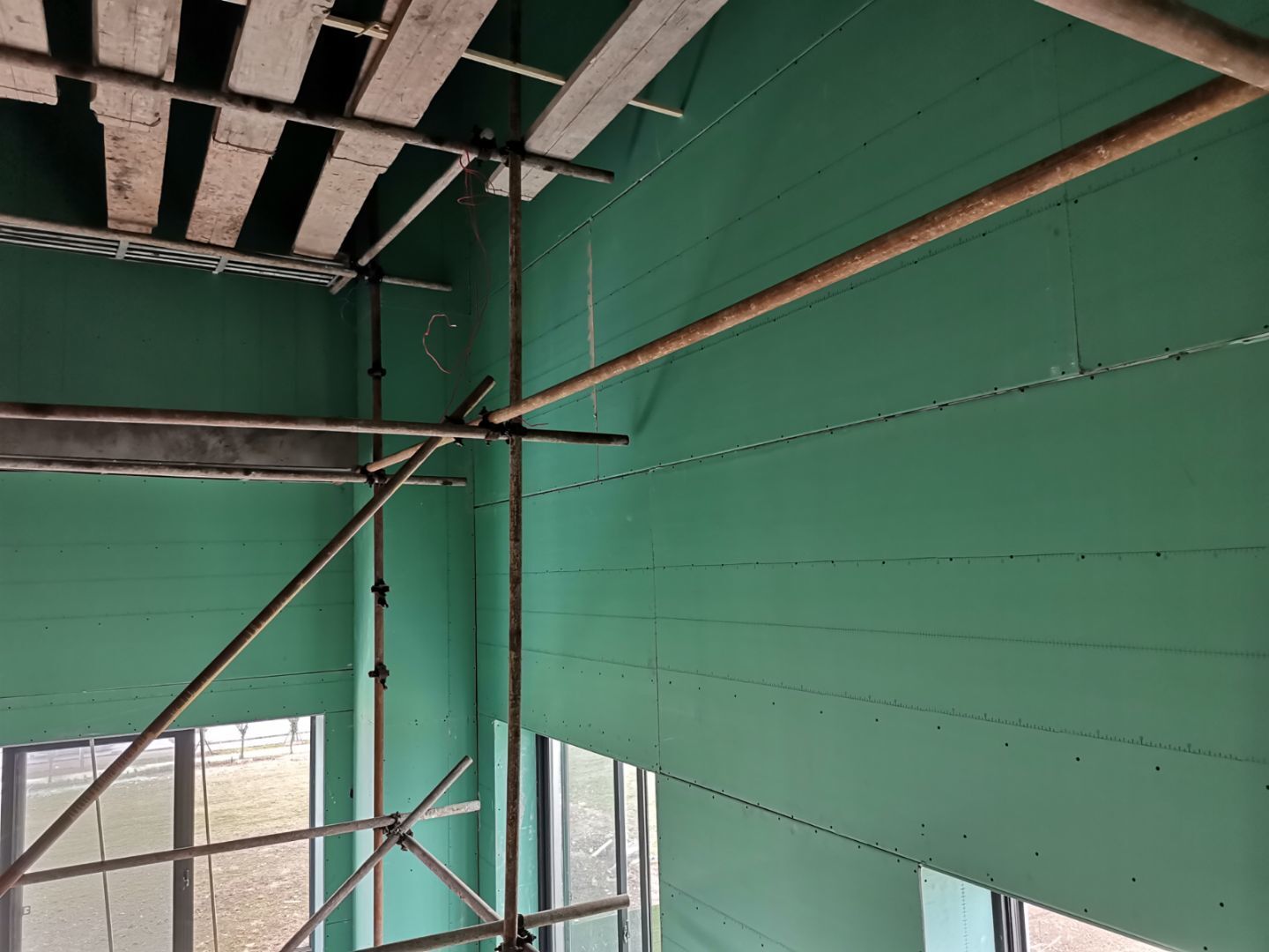 1.過渡車間砌磚抹灰完成,伸縮縫切割完成,排水溝底部貼磚完成;2.擋水墻砌磚施工,抹灰。3.防水施工;4.一樓土方轉運,場地平整完施工。