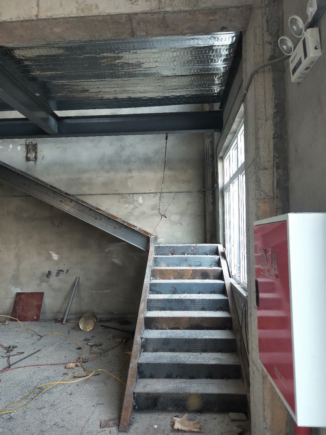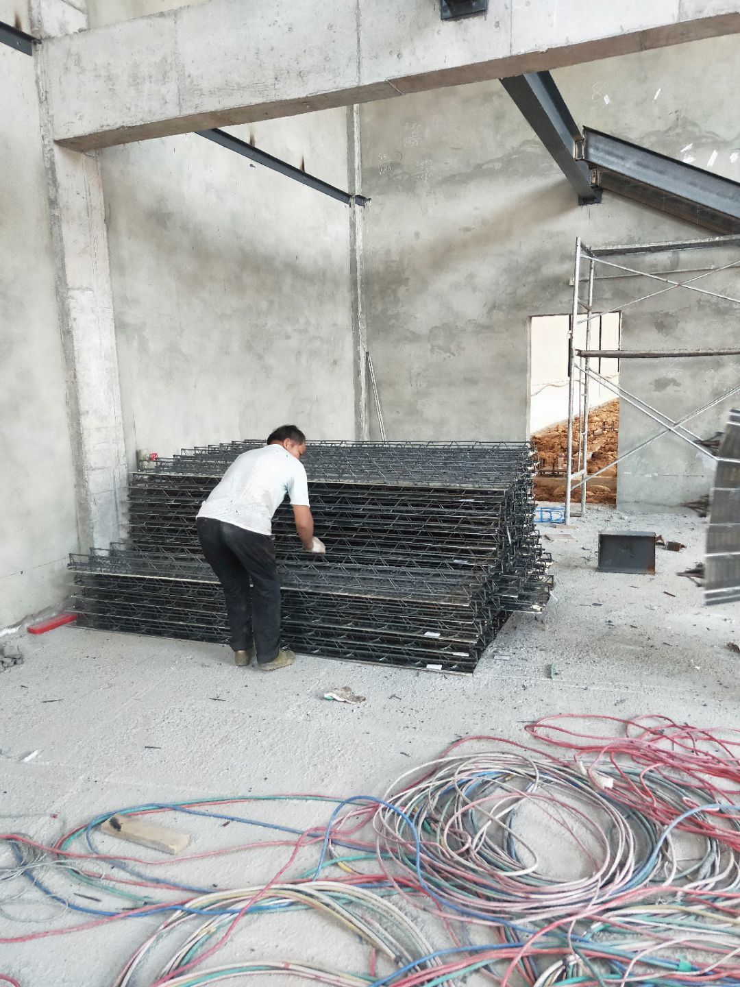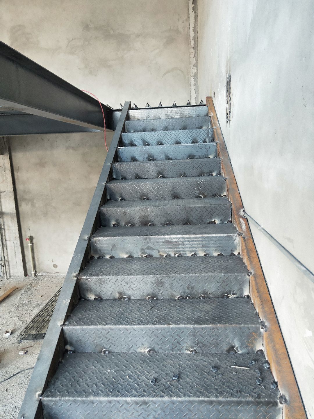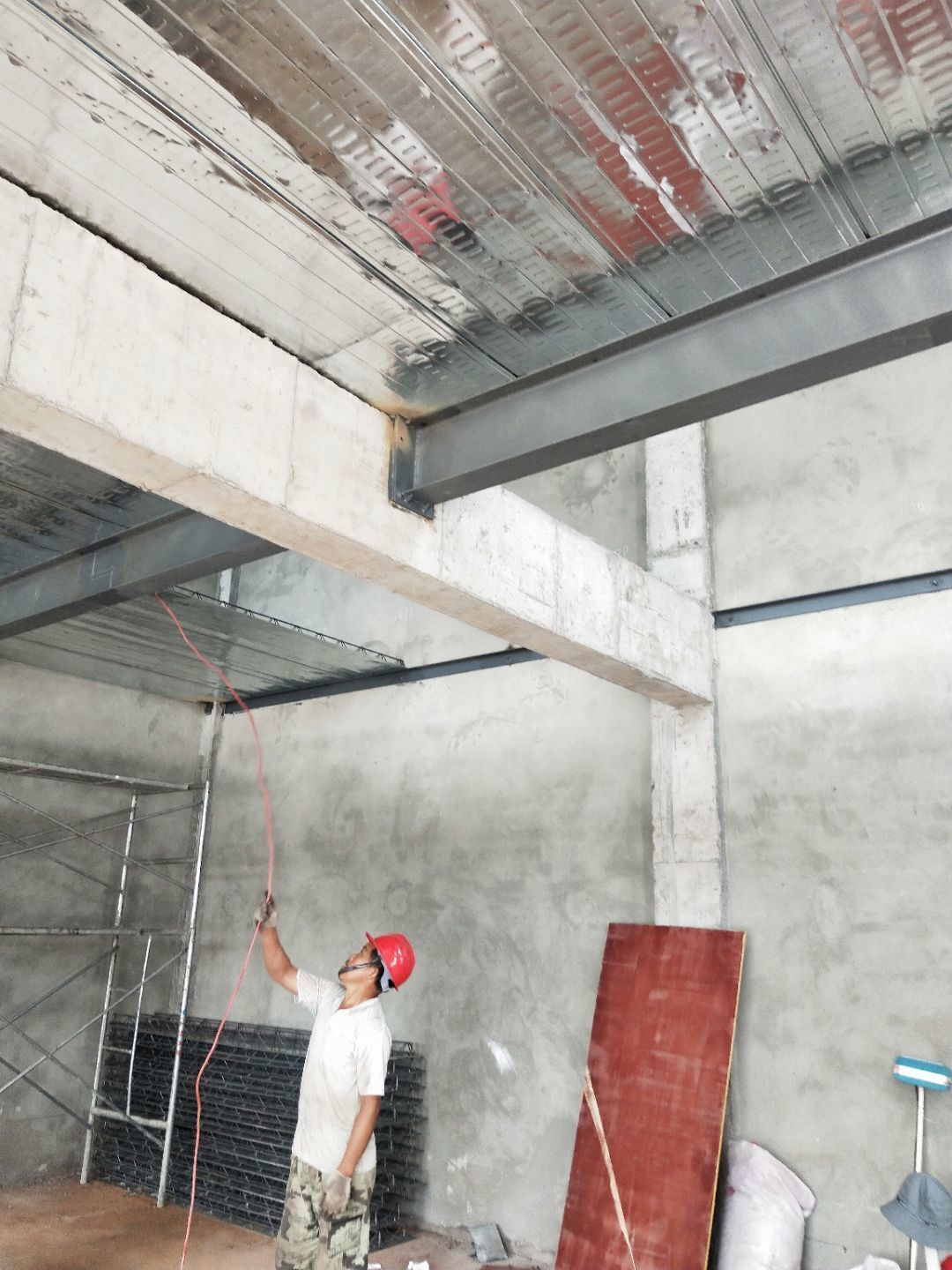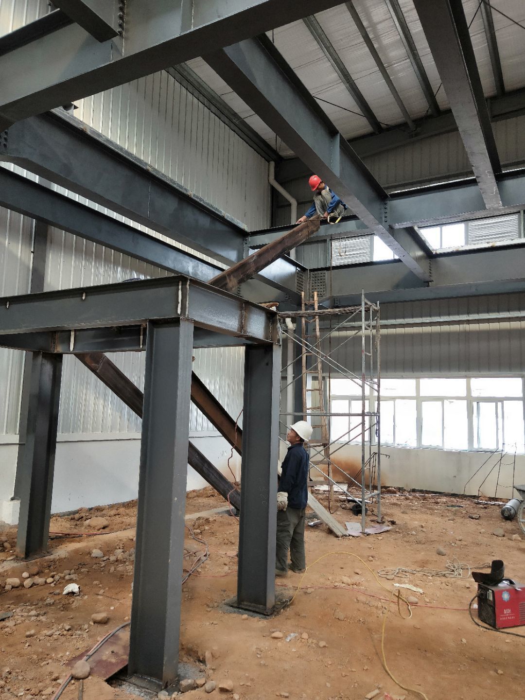 1、柱腳焊接加固 2、樓梯制作,樓板材料到場