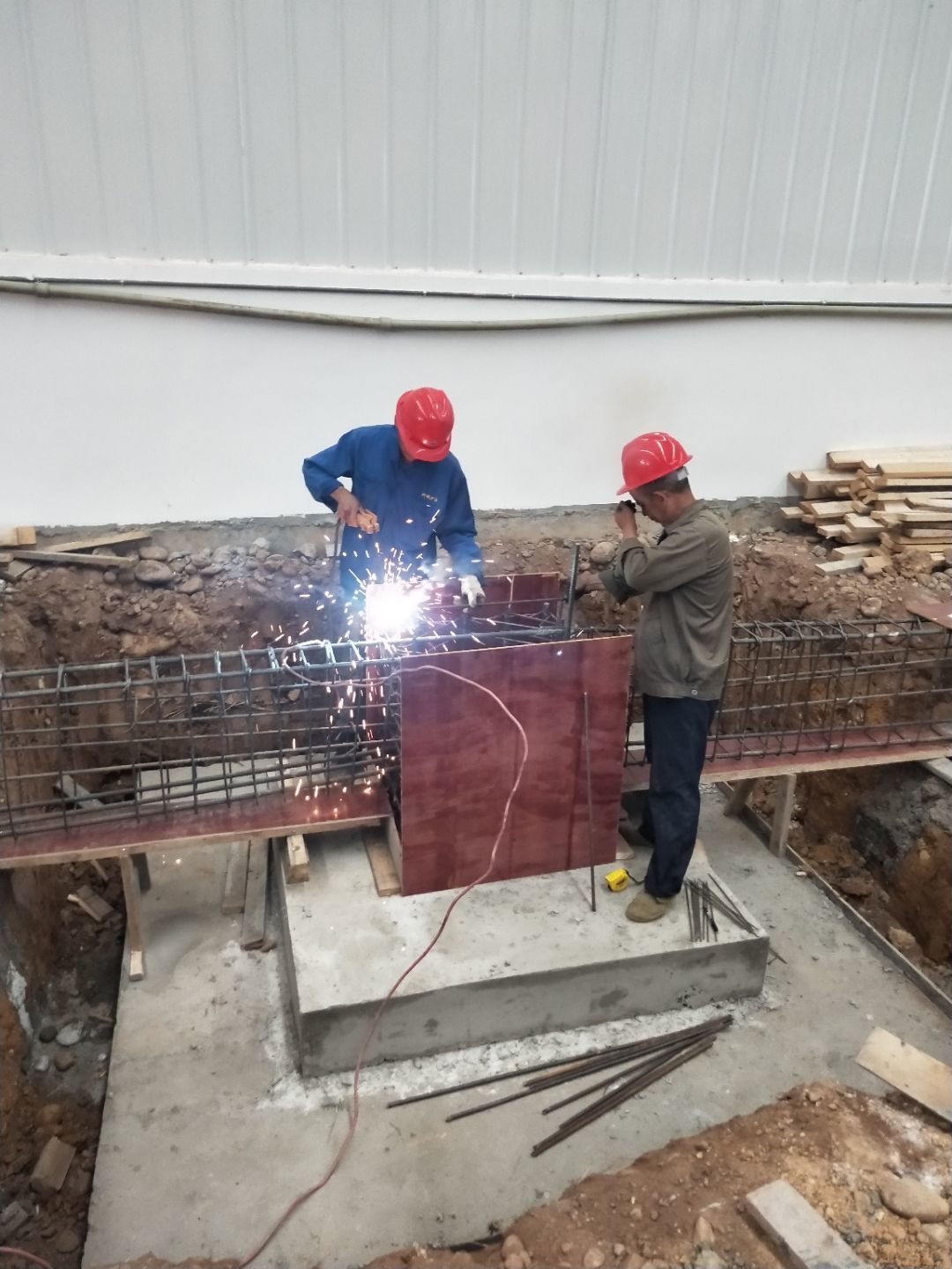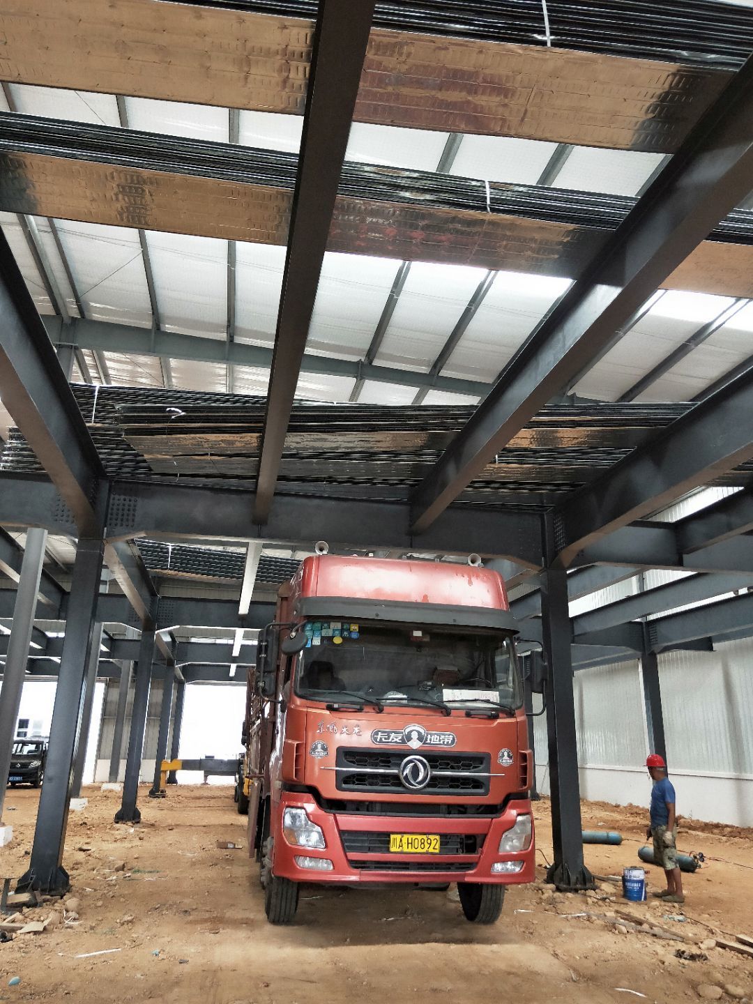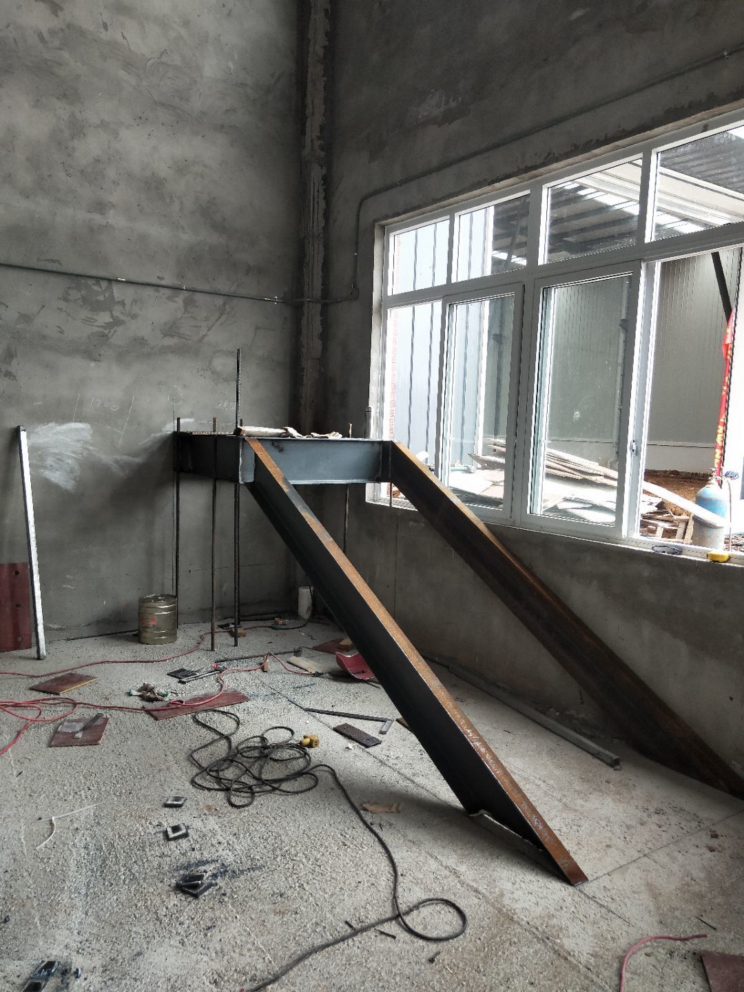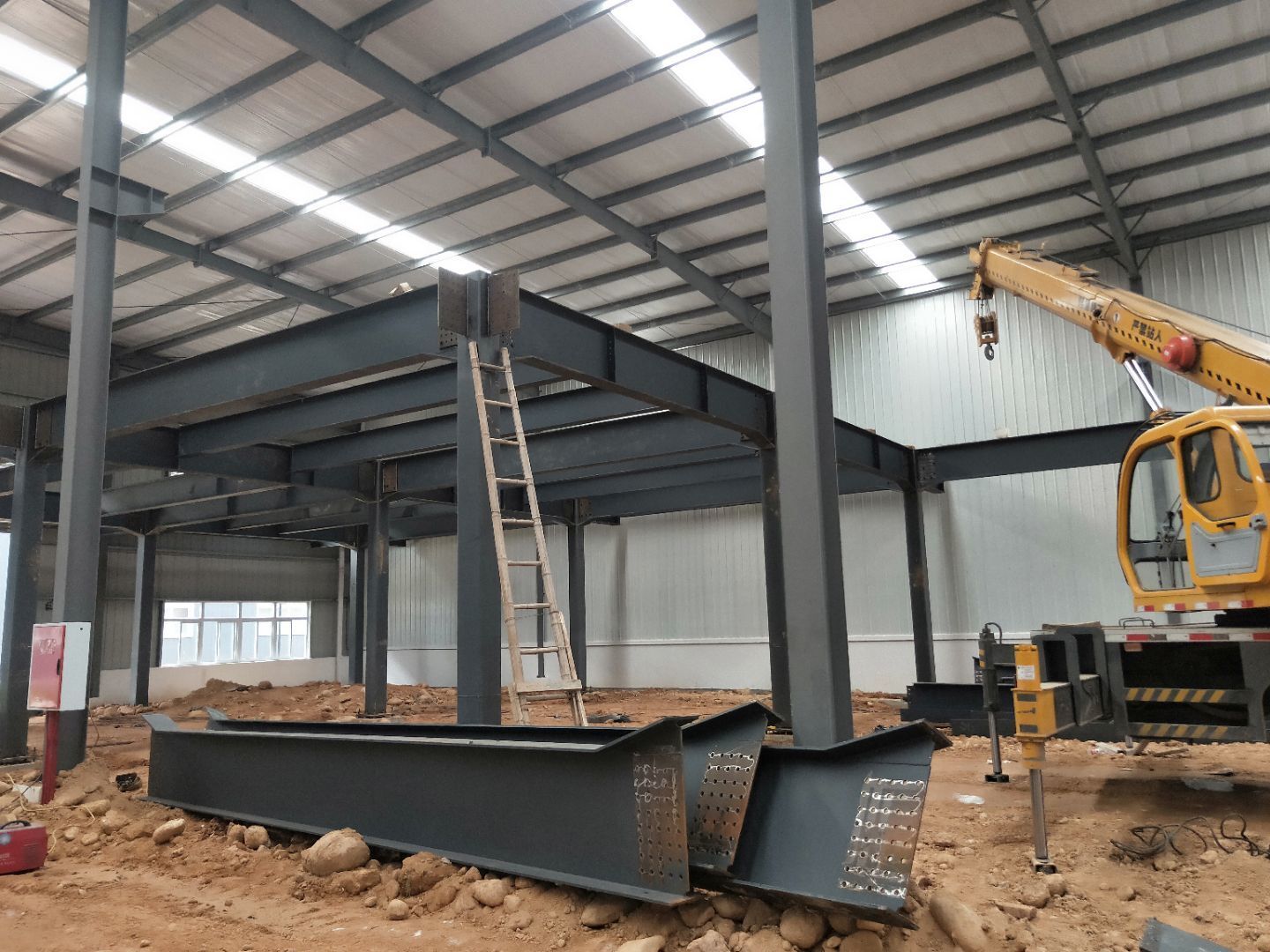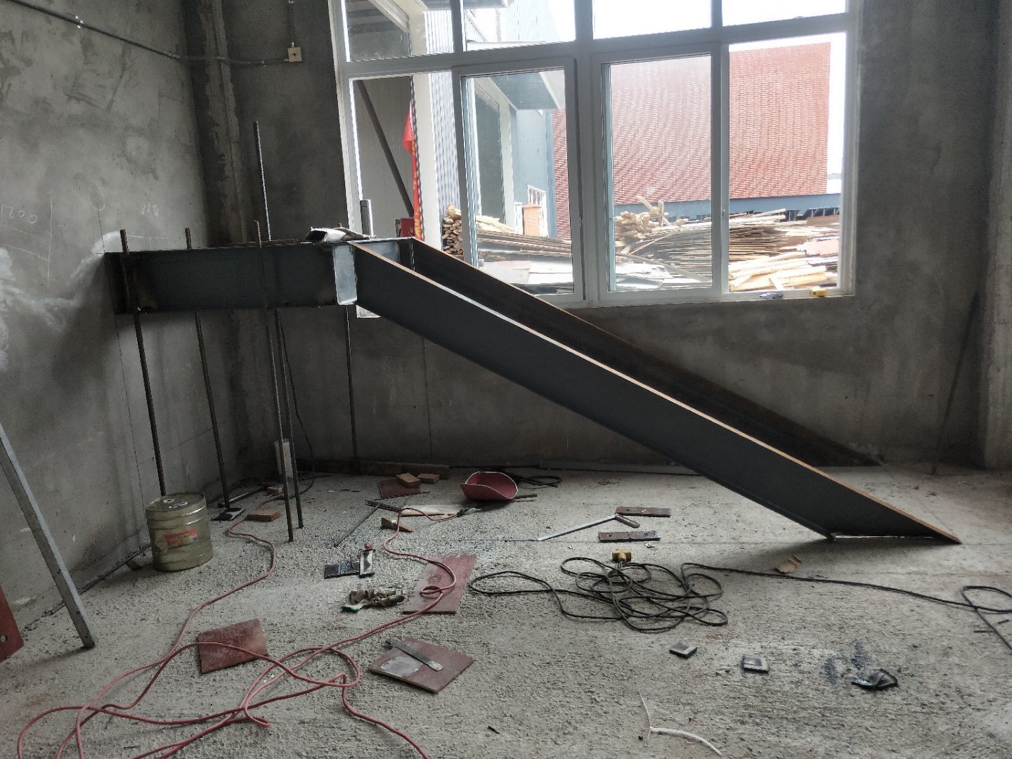 1、柱腳焊接加固 2、樓梯制作,樓板材料到場
