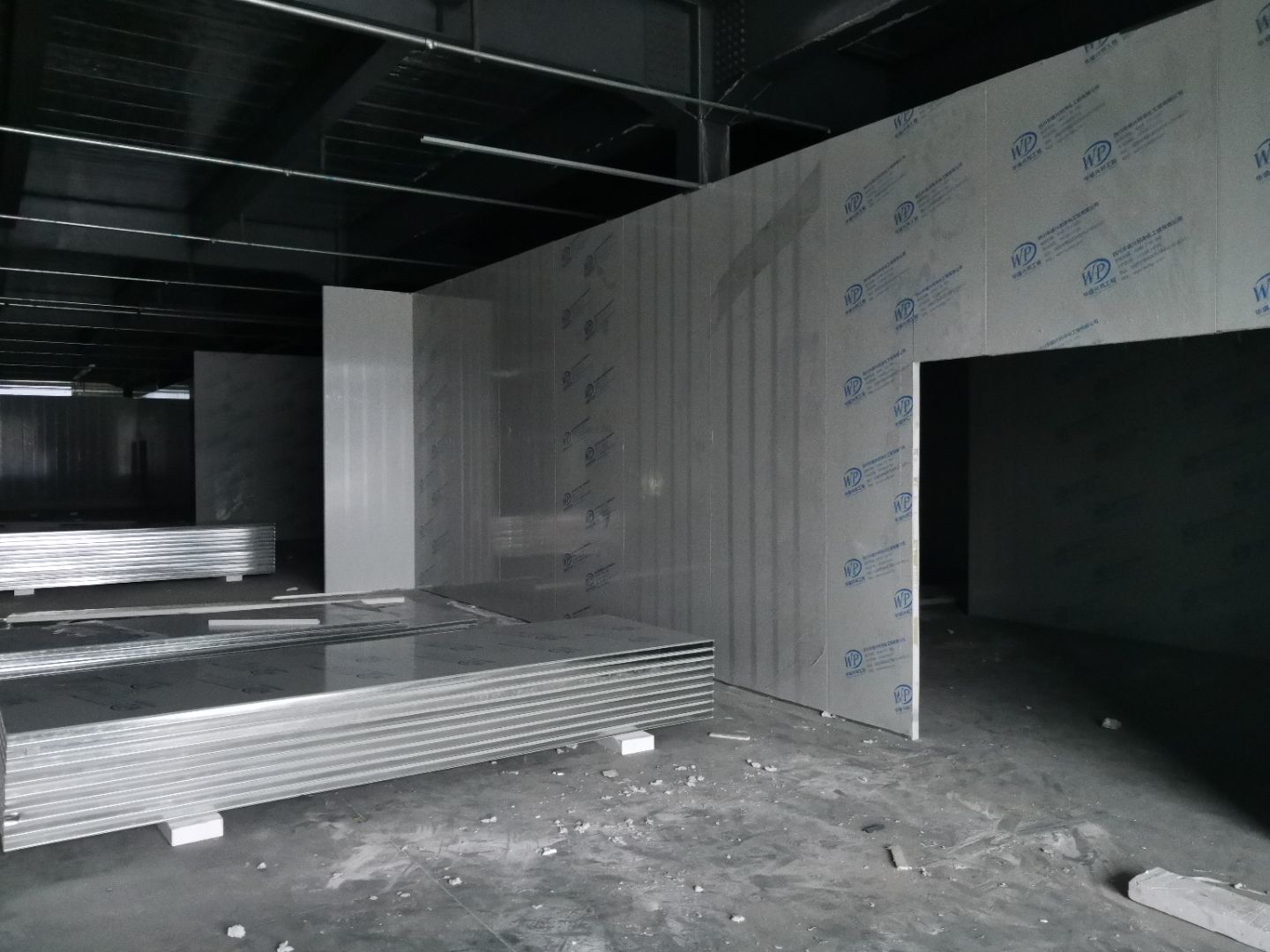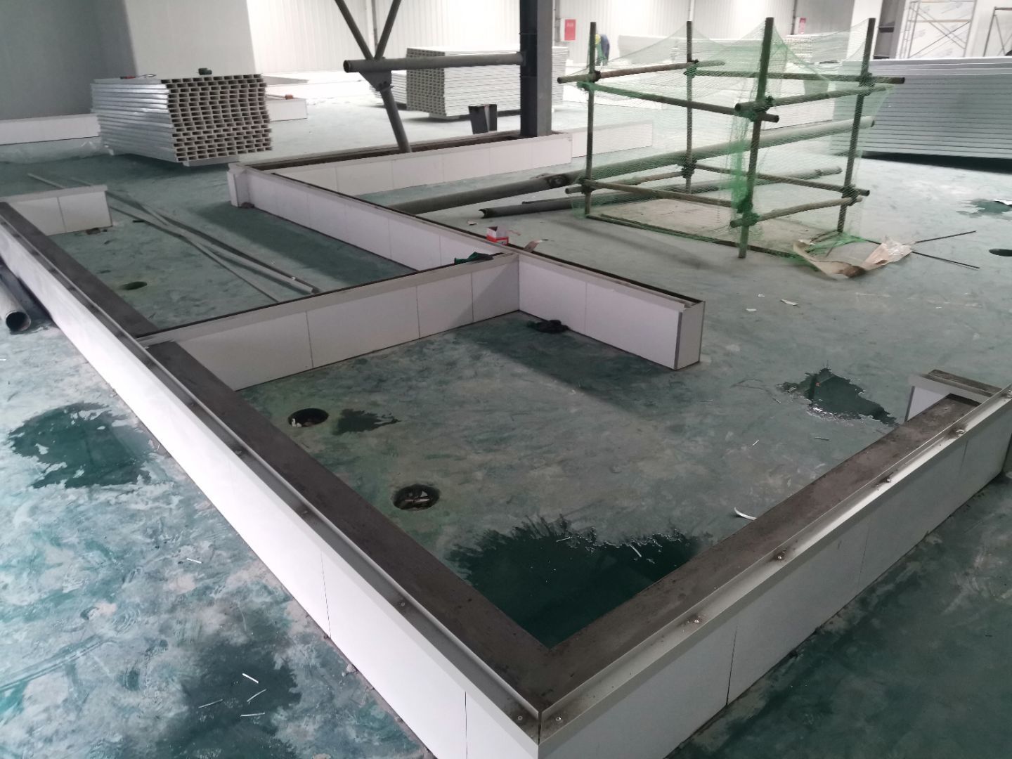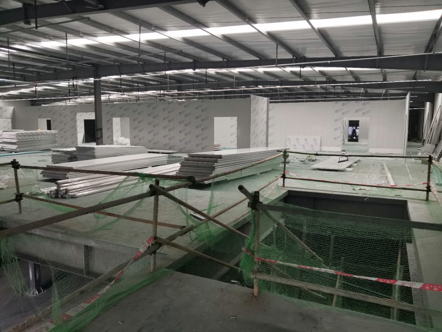 1,一樓預留墻板安裝完成, 2,場地清理基本完成, 3,一樓水電安裝完成50%, 4,主通道墻板等待設備進場。