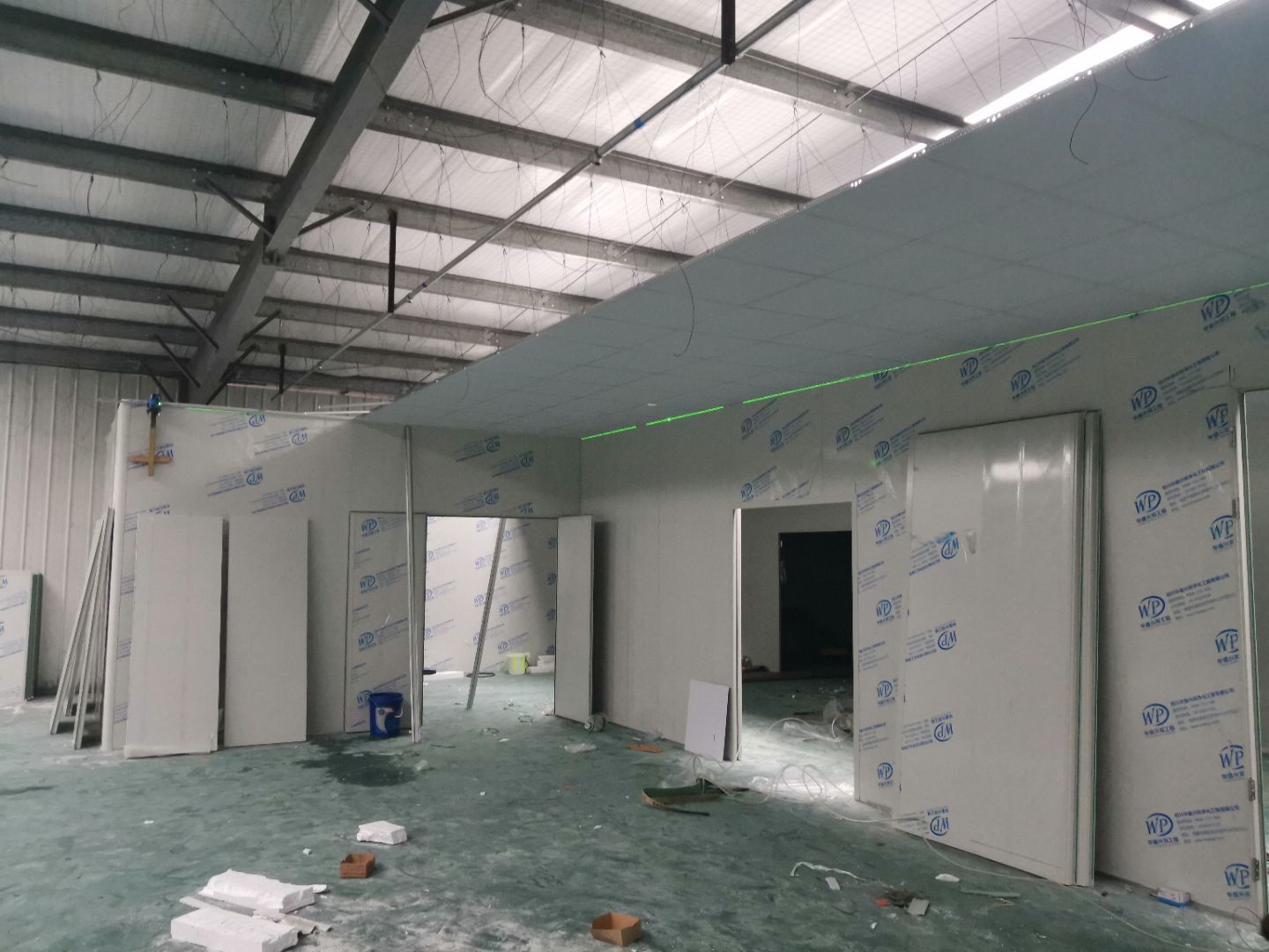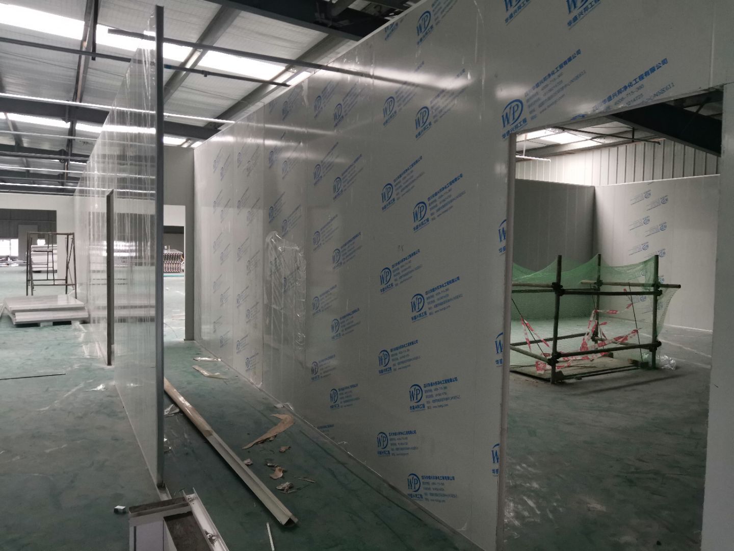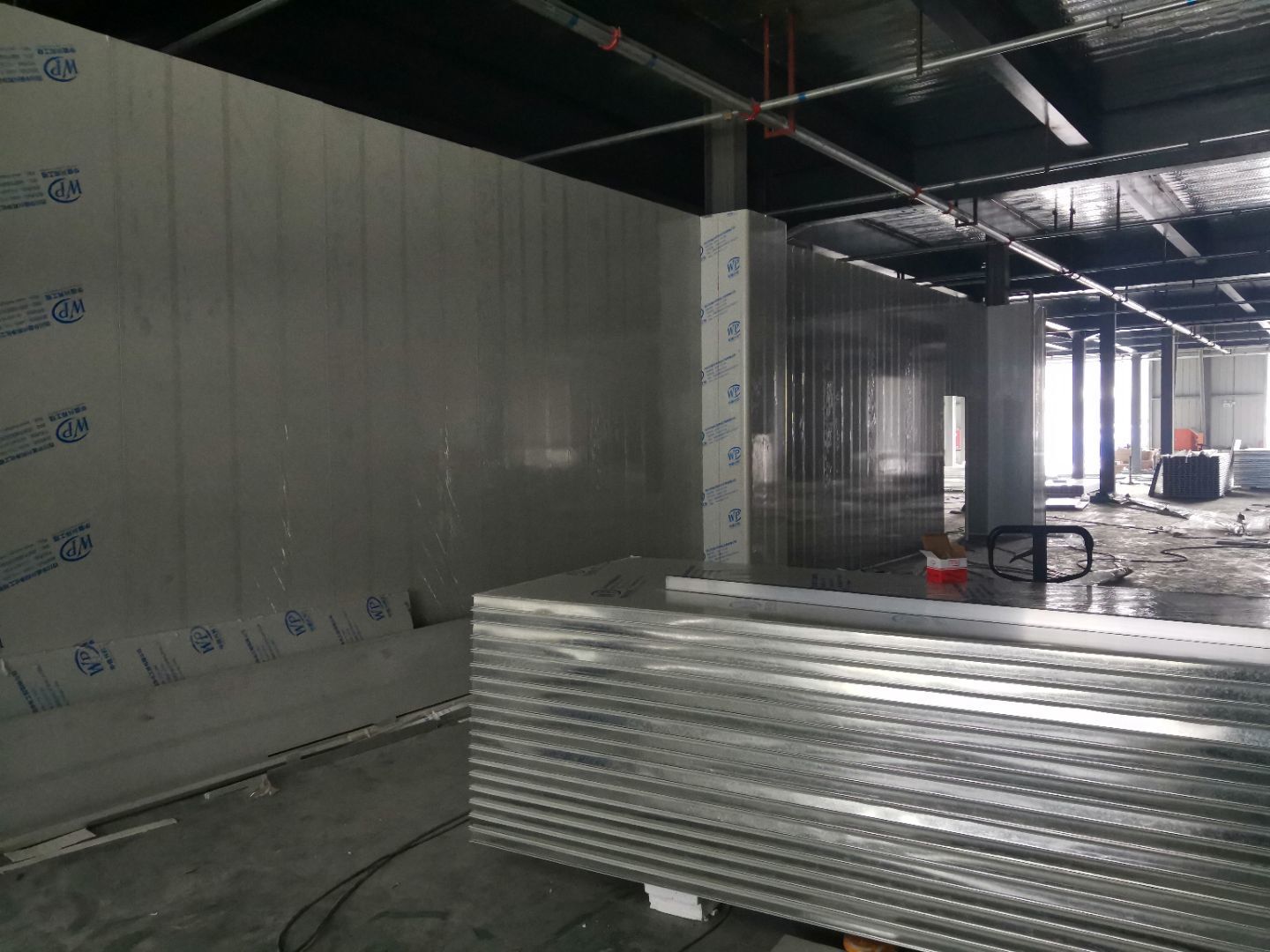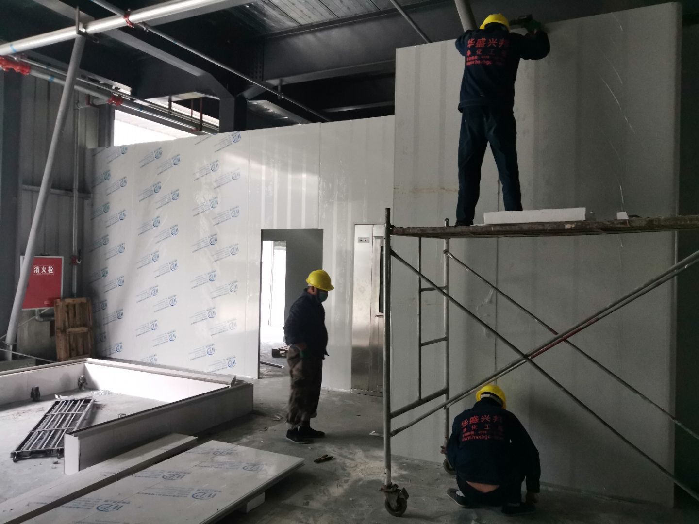 1,風淋室,洗手槽進場安裝完成 2,二樓彩鋼收尾完成95%, 3,二樓彩鋼門預制安裝完95%, 4,三防板二樓完成95%,, 5,二樓水電完成50% 6,一樓墻板完成40%,剩余等待設備進場后安裝。