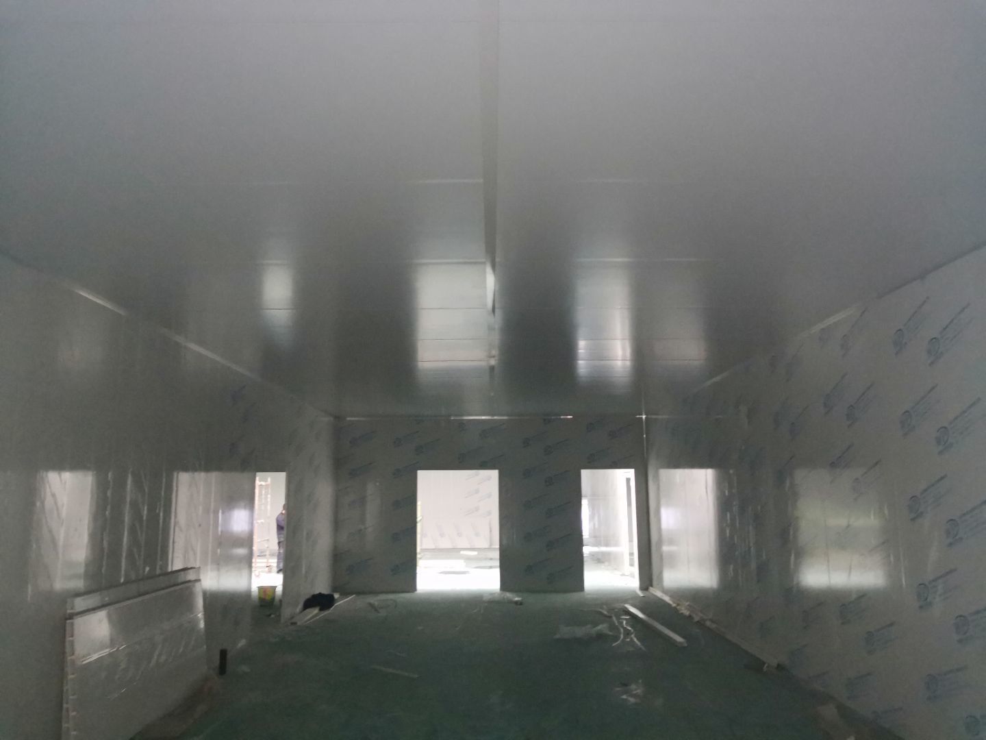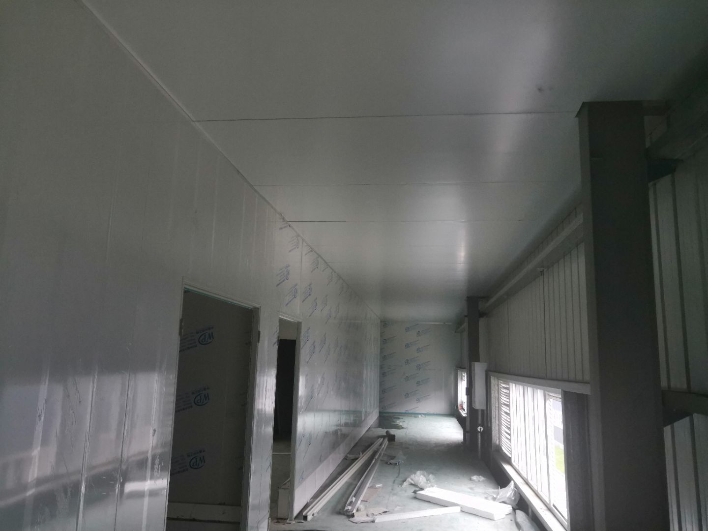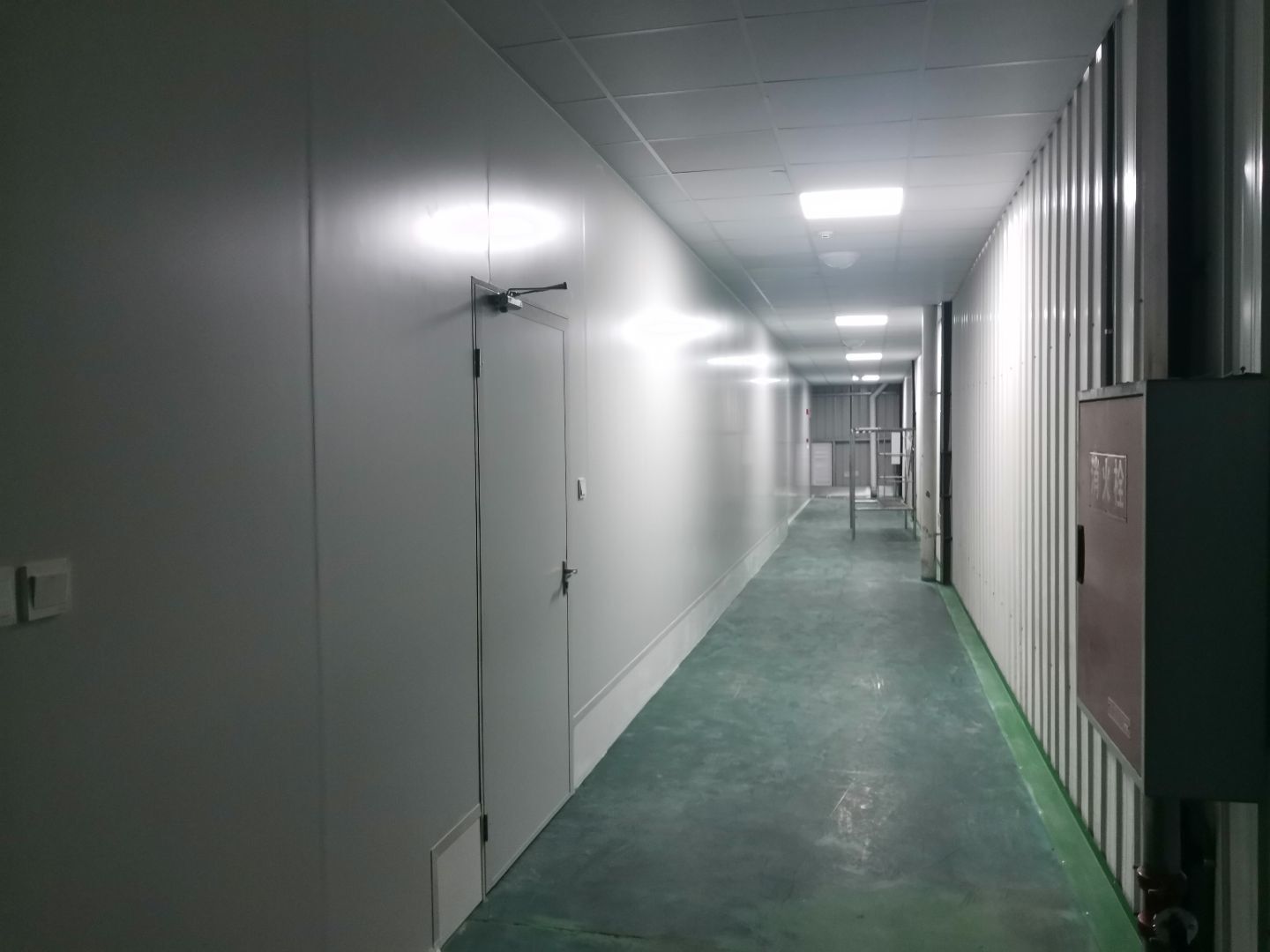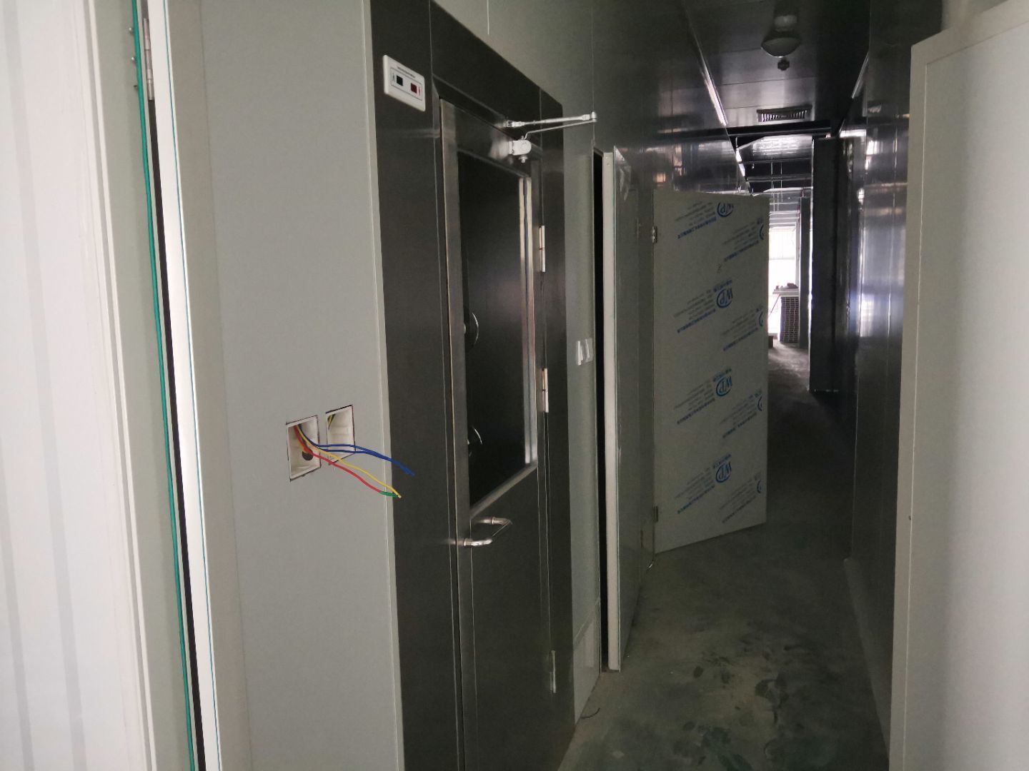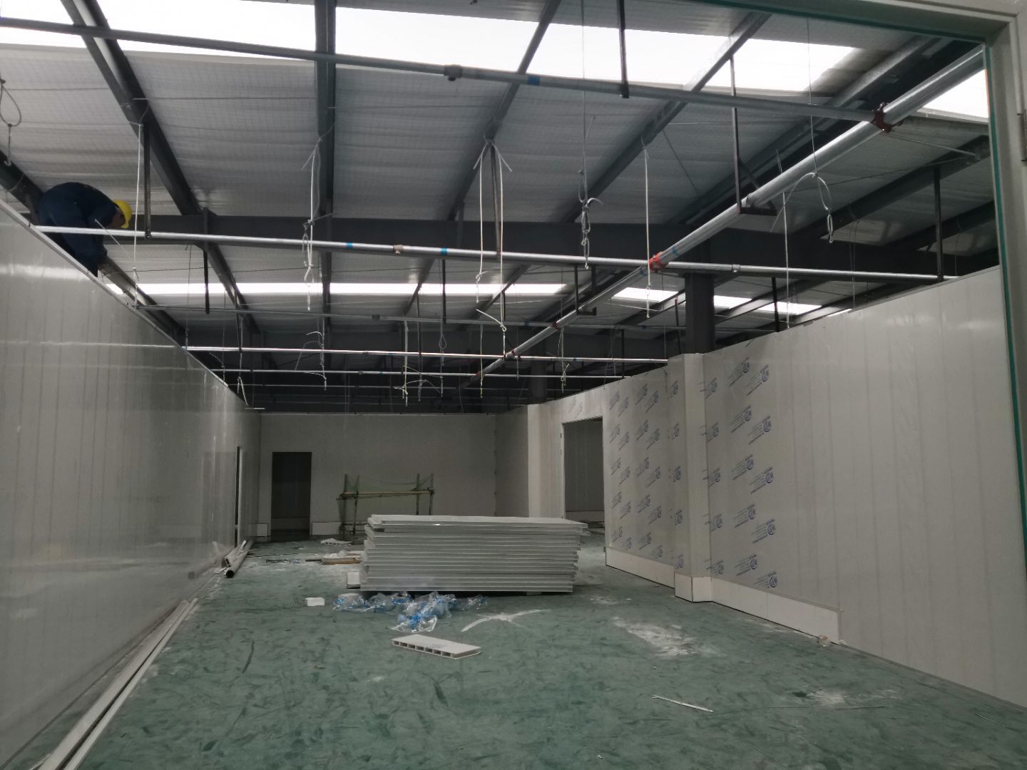 1,風淋室,洗手槽進場安裝完成 2,二樓彩鋼收尾完成95%, 3,二樓彩鋼門預制安裝完95%, 4,三防板二樓完成95%,, 5,二樓水電完成50% 6,一樓墻板完成40%,剩余等待設備進場后安裝。