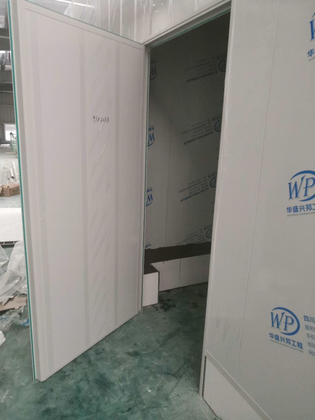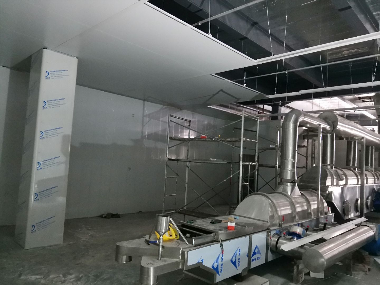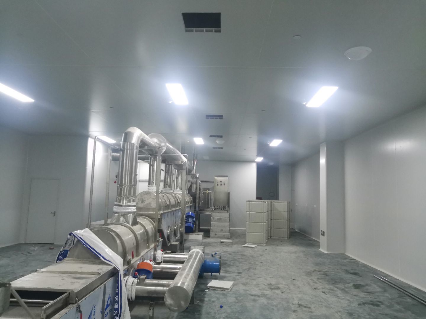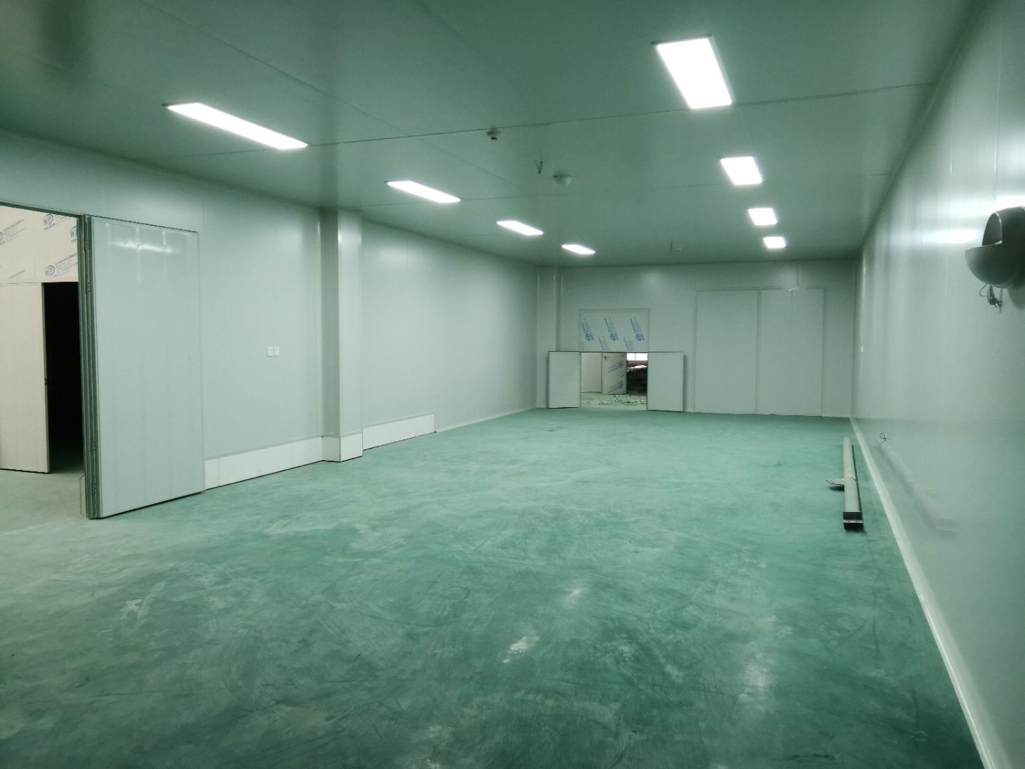 1,風淋室,洗手槽進場安裝完成 2,二樓彩鋼收尾完成95%, 3,二樓彩鋼門預制安裝完95%, 4,三防板二樓完成95%,, 5,二樓水電完成50% 6,一樓墻板完成40%,剩余等待設備進場后安裝。