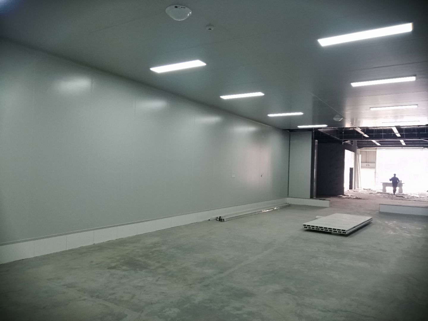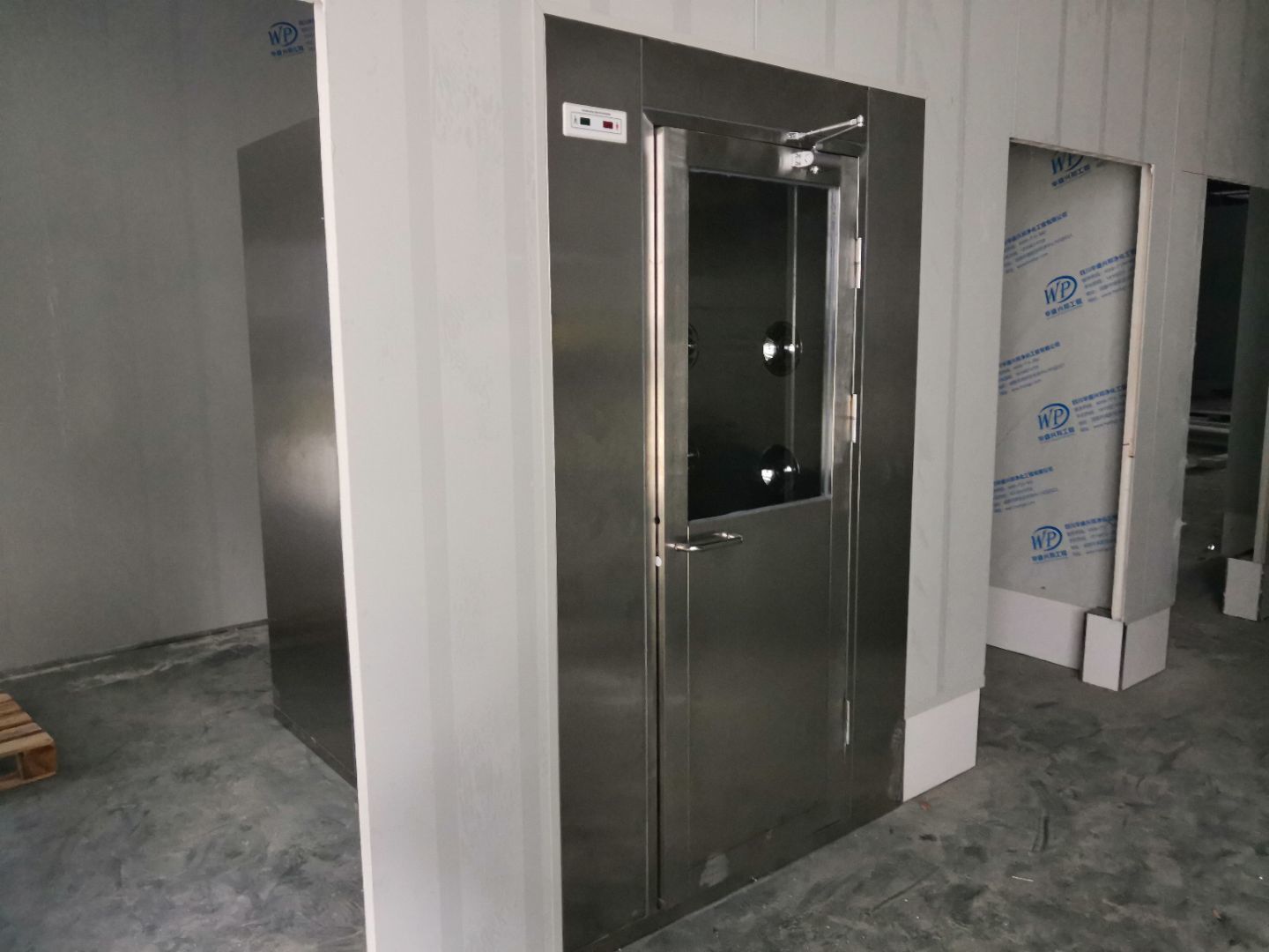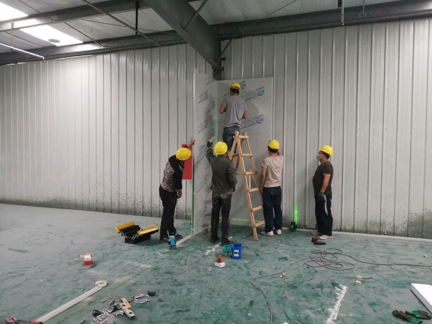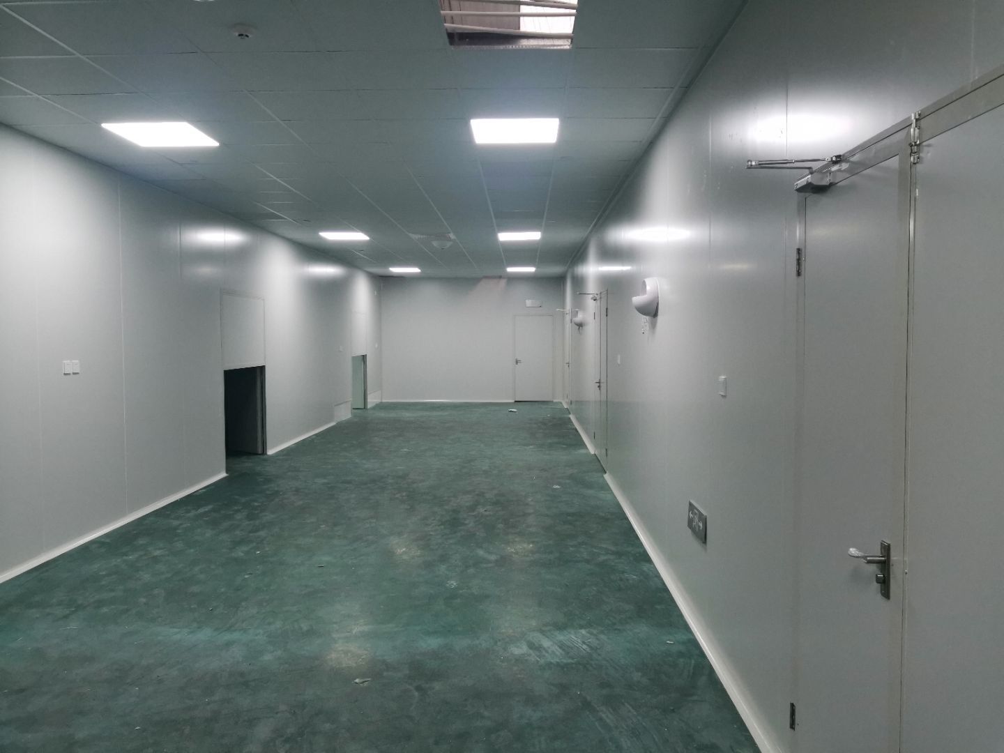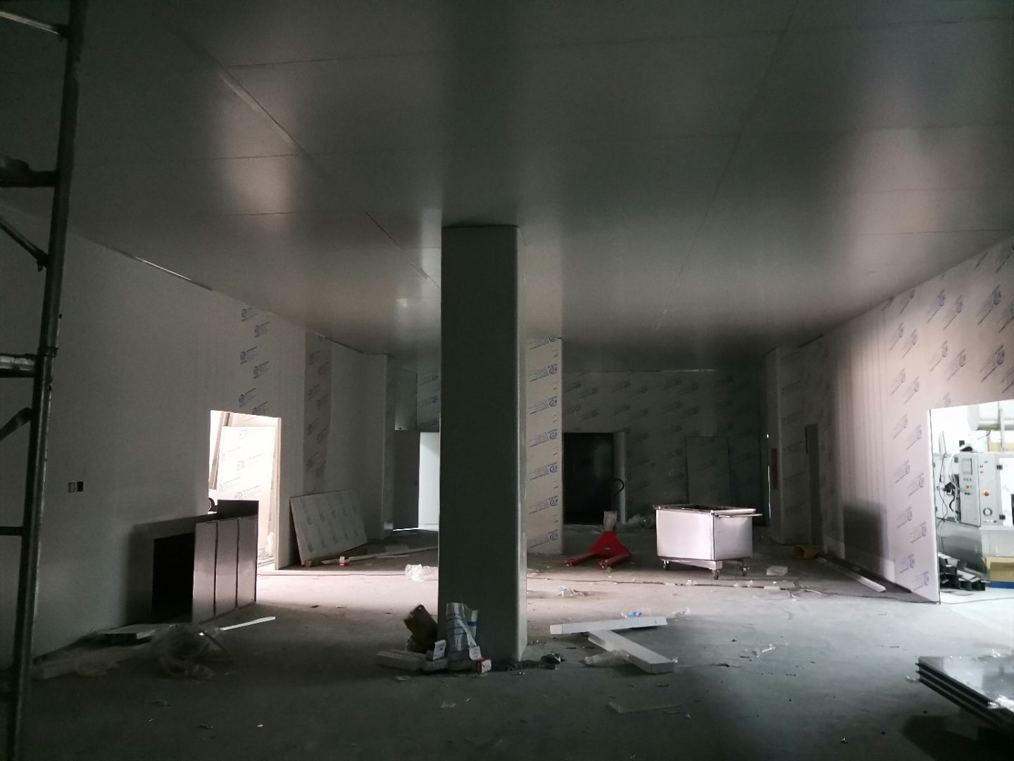 1,風淋室,洗手槽進場安裝完成 2,二樓彩鋼收尾完成95%, 3,二樓彩鋼門預制安裝完95%, 4,三防板二樓完成95%,, 5,二樓水電完成50% 6,一樓墻板完成40%,剩余等待設備進場后安裝。