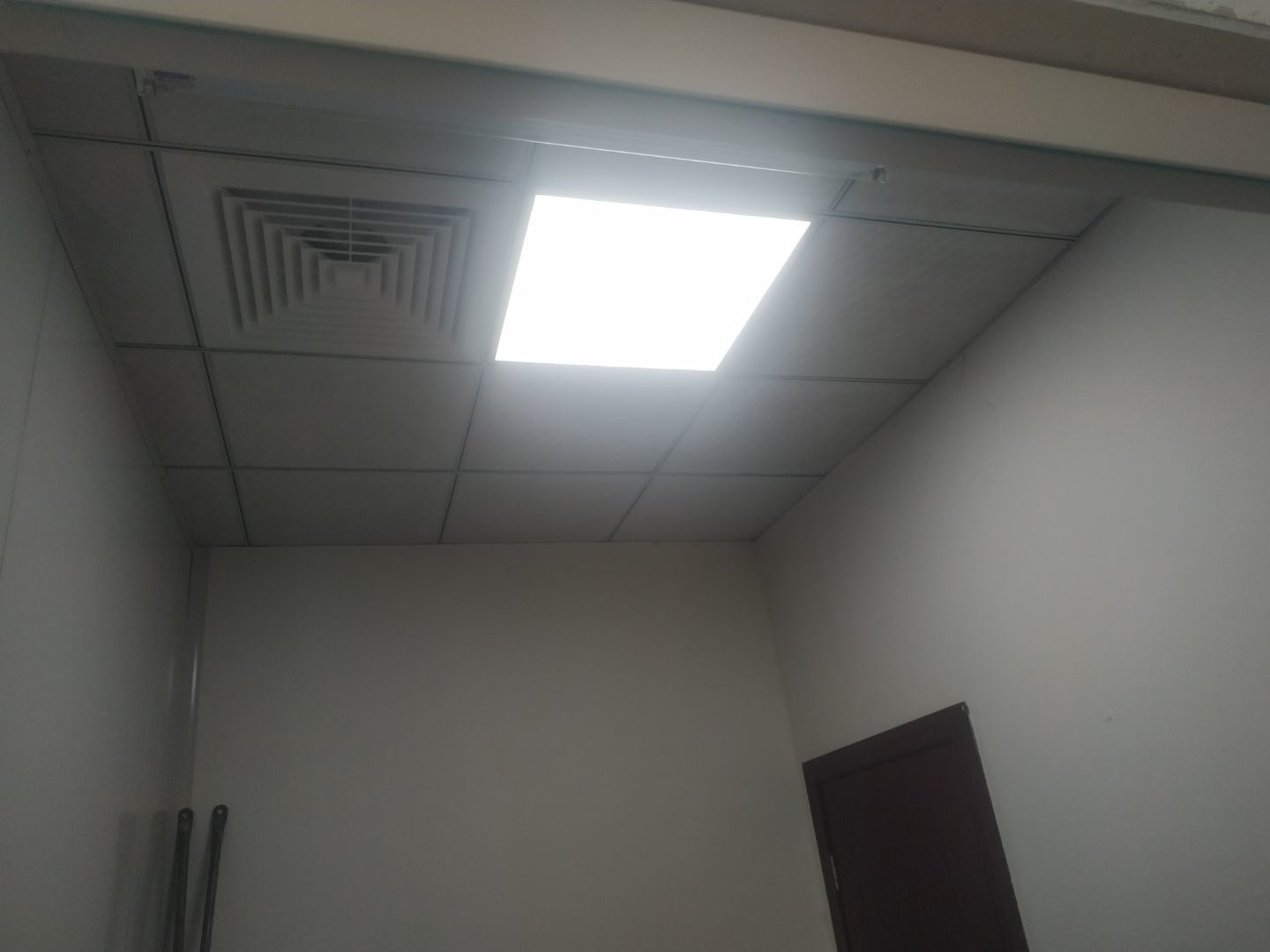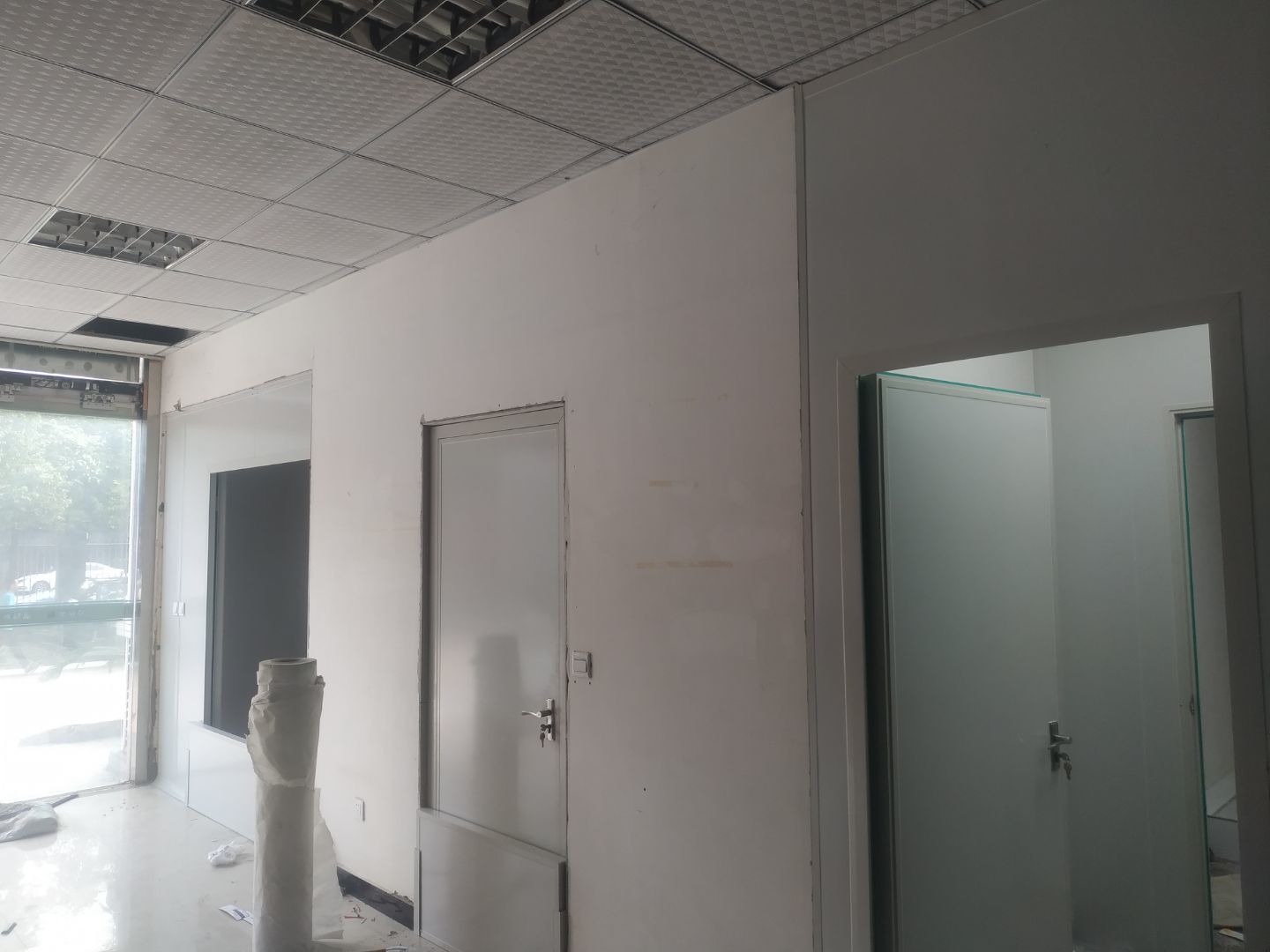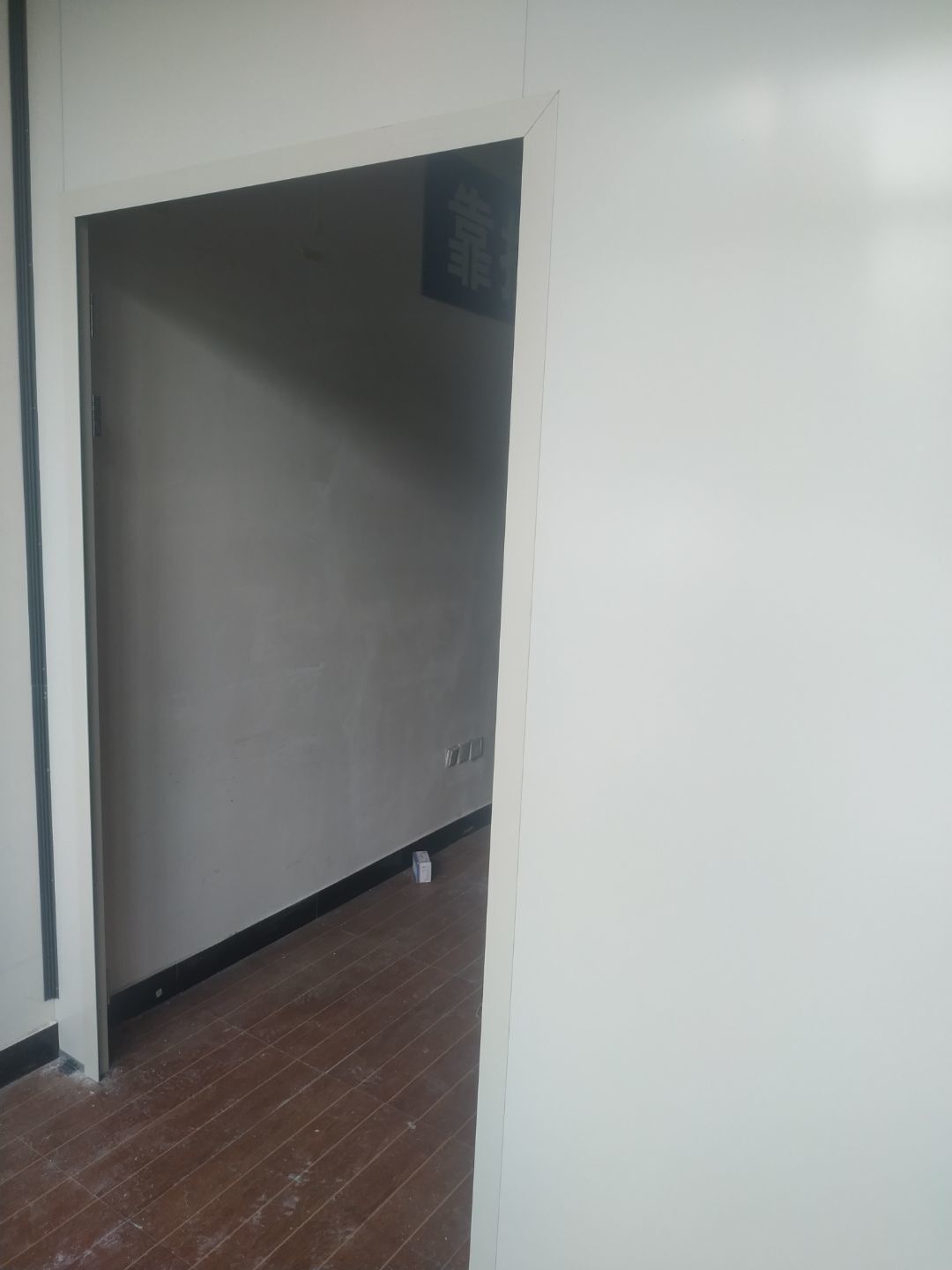 1.門安裝完成,擋鼠板安裝完成,彩鋼收尾結束。2.照明燈換氣扇安裝完成95%,紫外線燈安裝完成,插座安裝完成。