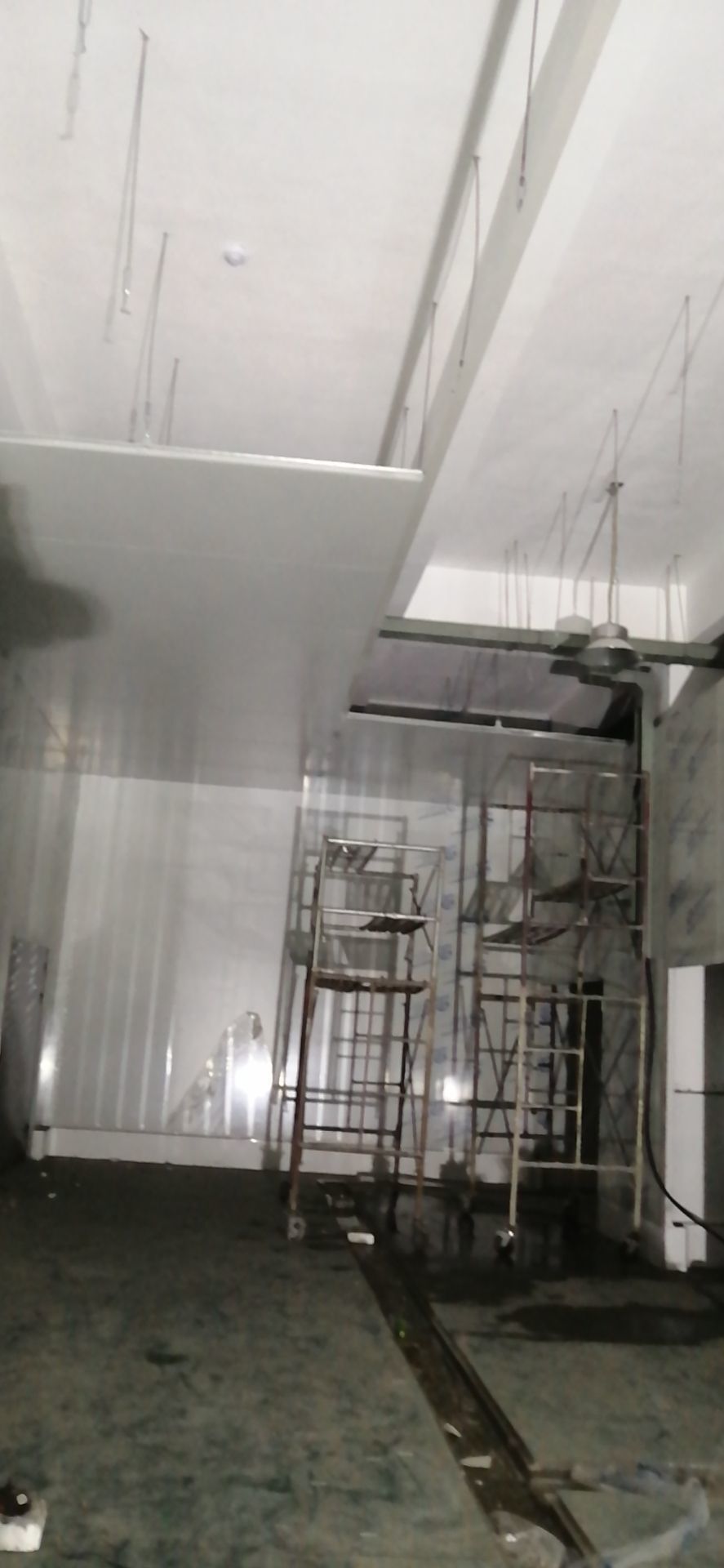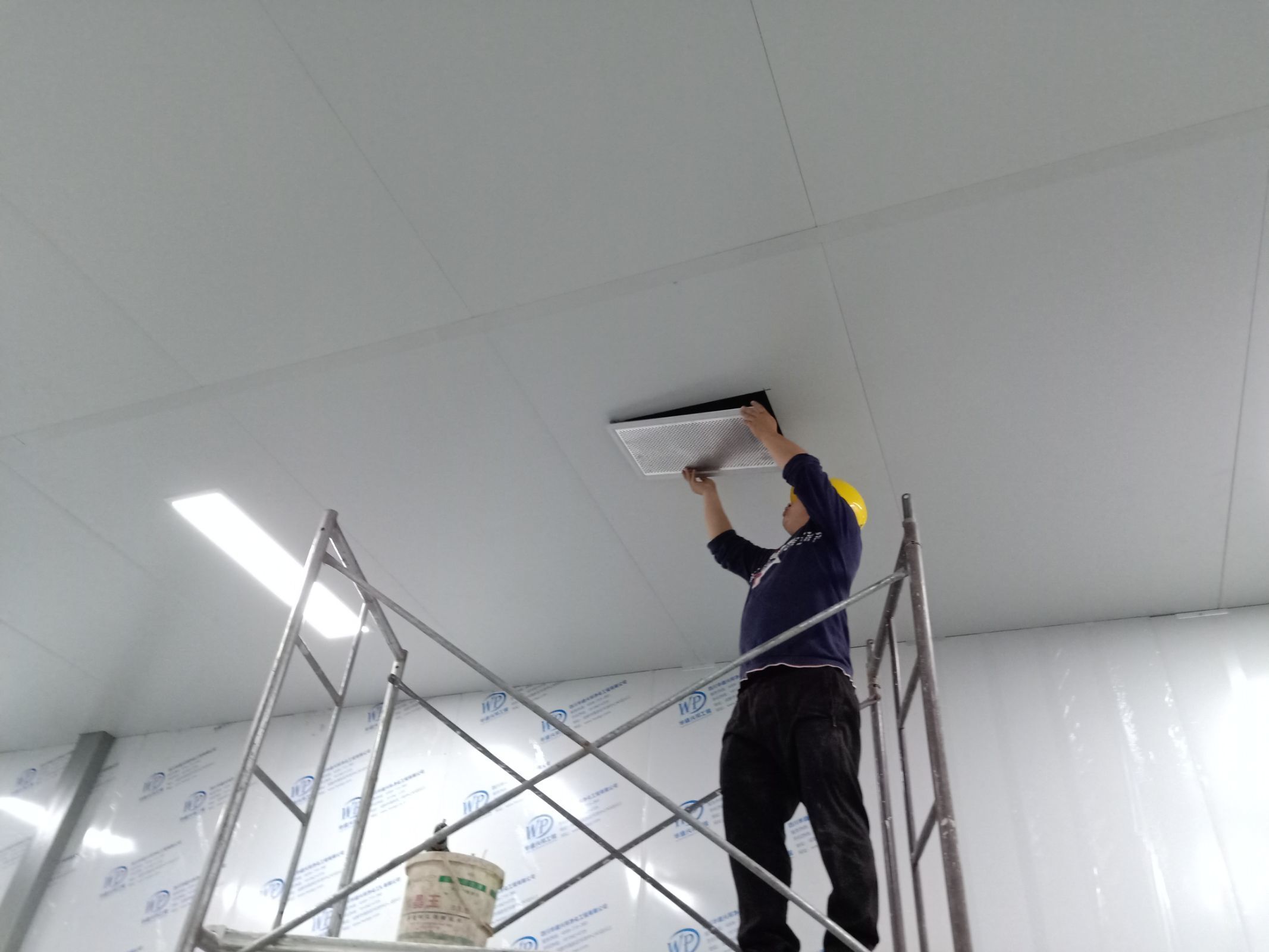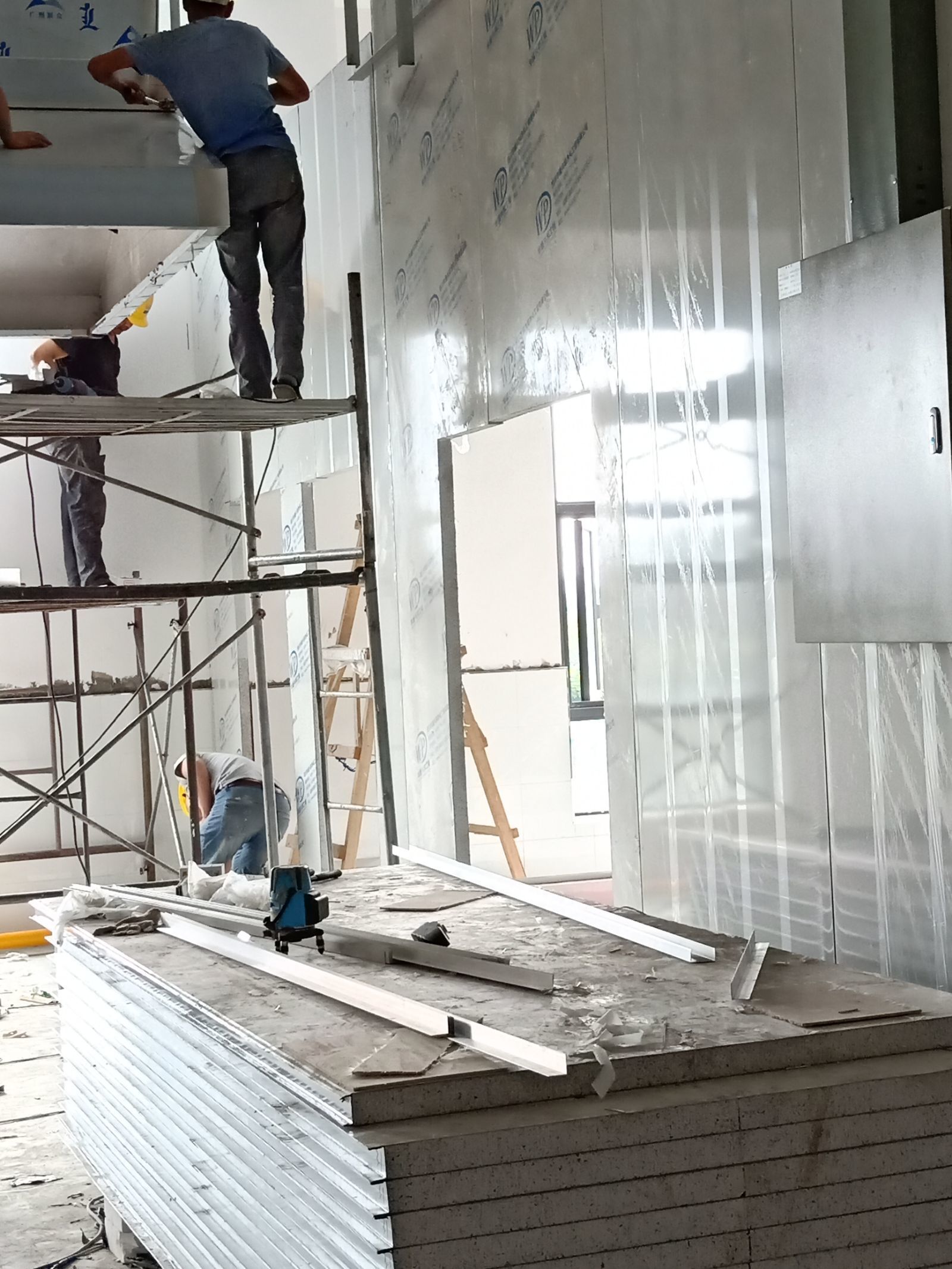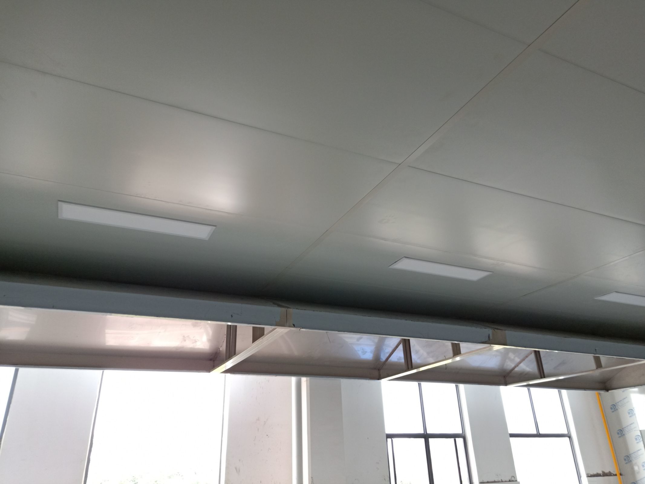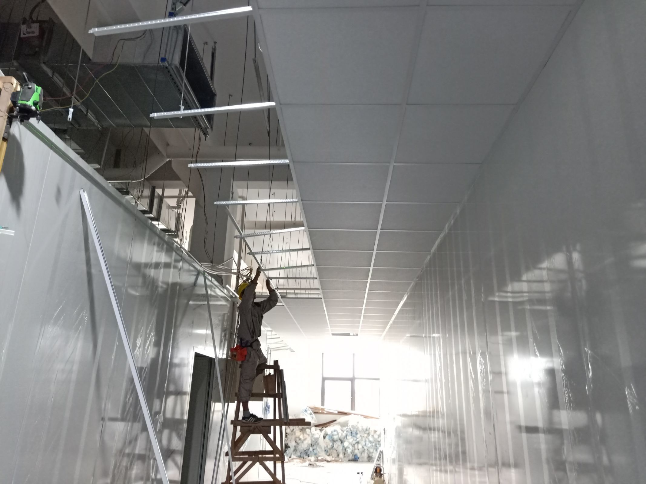 1.三防板吊頂材料到場。 2.彩鋼板吊頂材料到場,吊上樓。 3.彩鋼板吊頂完成百分之五。 4.線盒開孔完成百分之六十。 5.墻磚鋪貼完成百分之八五。 6.污水池砌磚完成百分之六十。