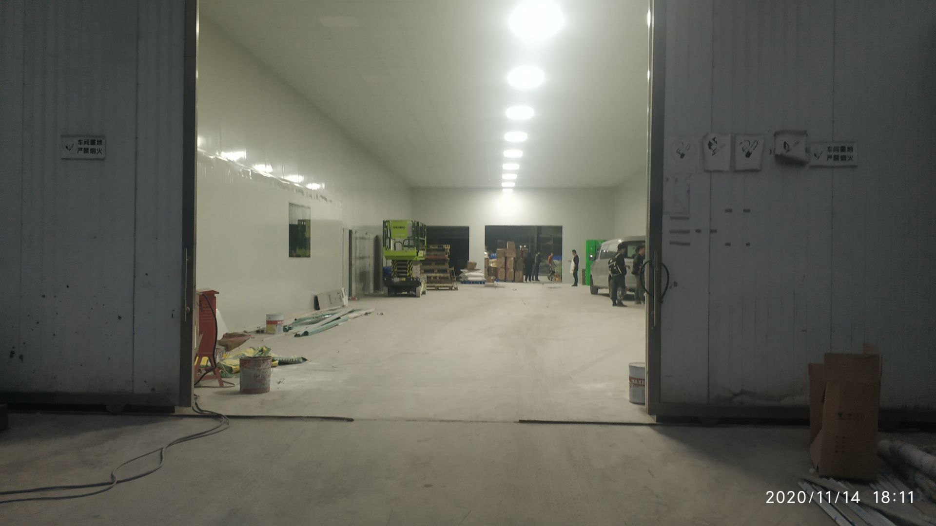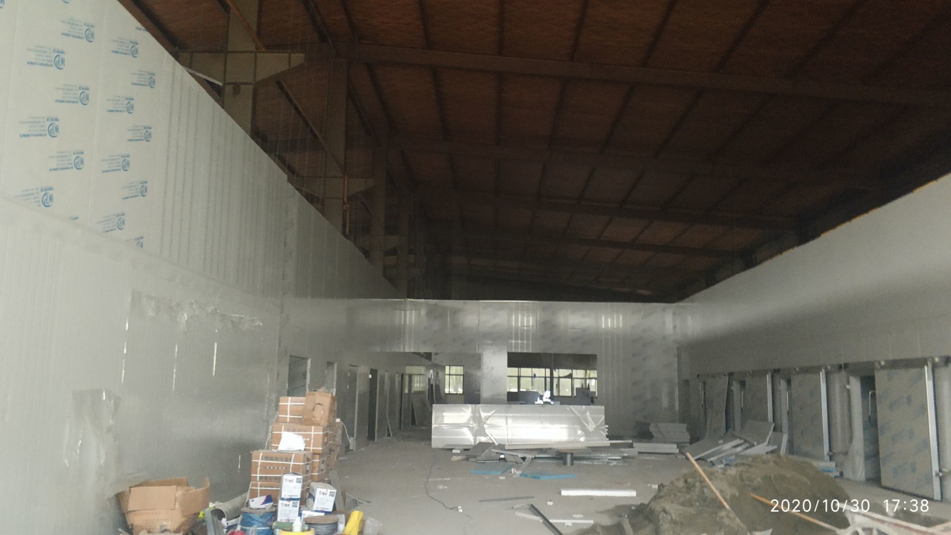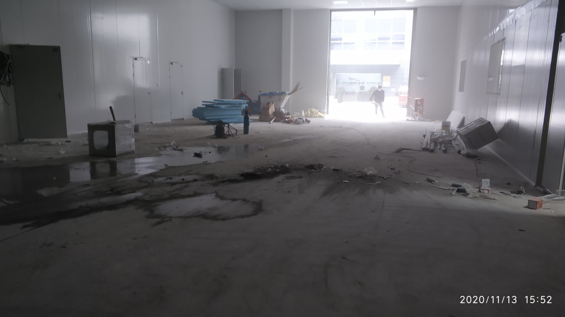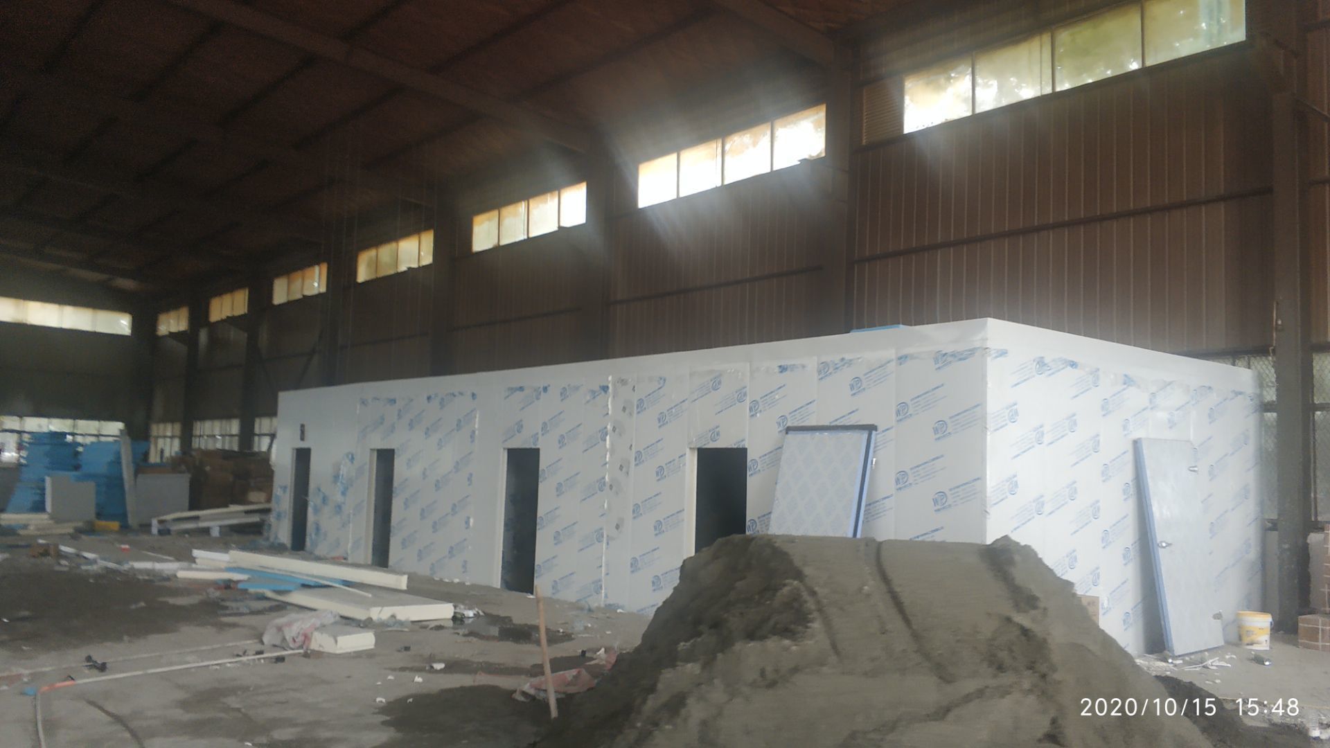 1.地面打磨完成分揀區域和后勤庫房。2.彩鋼組收邊收口,安裝門完成百分之八十。3.照明插座布線安裝完成百分之八十五。 4.凍庫內機組安裝完成。 5.卷簾門安裝完成。