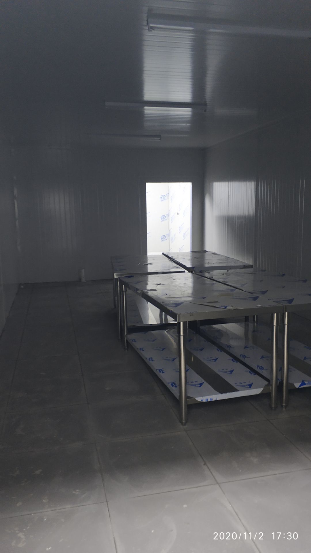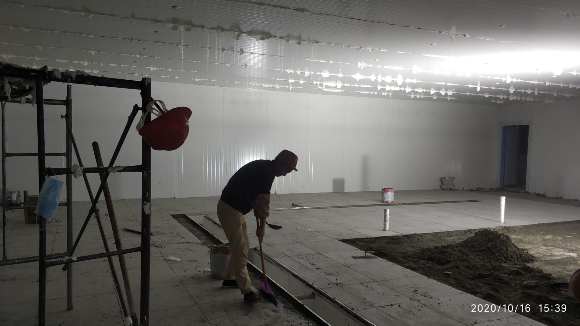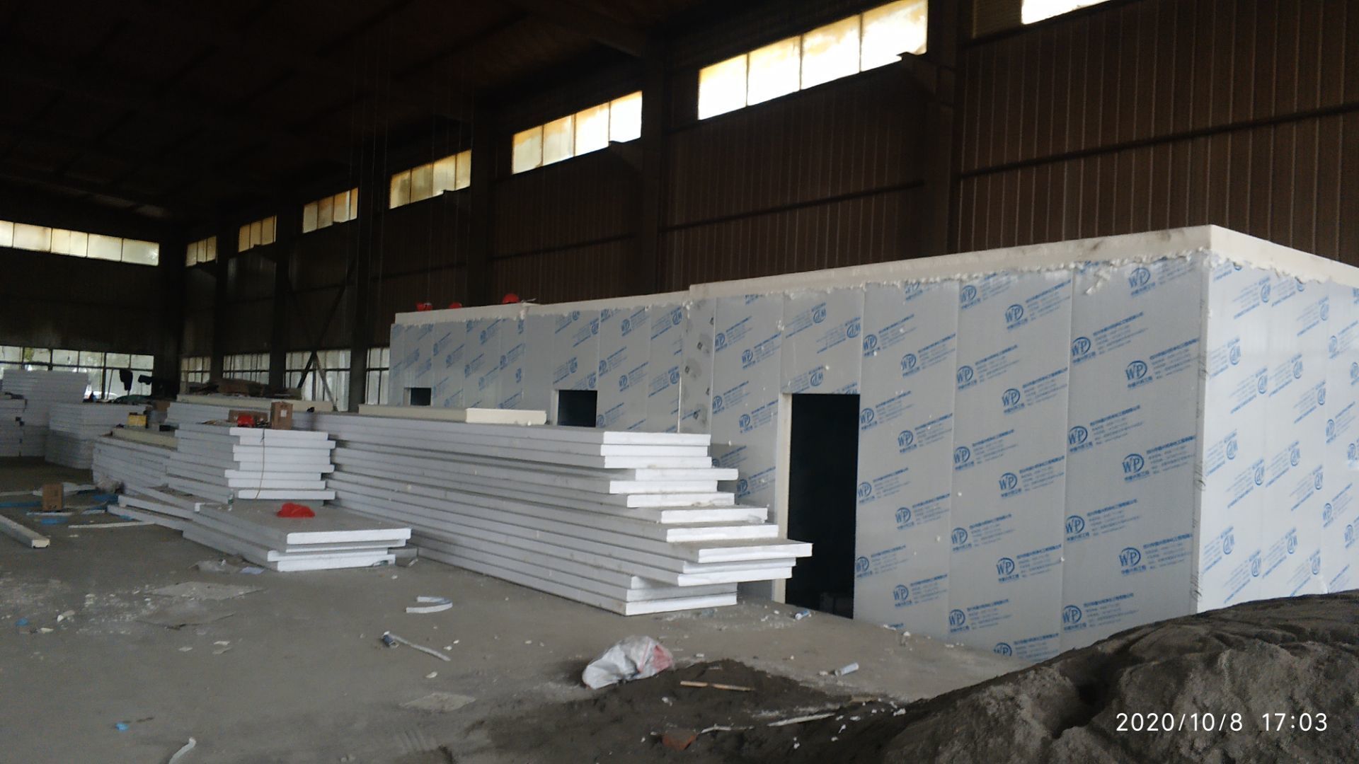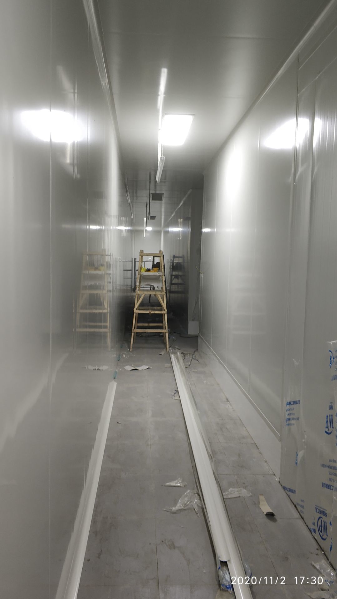1.地面打磨完成分揀區域和后勤庫房。2.彩鋼組收邊收口,安裝門完成百分之八十。3.照明插座布線安裝完成百分之八十五。 4.凍庫內機組安裝完成。 5.卷簾門安裝完成。