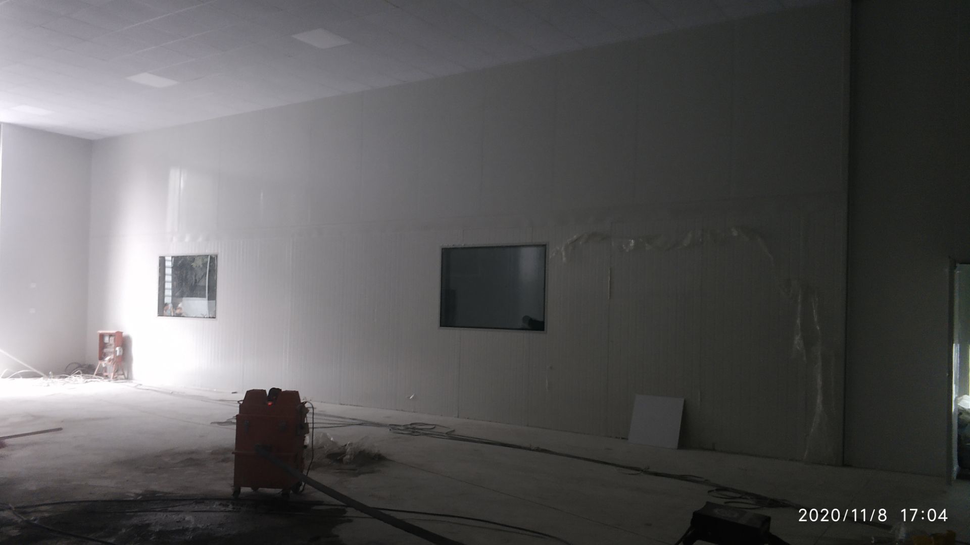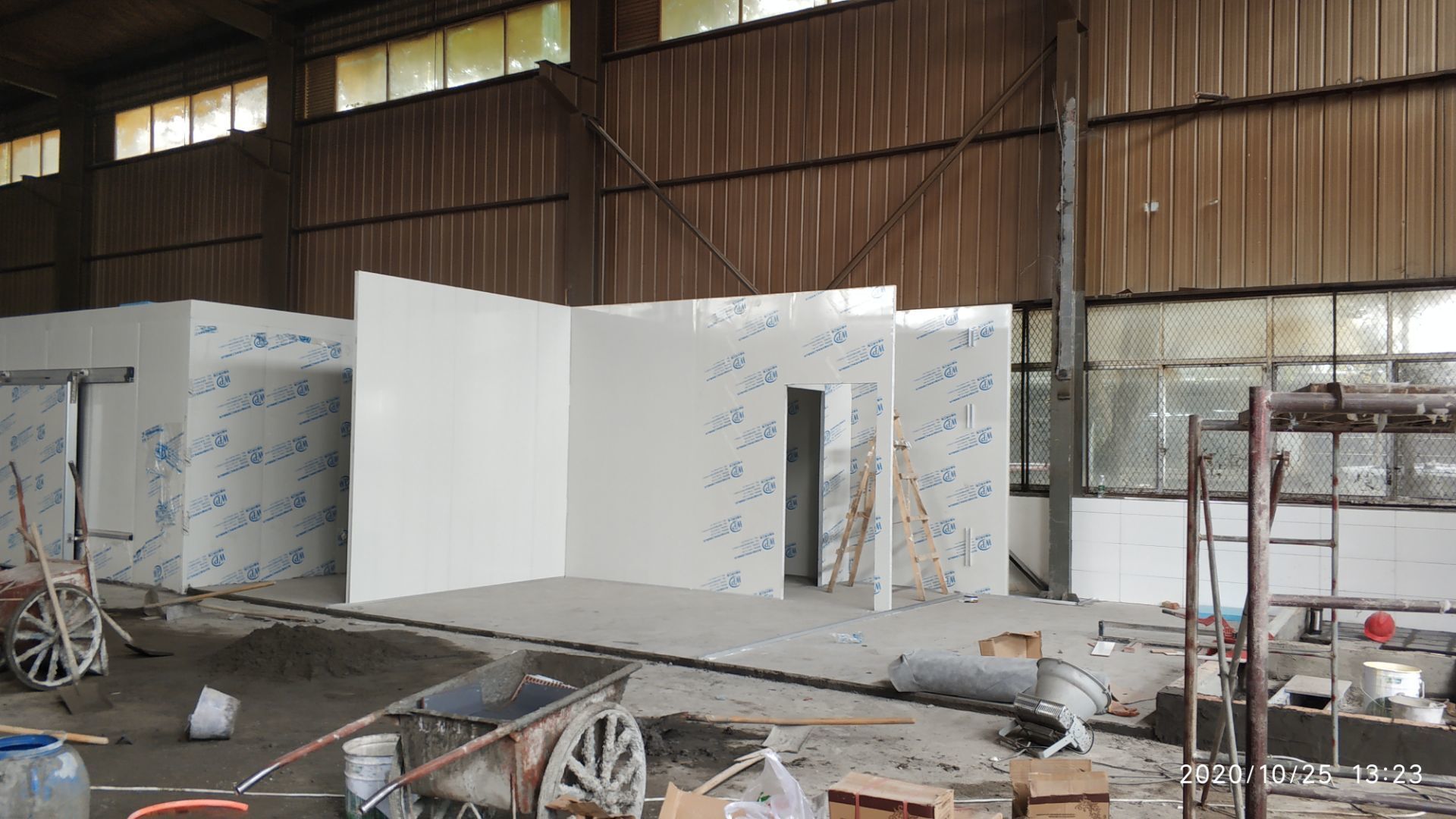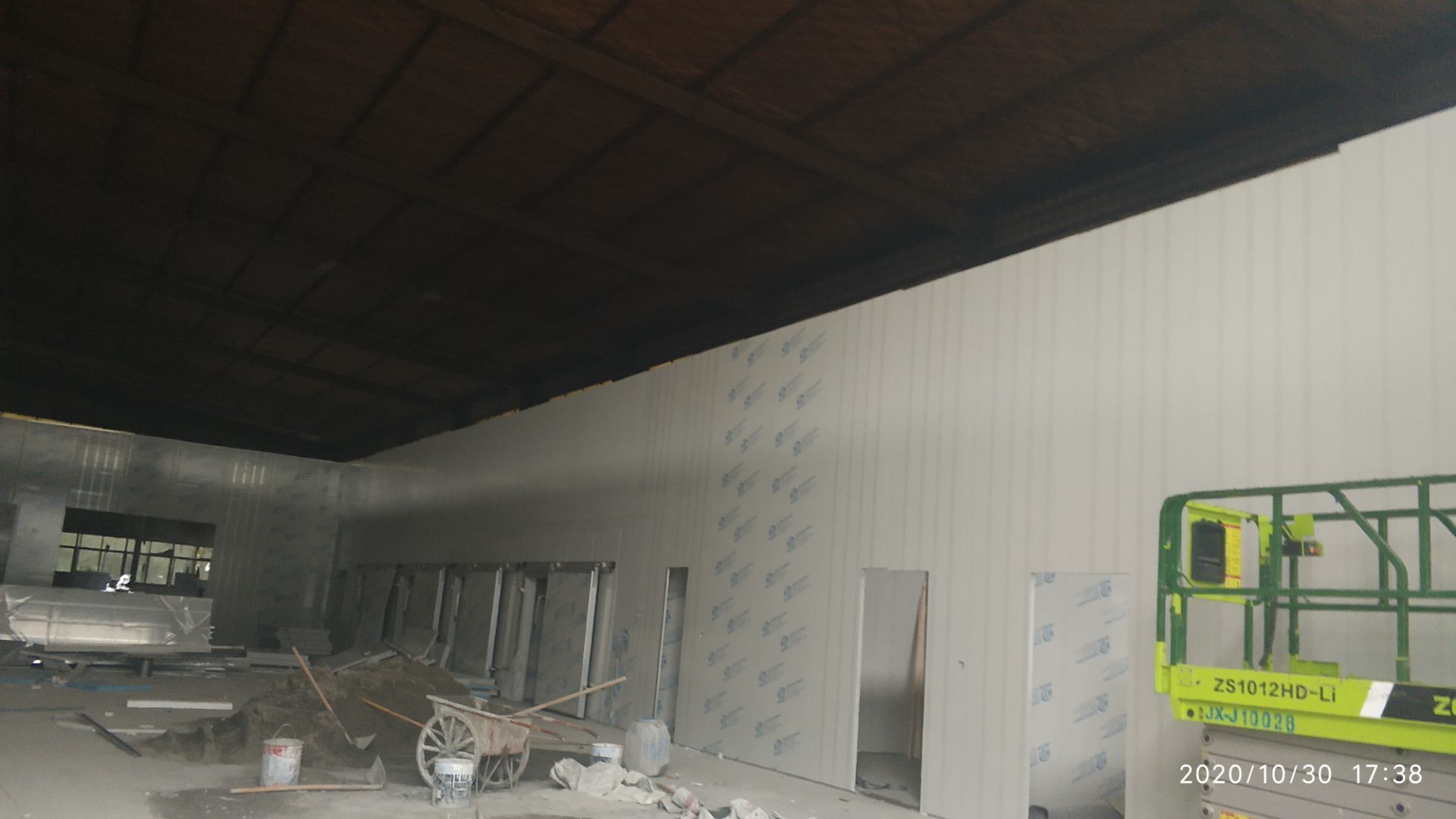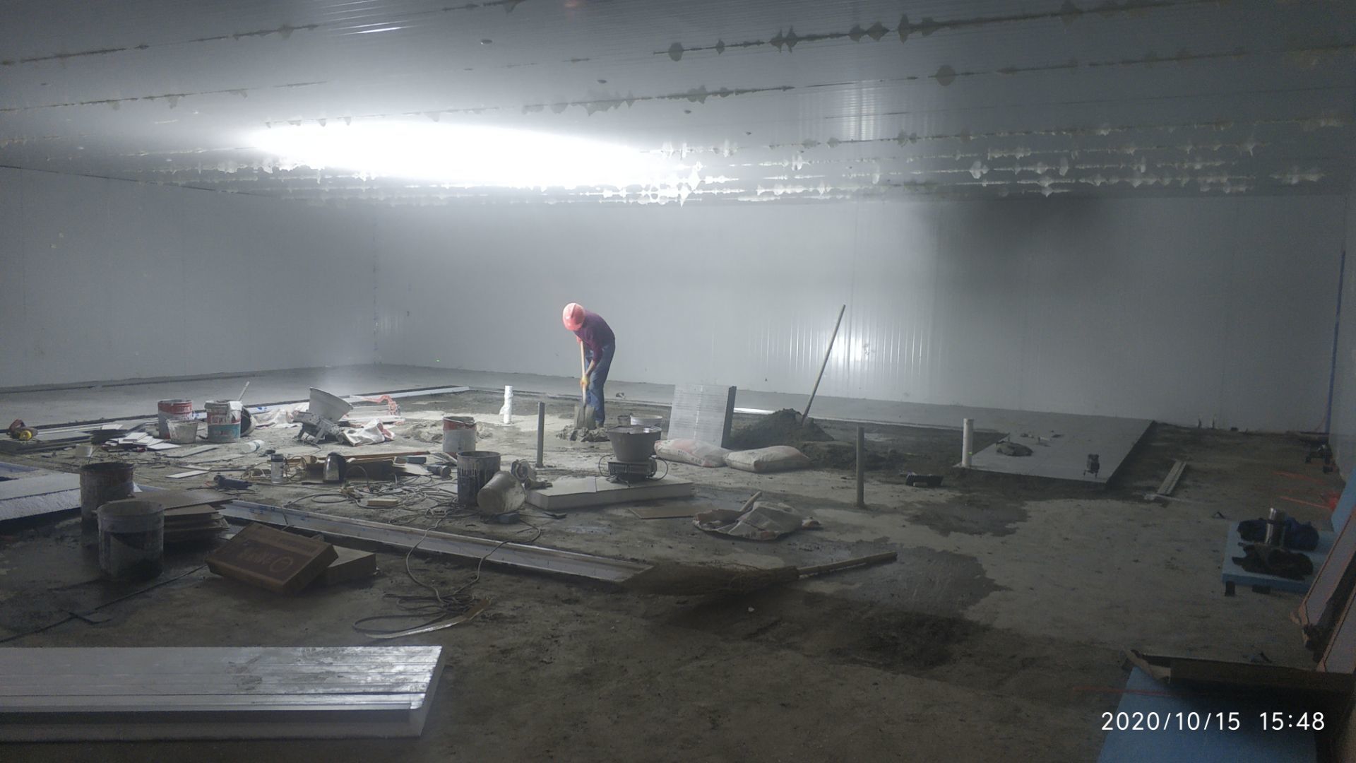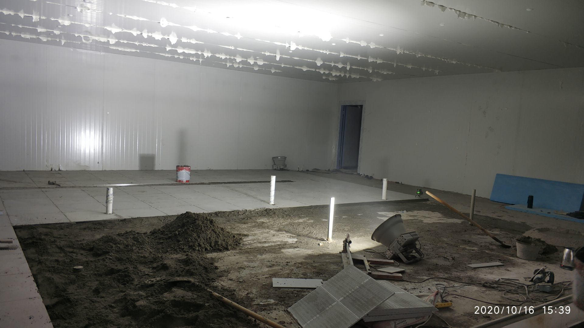 1.地面打磨完成分揀區域和后勤庫房。2.彩鋼組收邊收口,安裝門完成百分之八十。3.照明插座布線安裝完成百分之八十五。 4.凍庫內機組安裝完成。 5.卷簾門安裝完成。