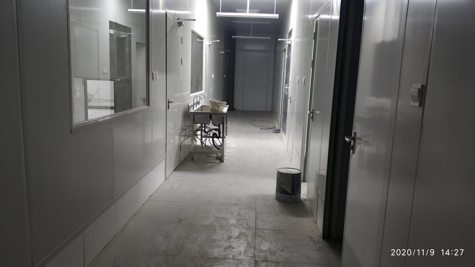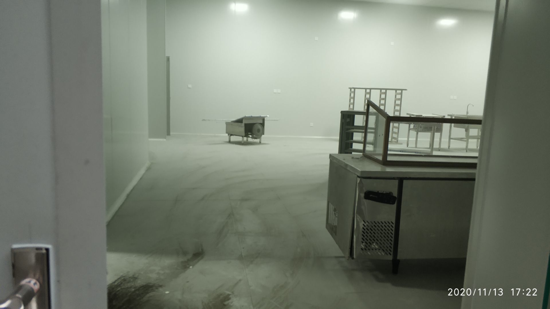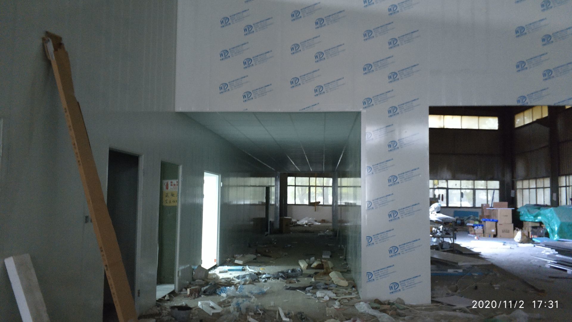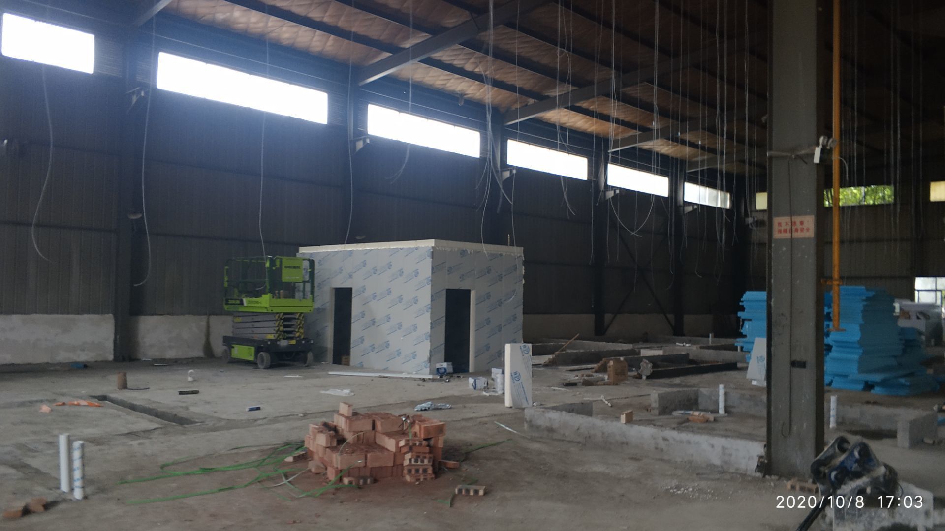 1.地面打磨完成分揀區域和后勤庫房。2.彩鋼組收邊收口,安裝門完成百分之八十。3.照明插座布線安裝完成百分之八十五。 4.凍庫內機組安裝完成。 5.卷簾門安裝完成。