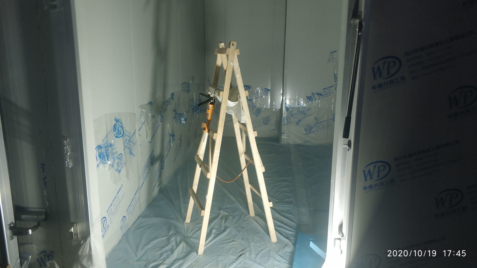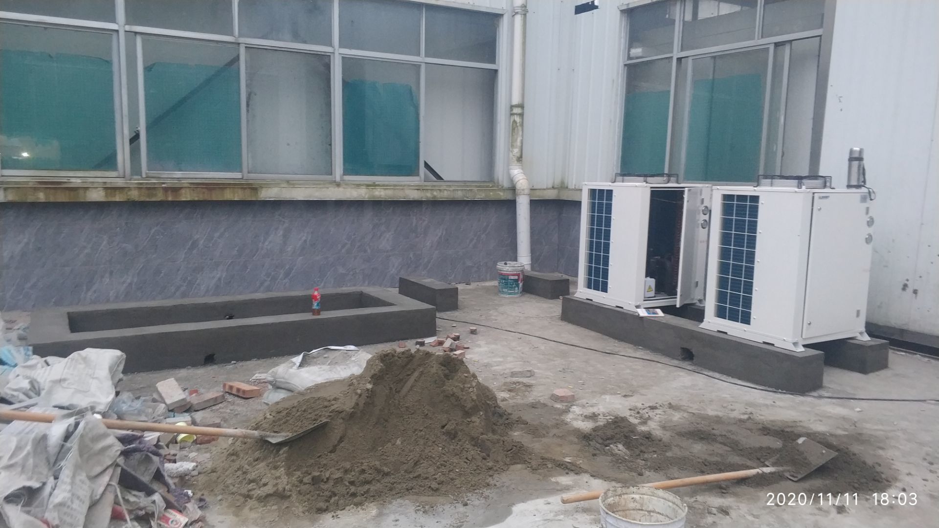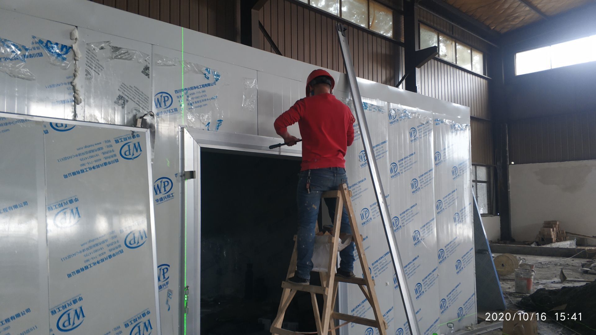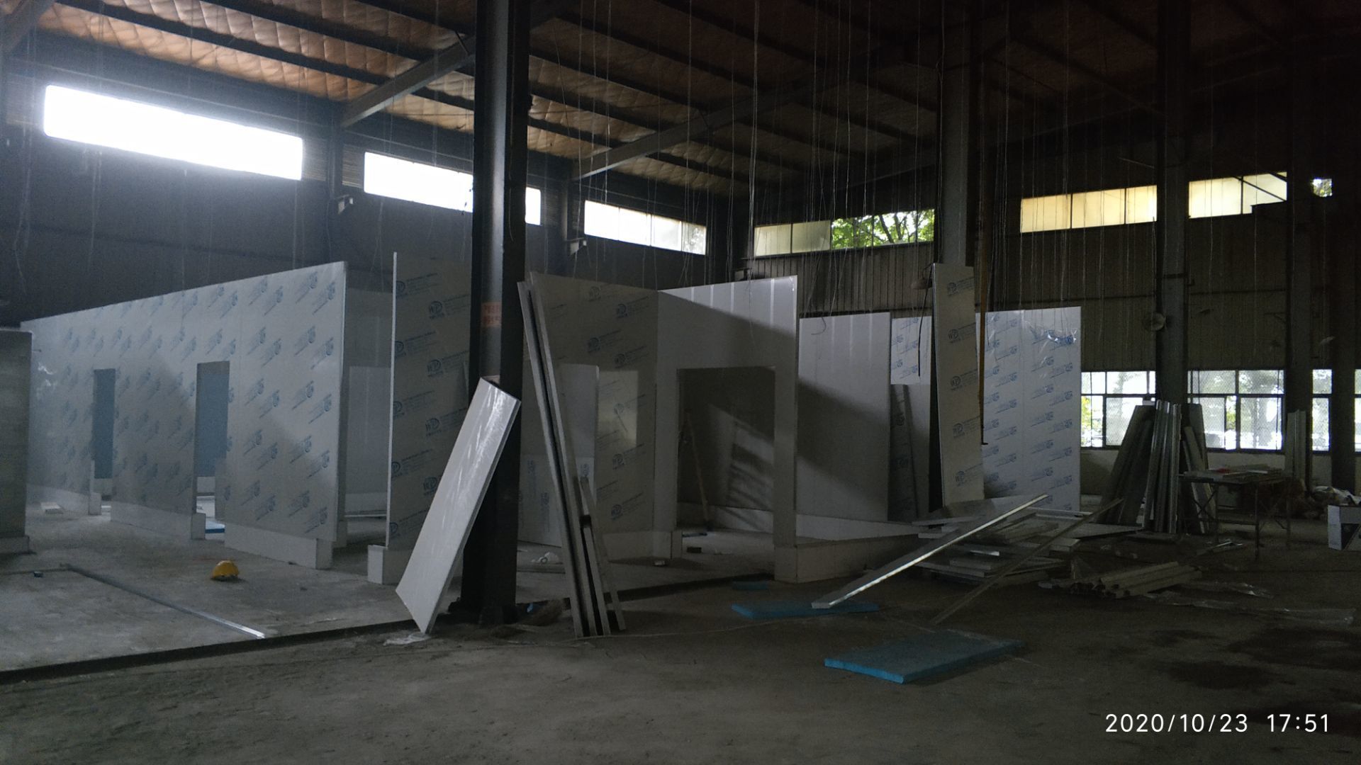 1.地面打磨完成分揀區域和后勤庫房。2.彩鋼組收邊收口,安裝門完成百分之八十。3.照明插座布線安裝完成百分之八十五。 4.凍庫內機組安裝完成。 5.卷簾門安裝完成。