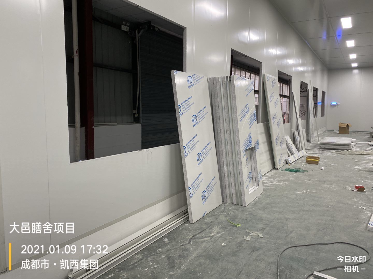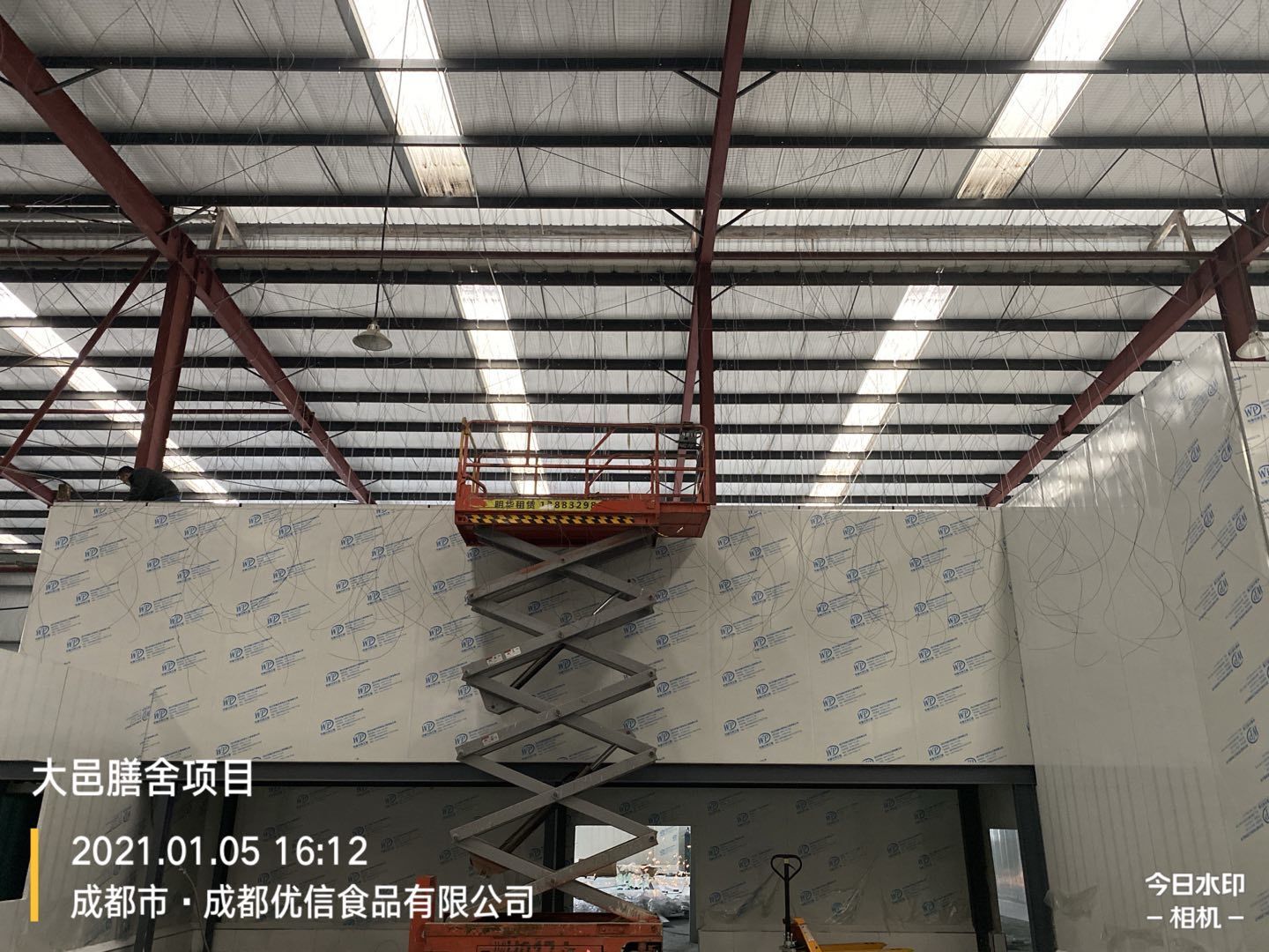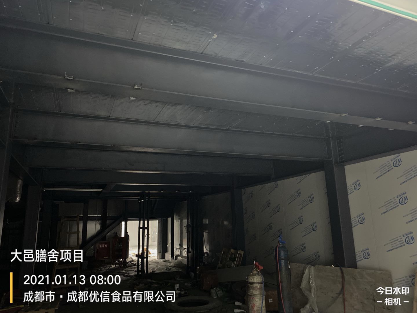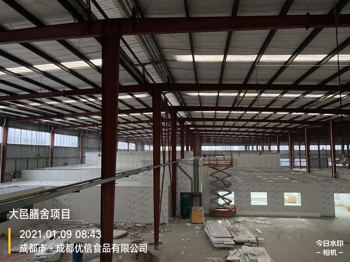 大邑膳舍食品項(xiàng)目:擋水墻貼磚完成90%,花紋鋼板、樓梯板到場(chǎng),樓梯踏步開始焊接,彩鋼墻板立板完成5%。
