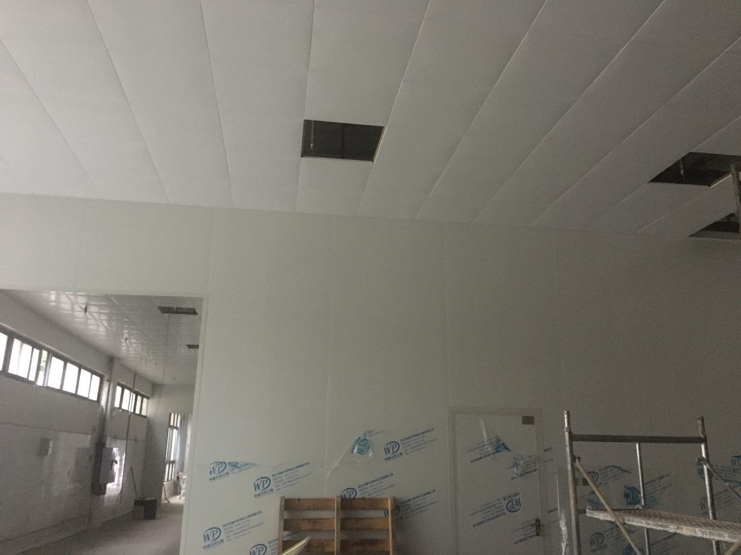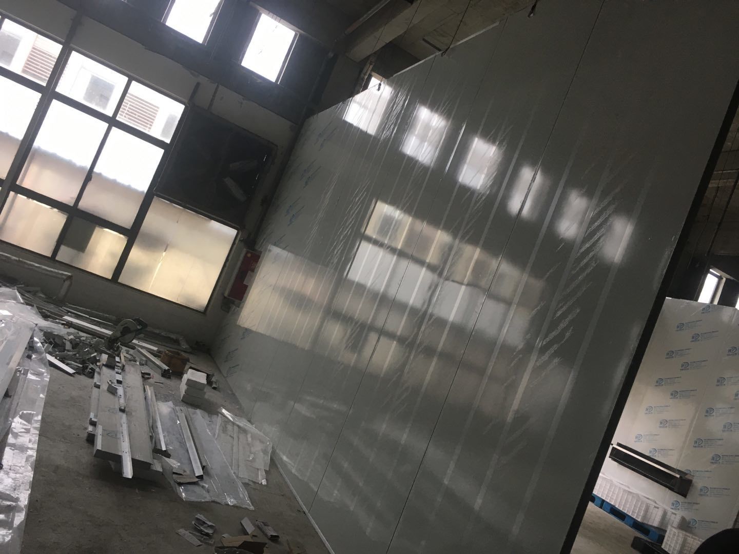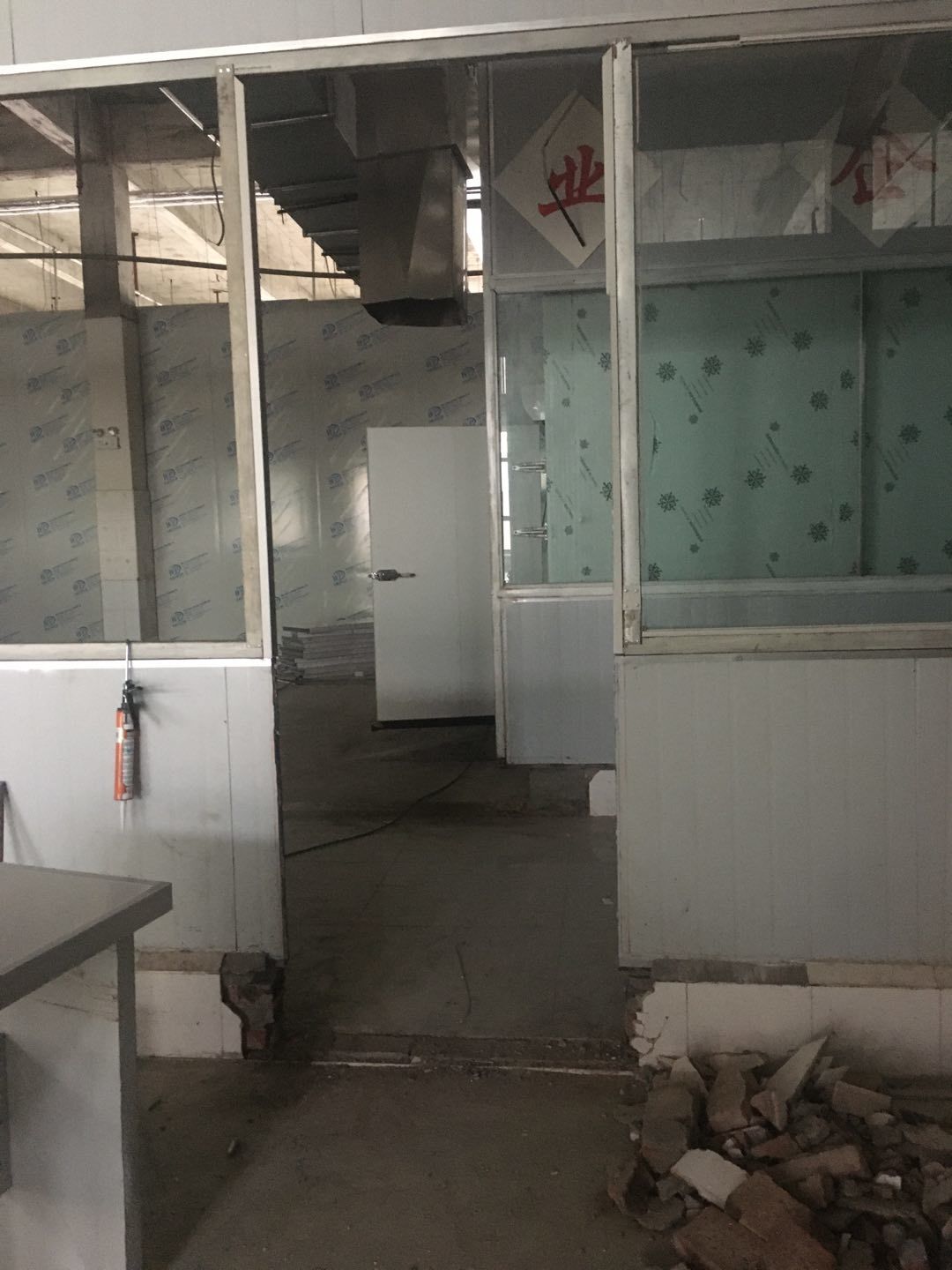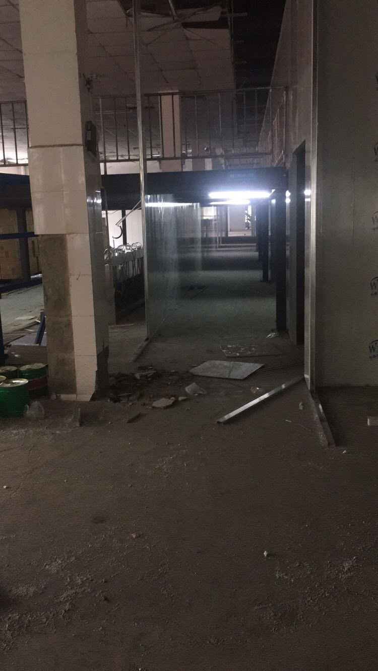 排水溝邊恢復(fù)完成100%;土建原有柱子瓷磚破碎恢復(fù)95%;彩鋼墻板完成100%;原有土建墻開門洞及恢復(fù)完成100%;門、窗完成100%;水、電完成40%;收尾完成量,撕膜、打密封膠、完成55%。