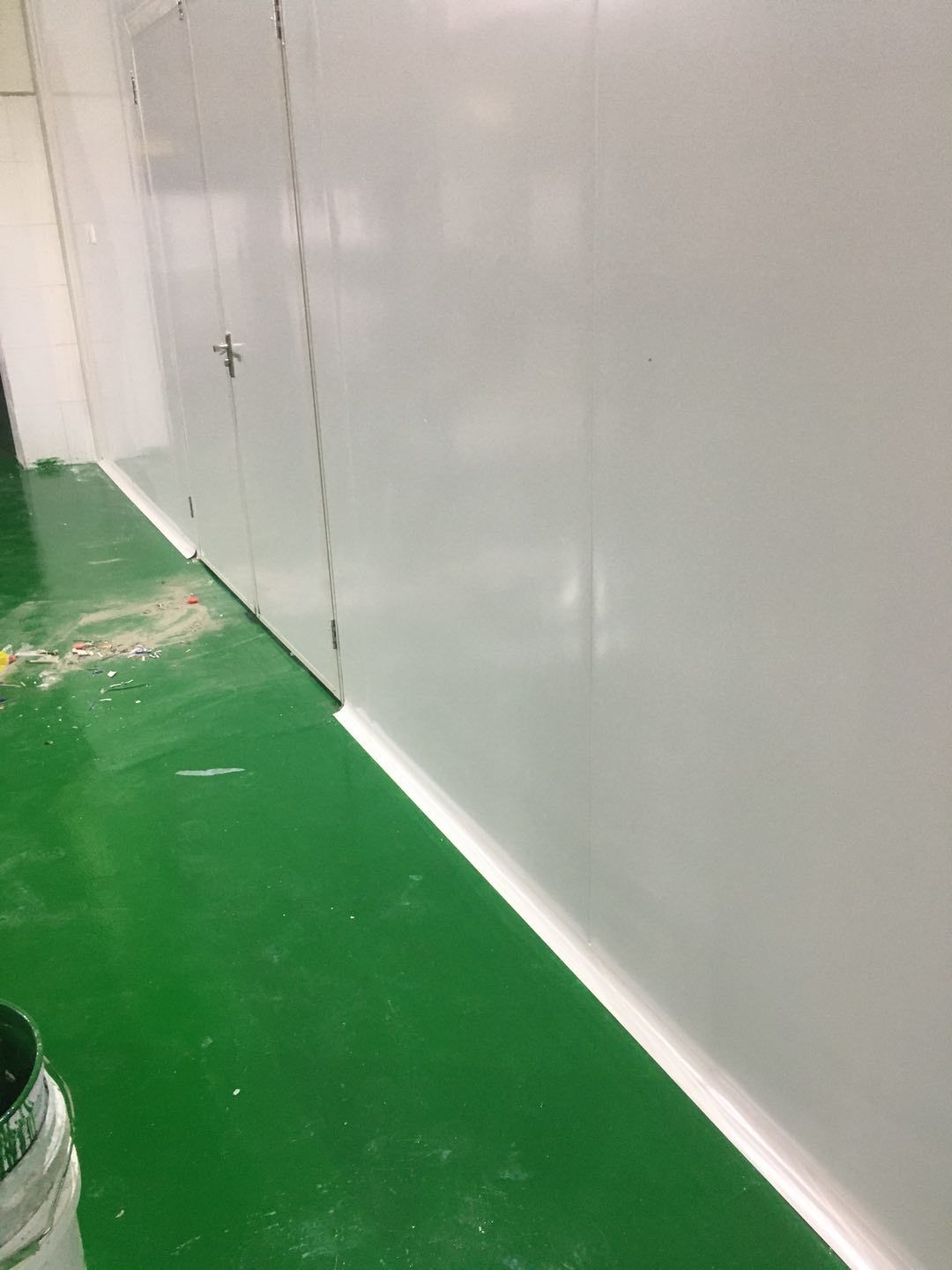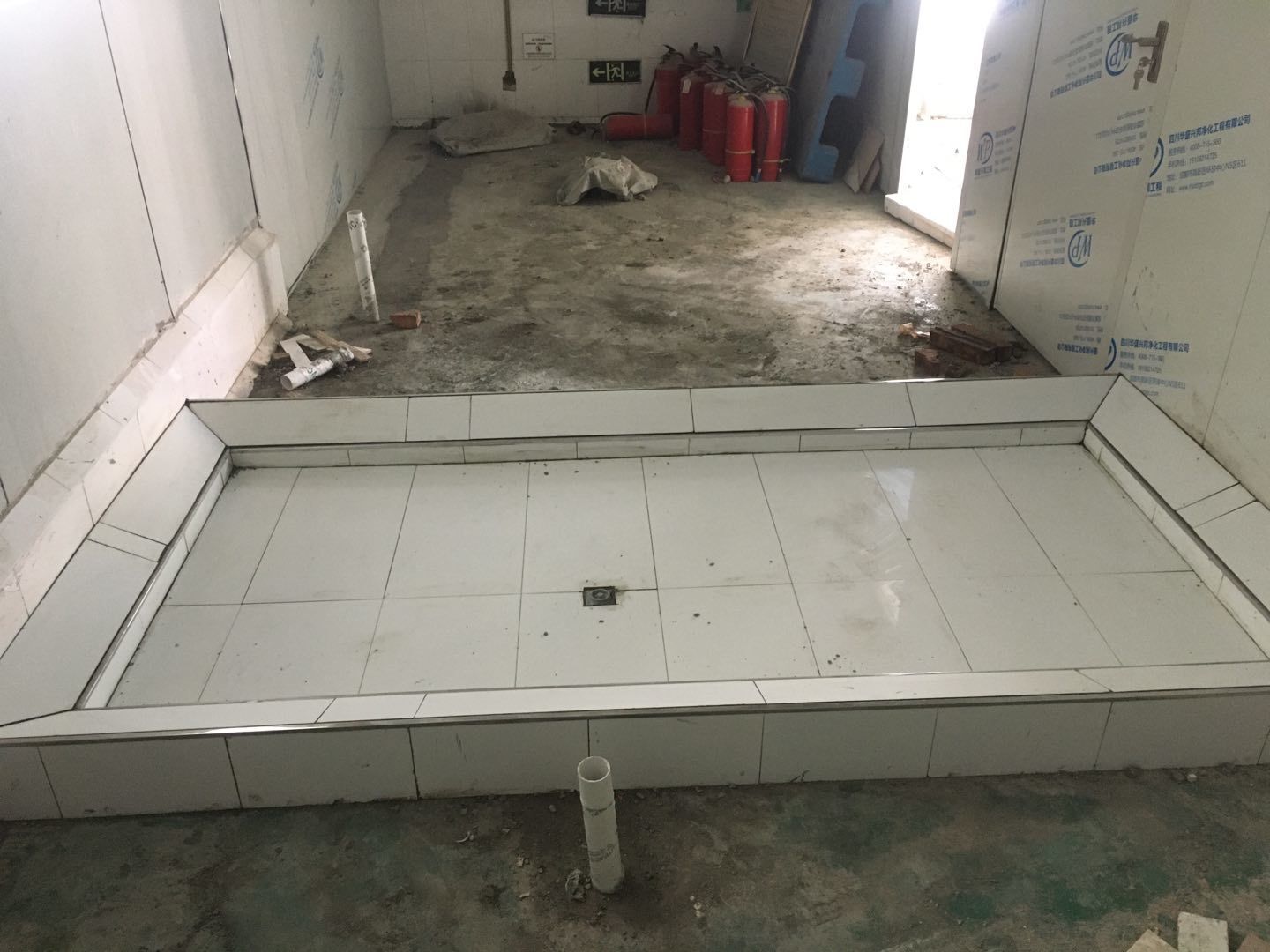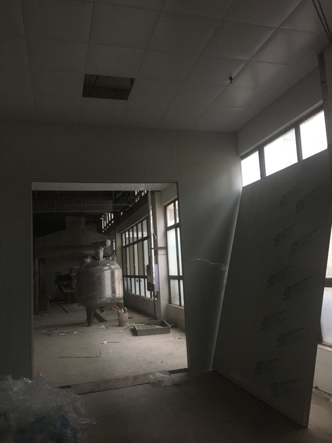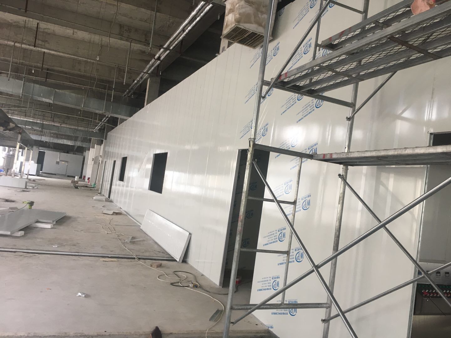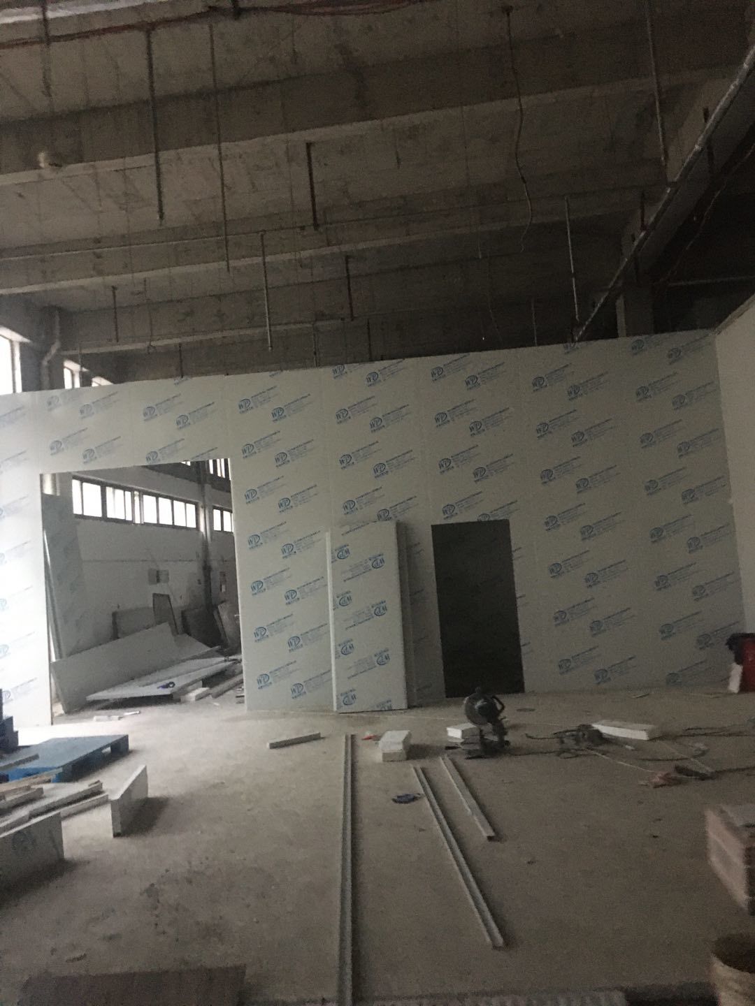 排水溝邊恢復(fù)完成70%,土建原有柱子瓷磚破碎恢復(fù)95%,彩鋼墻板完成70%,原有土建墻開門洞完成90%門,完成60%