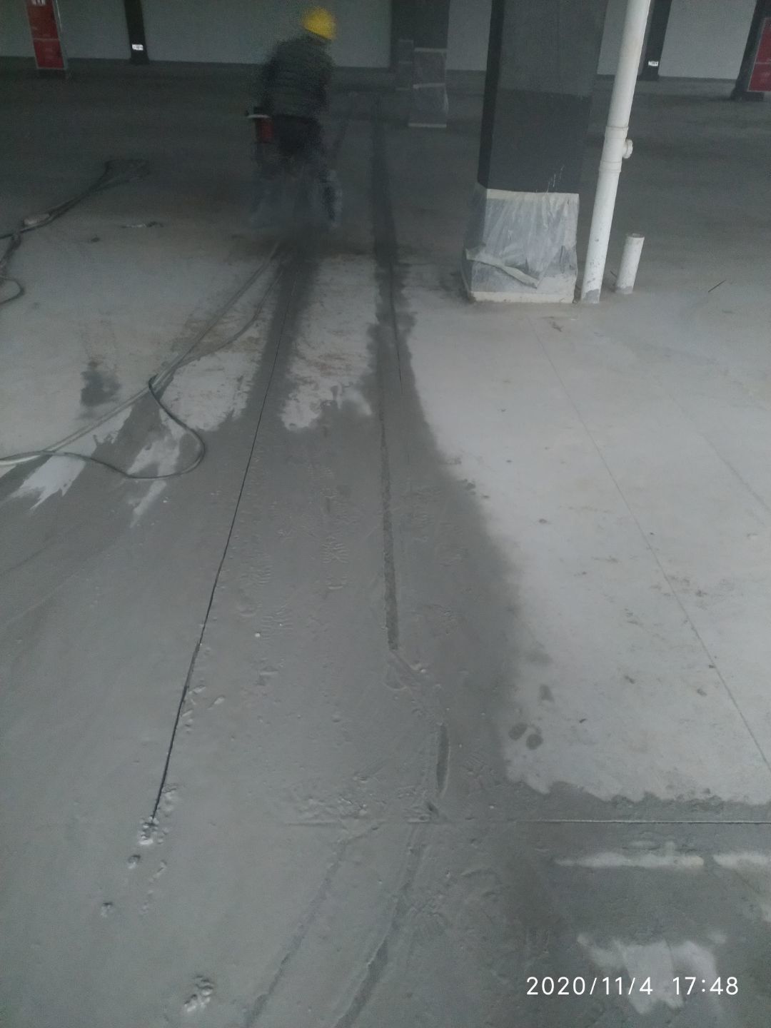 車間安裝現場臨時配電箱和臨時用水,車間排水溝放線,切縫完成40%。