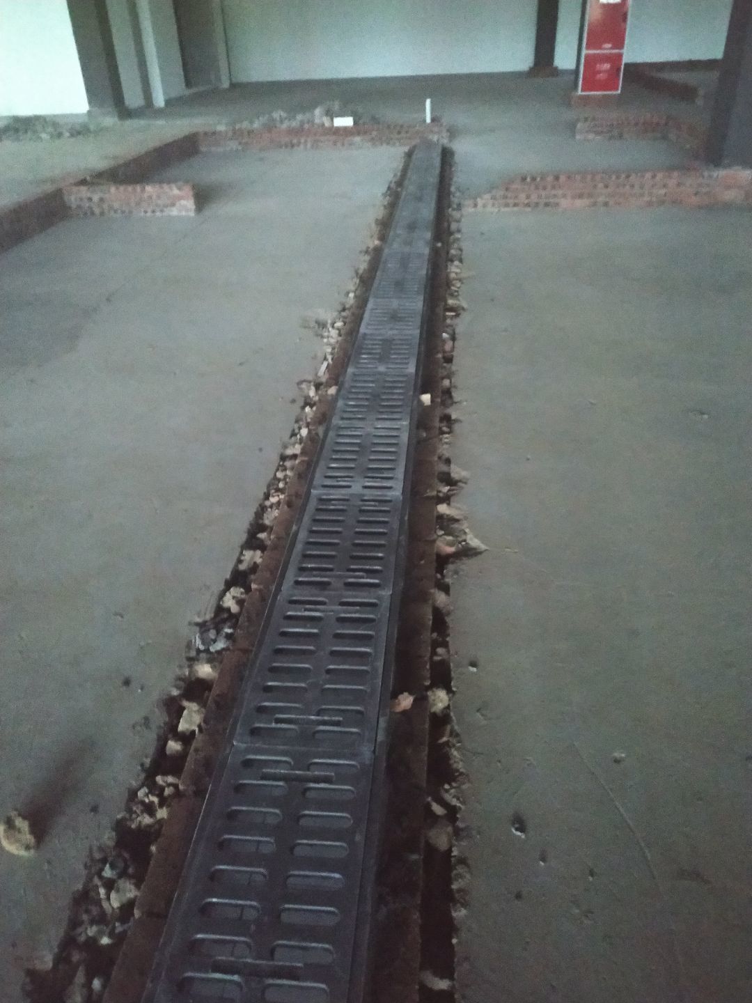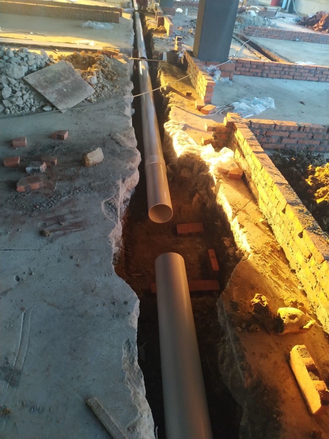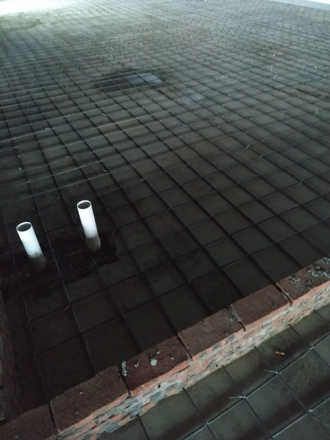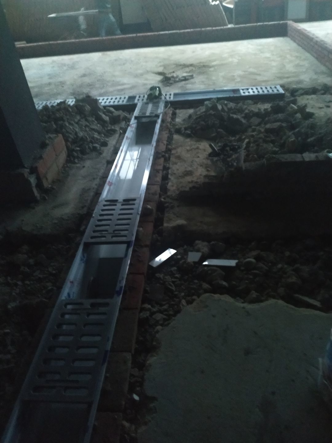 排水溝砌磚完成75%,瓷磚、地磚、排水管、防水材料、排水溝折邊件和水篦子到場卸貨。