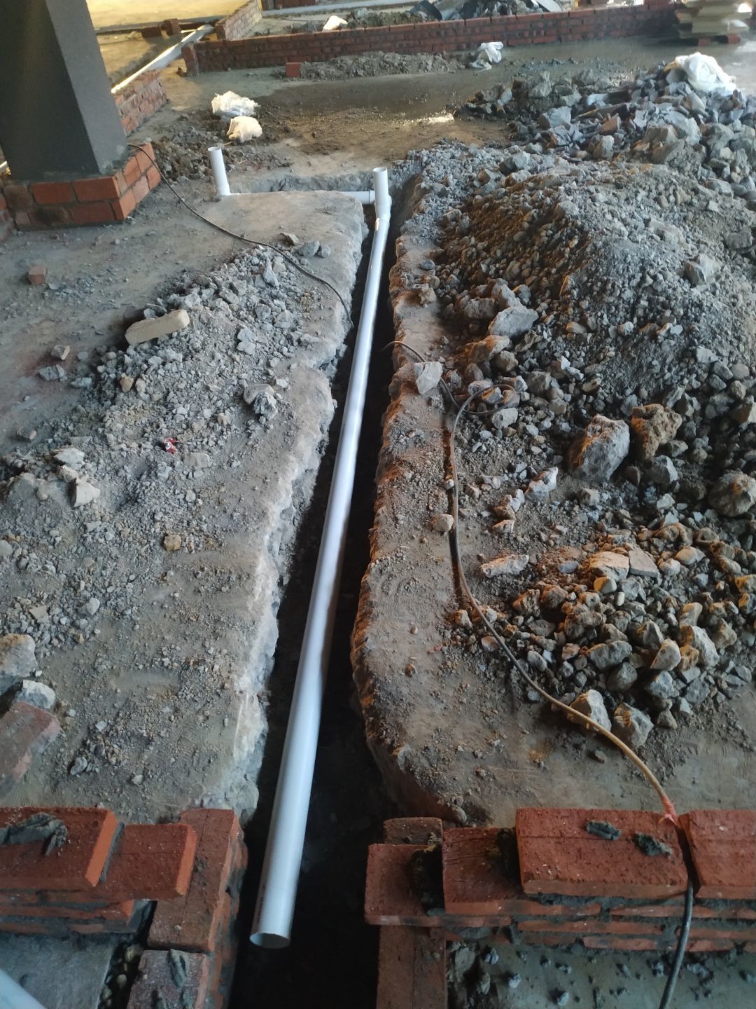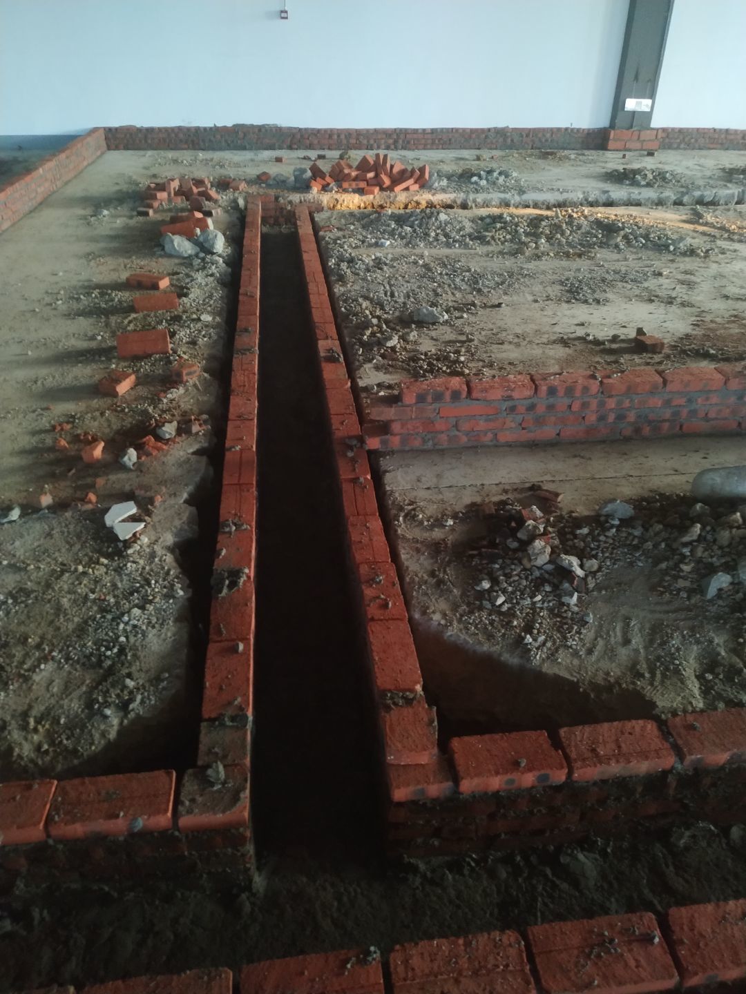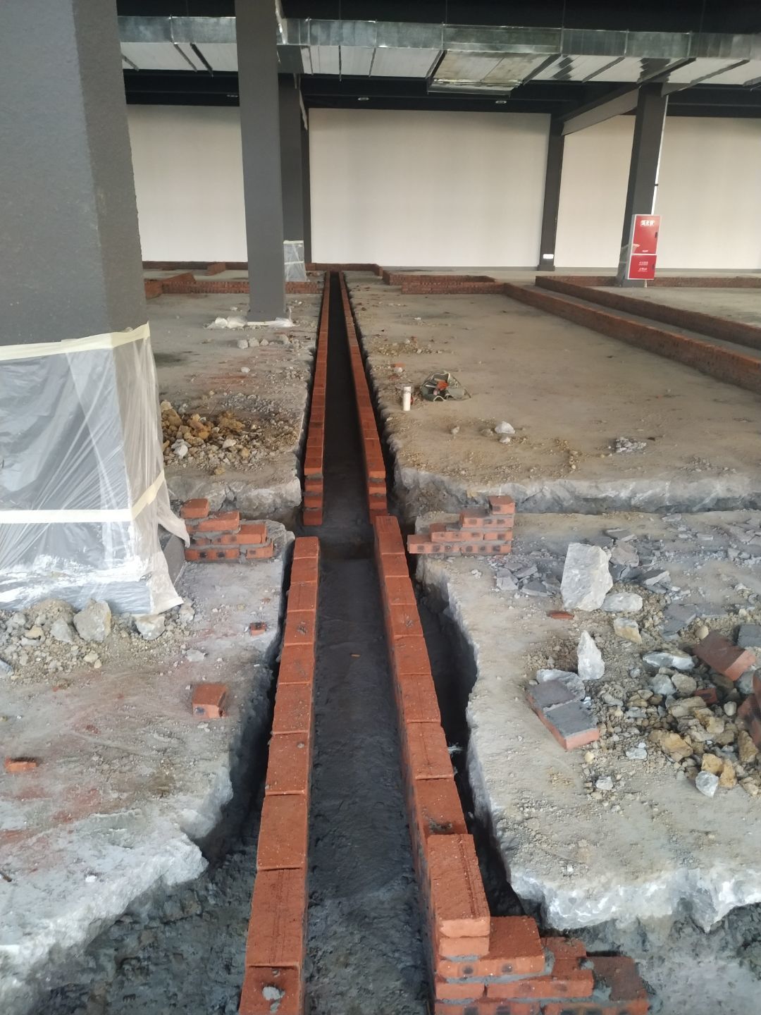 排水溝砌磚完成75%,瓷磚、地磚、排水管、防水材料、排水溝折邊件和水篦子到場卸貨。