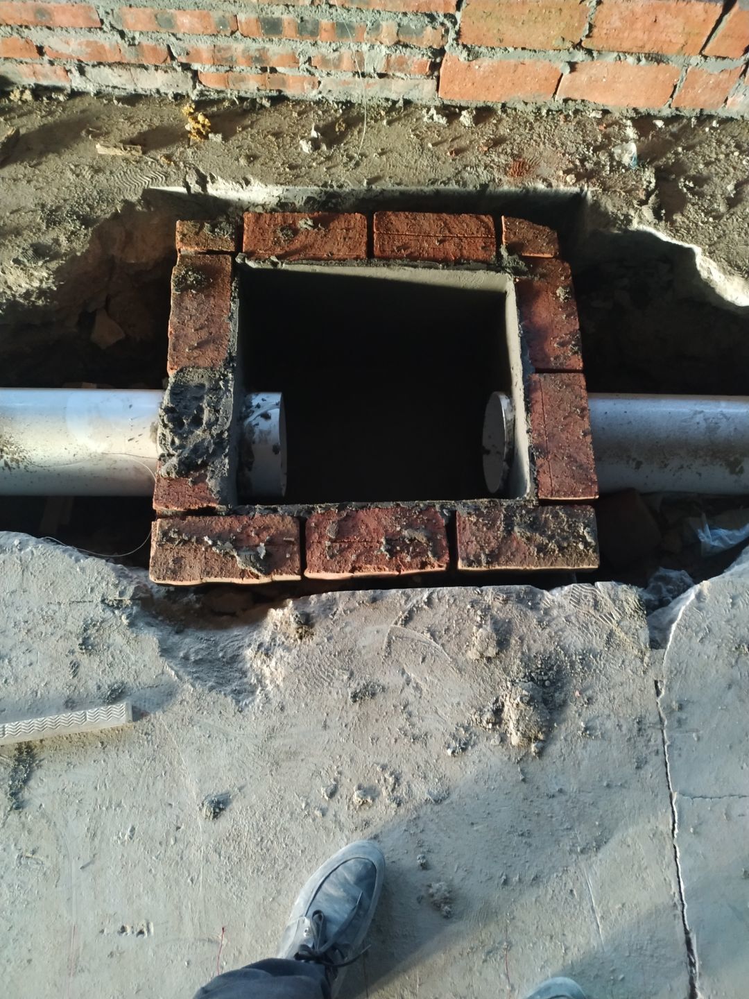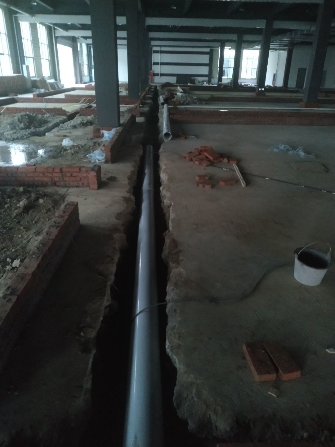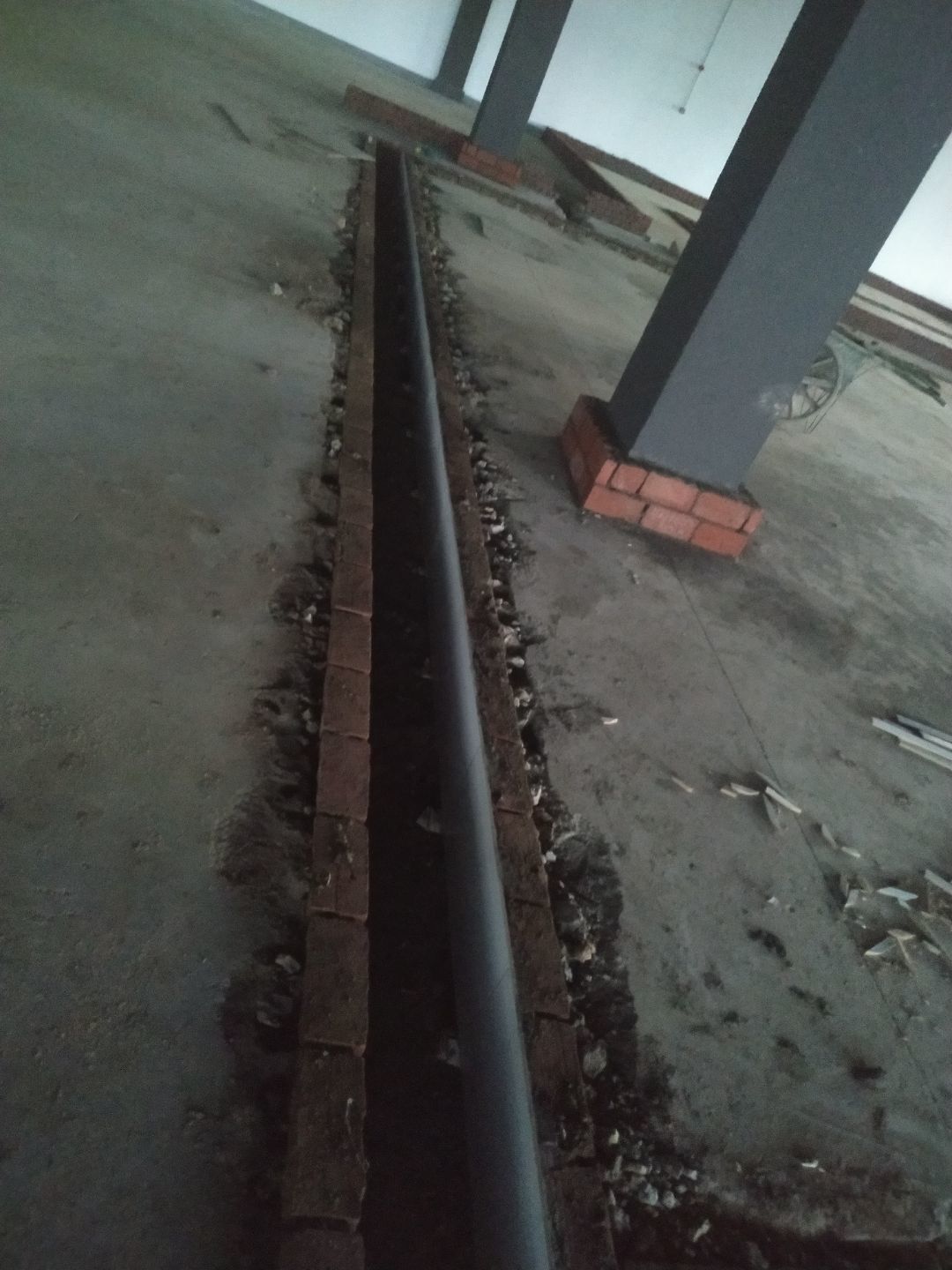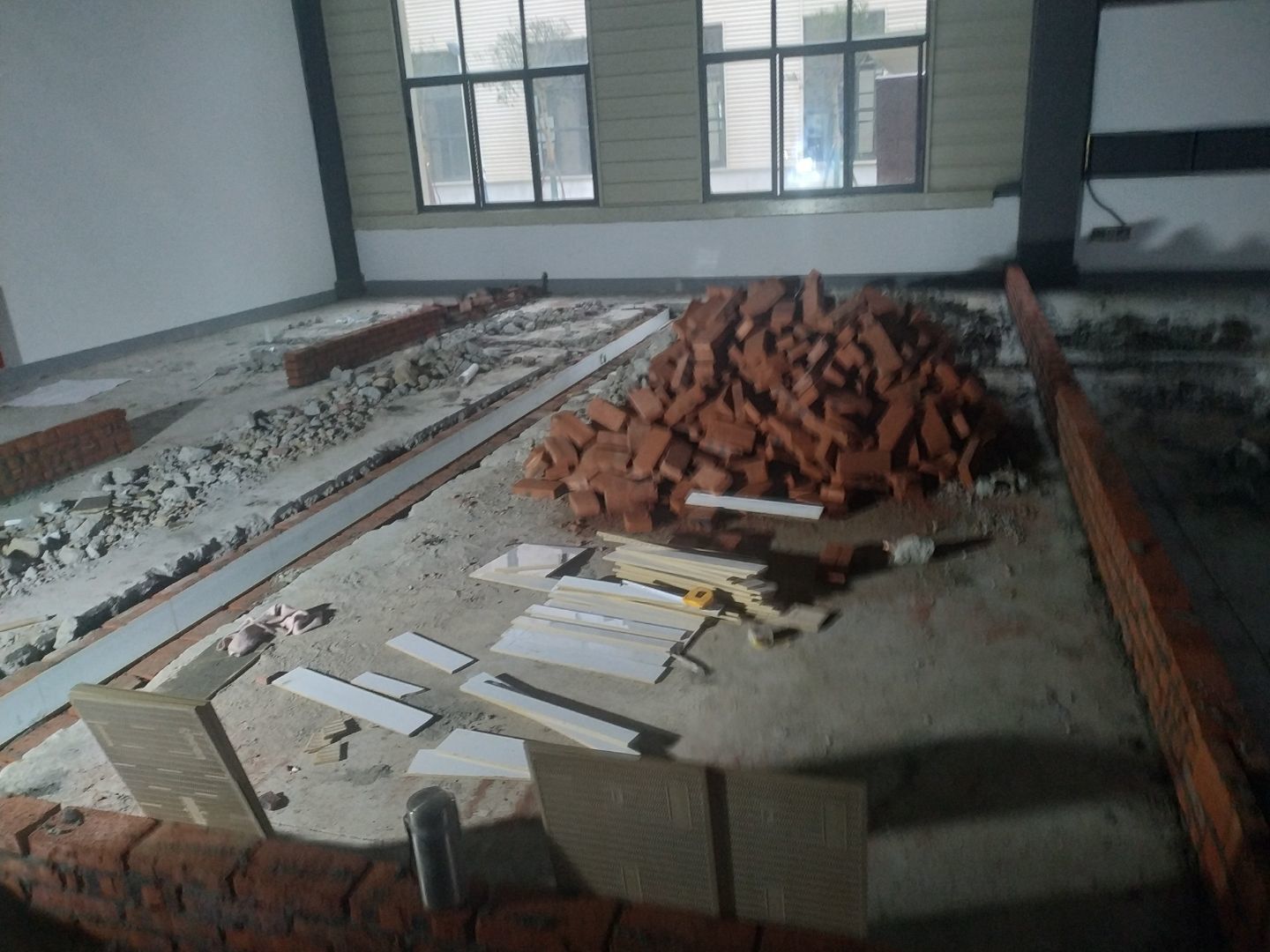 排水溝砌磚完成75%,瓷磚、地磚、排水管、防水材料、排水溝折邊件和水篦子到場卸貨。