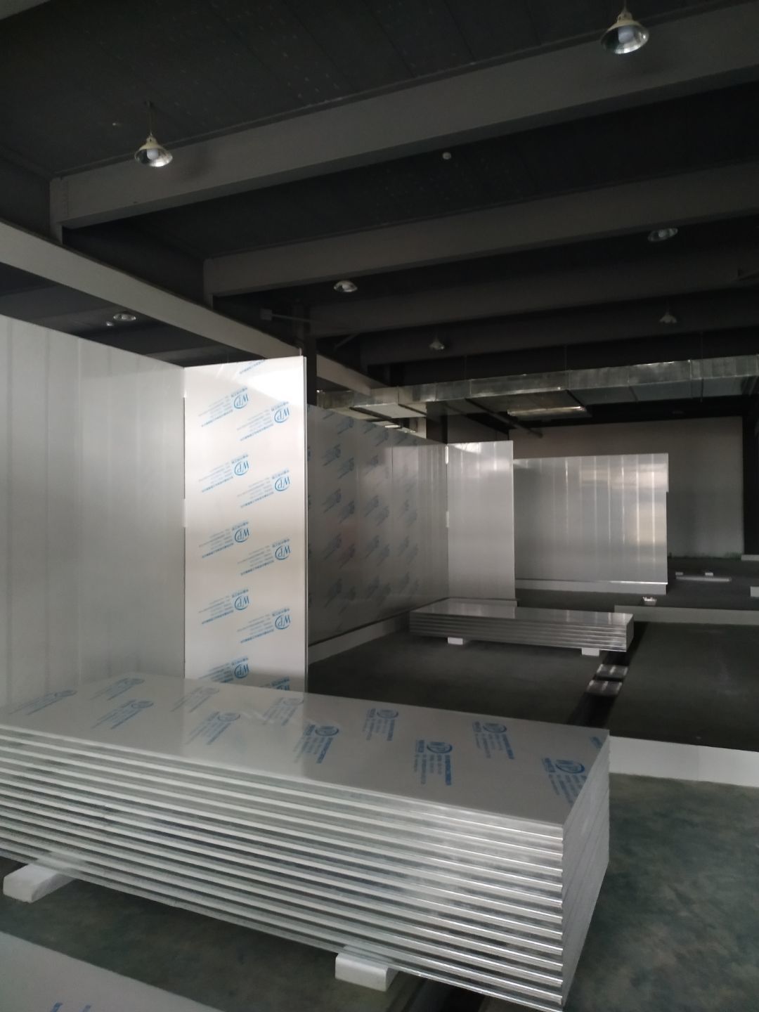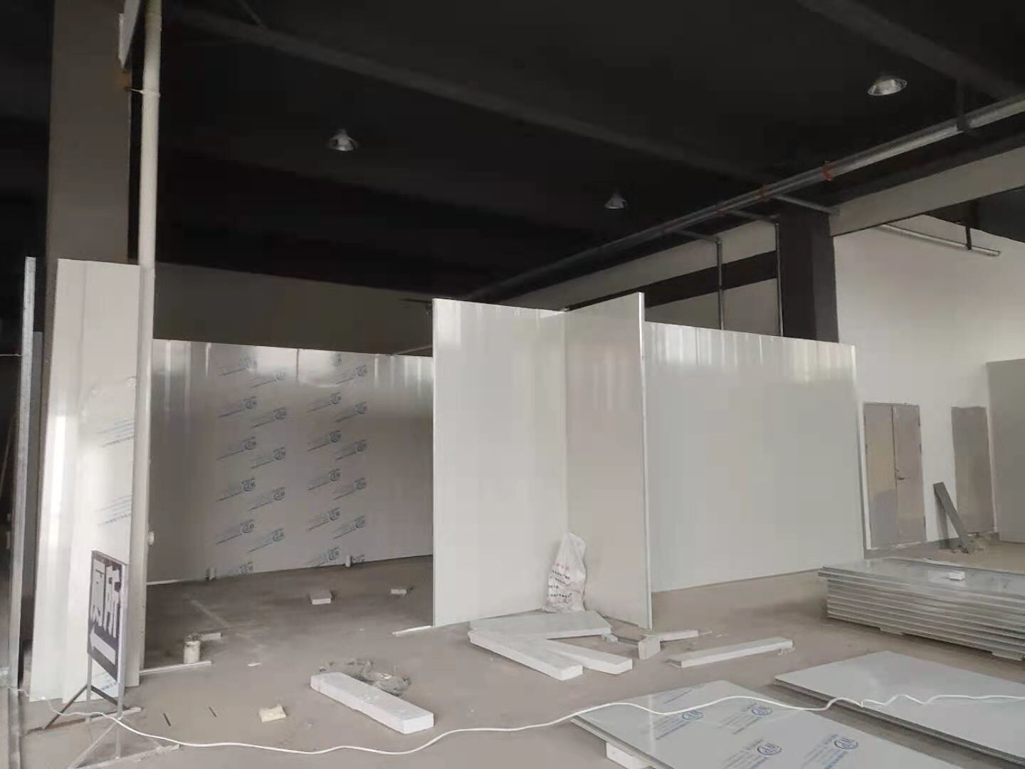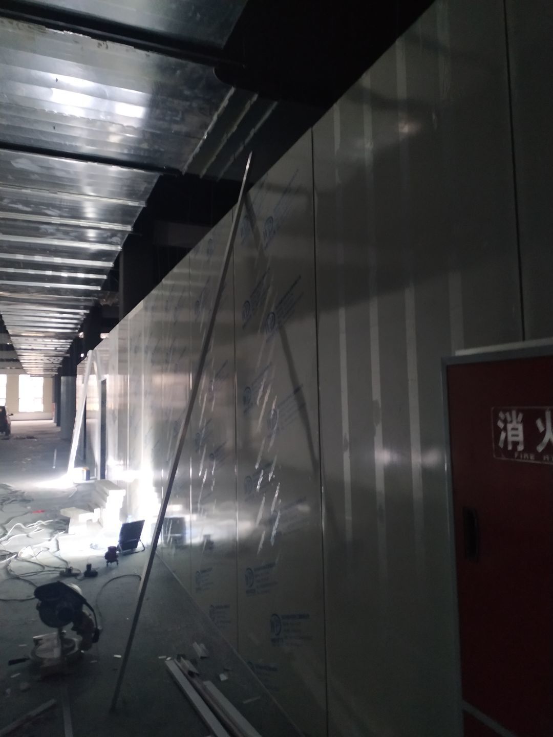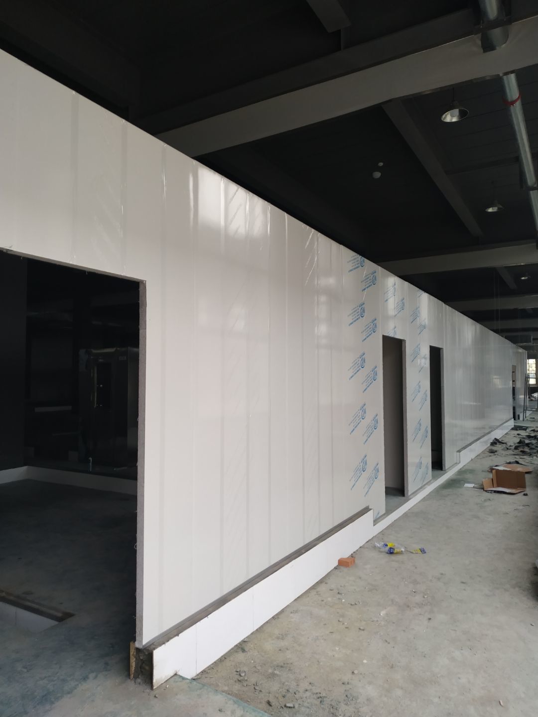 防火隔斷墻上門洞開孔完成,彩鋼墻窗戶開孔完成,門料預制,撕膜打膠,彩鋼板材料到場。