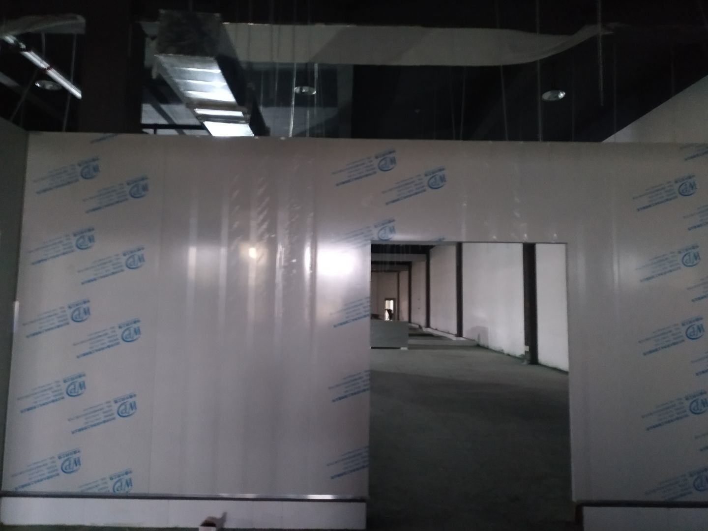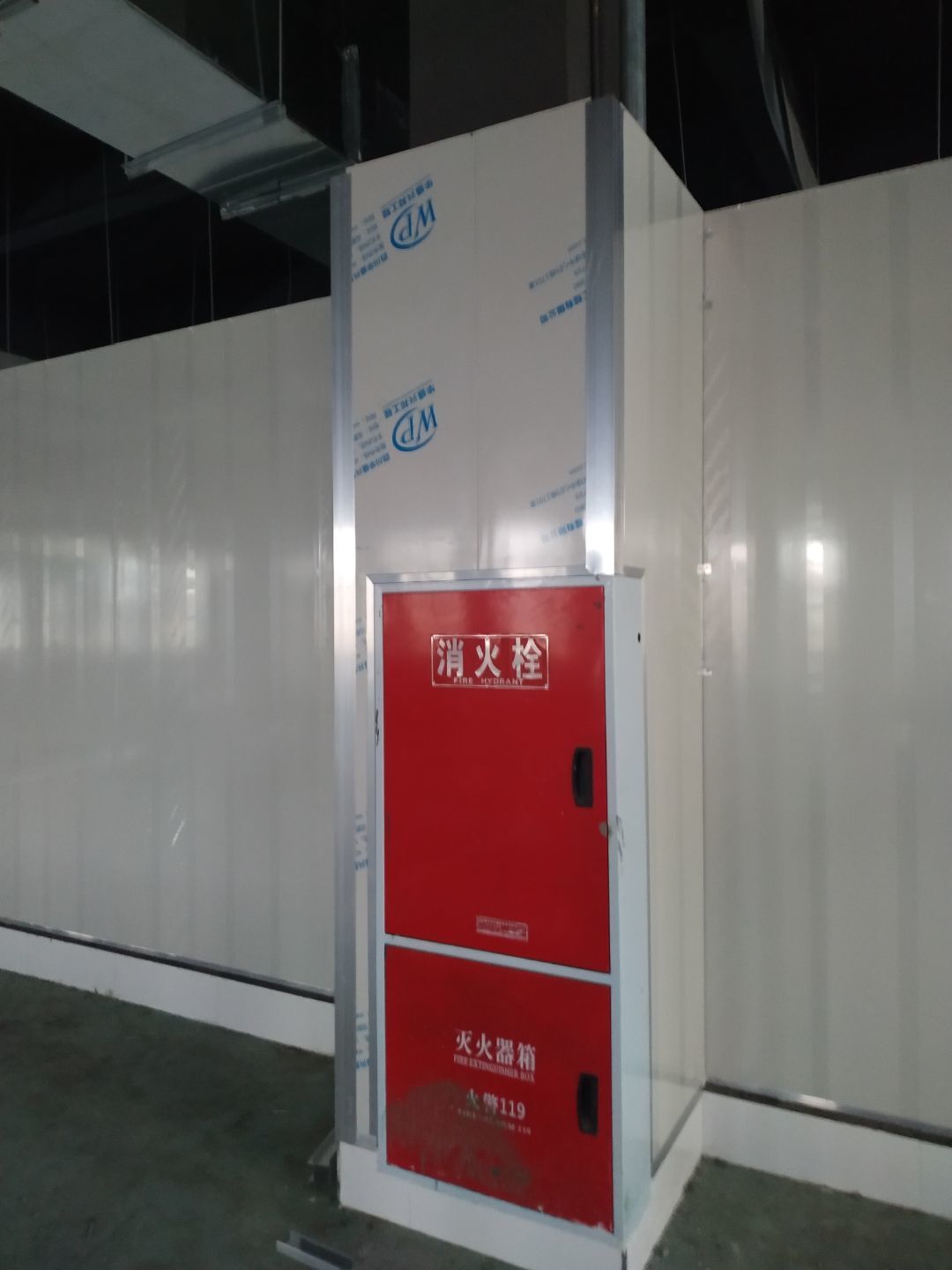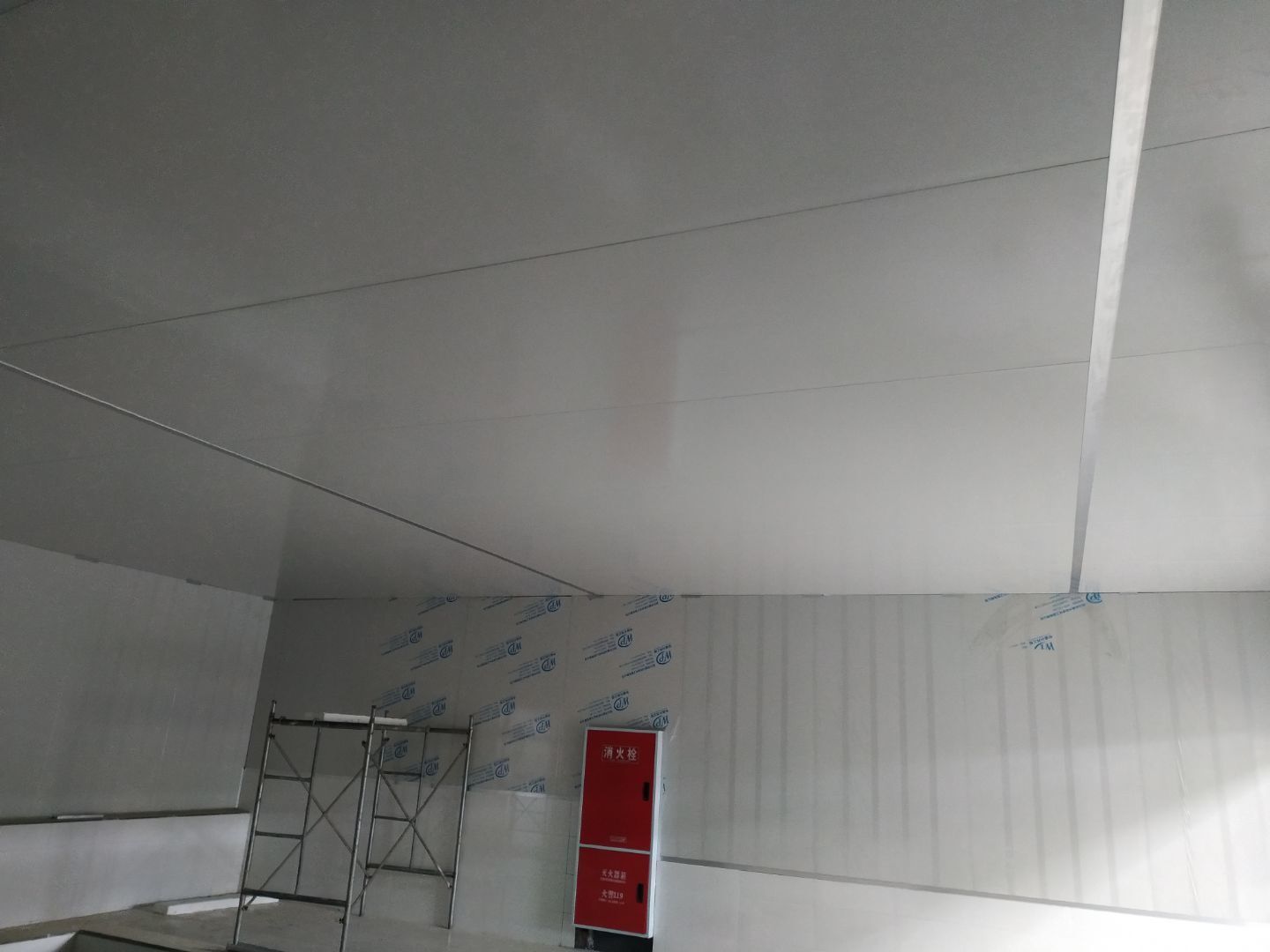 防火隔斷墻上門洞開孔完成,彩鋼墻窗戶開孔完成,門料預制,撕膜打膠,彩鋼板材料到場。
