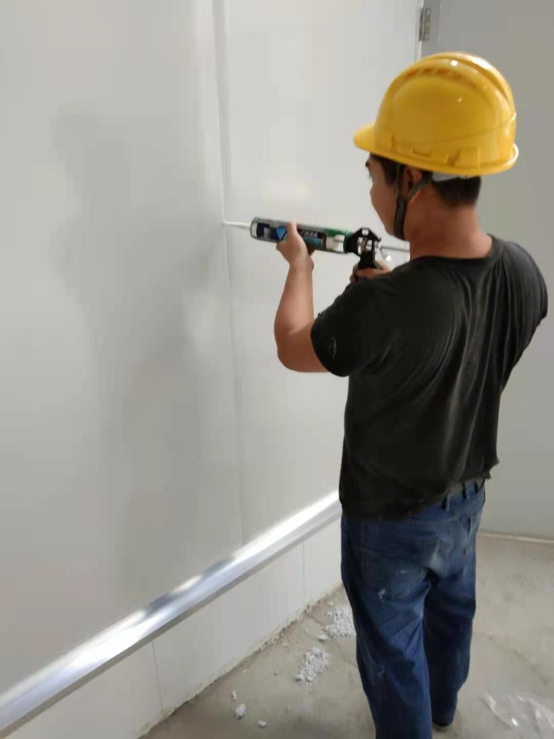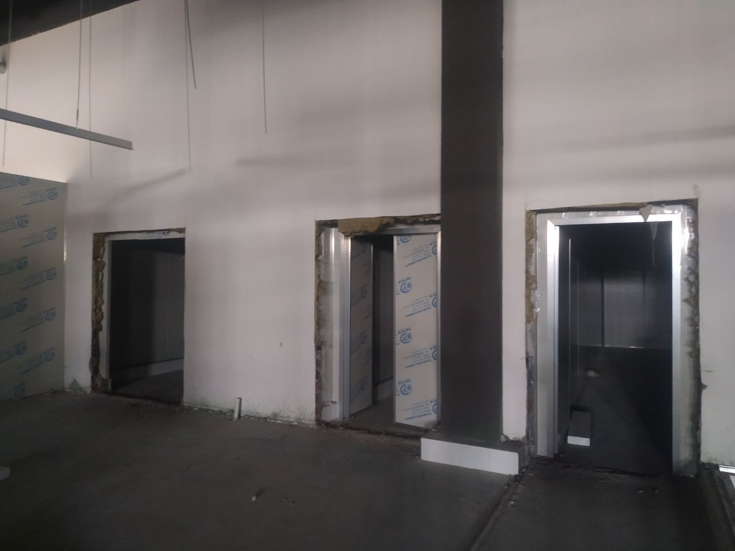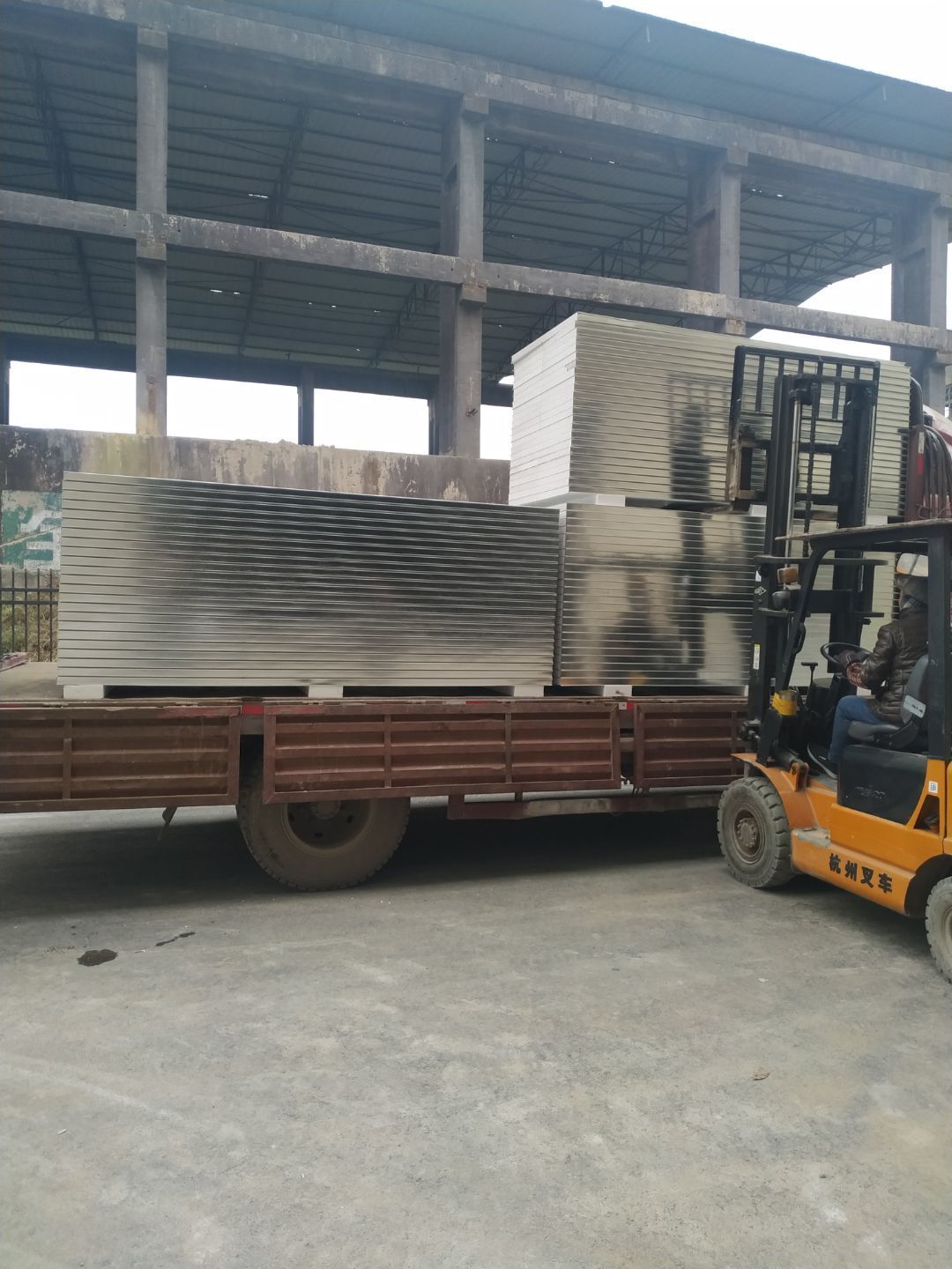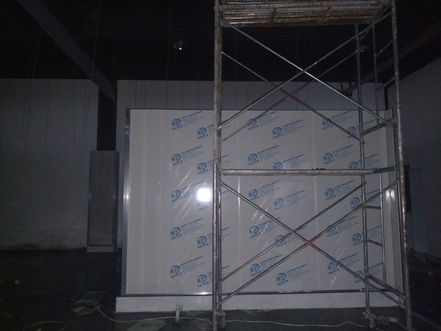 防火隔斷墻上門洞開孔完成,彩鋼墻窗戶開孔完成,門料預制,撕膜打膠,彩鋼板材料到場。