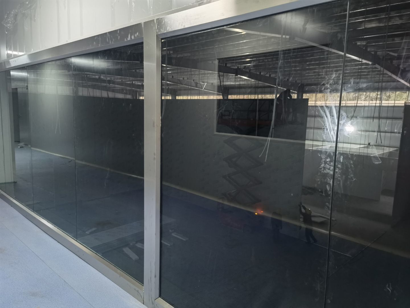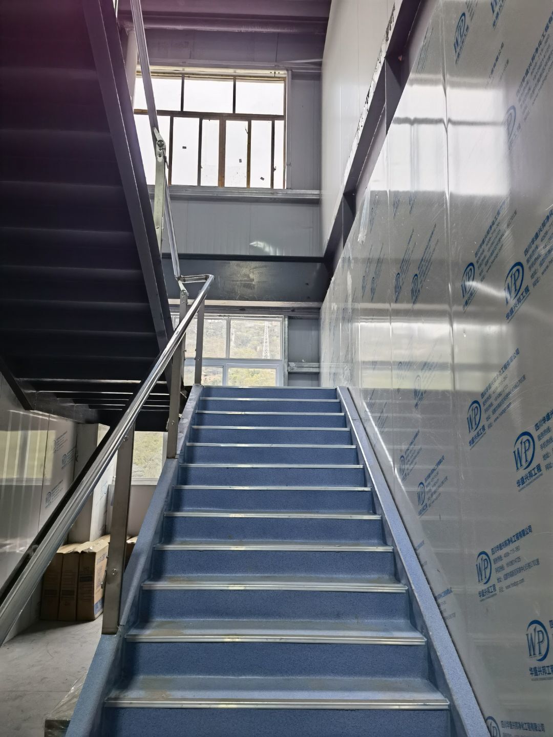 4號廠房打膠完成百分之80,參觀通道撕膜,樓梯施工