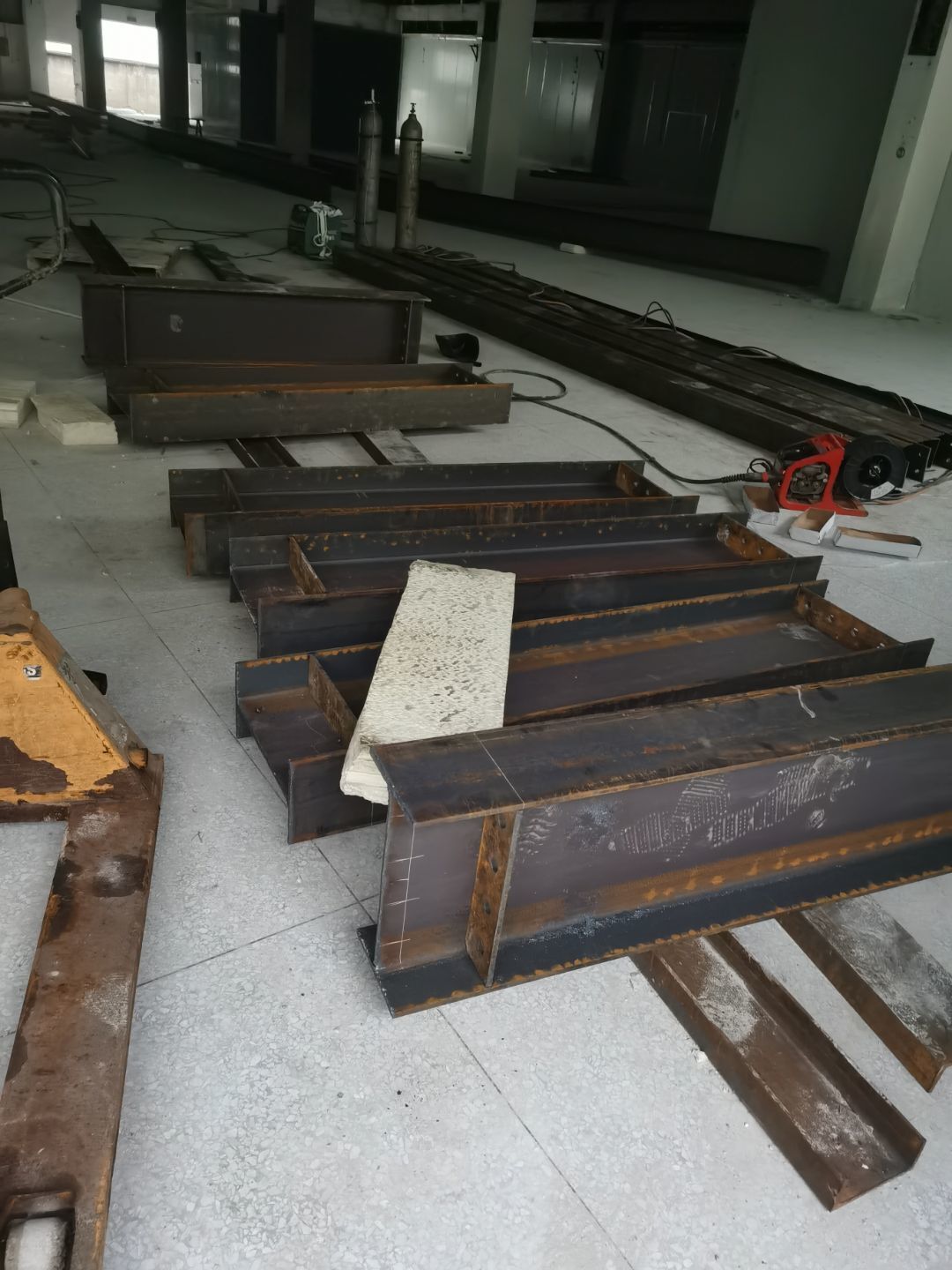 今日鋼構材料進場,鋼構師傅開始下料制作
