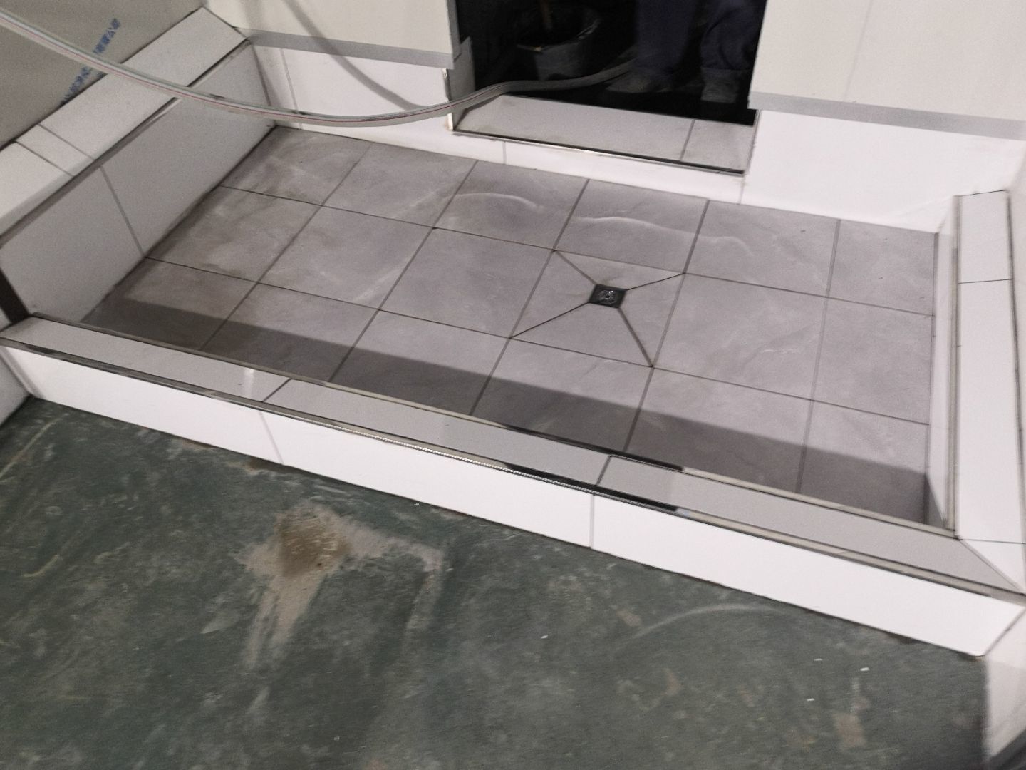 1.車間立墻板,掛T鋁;2.擋水墻貼斜坡,勾縫,做腳踏池