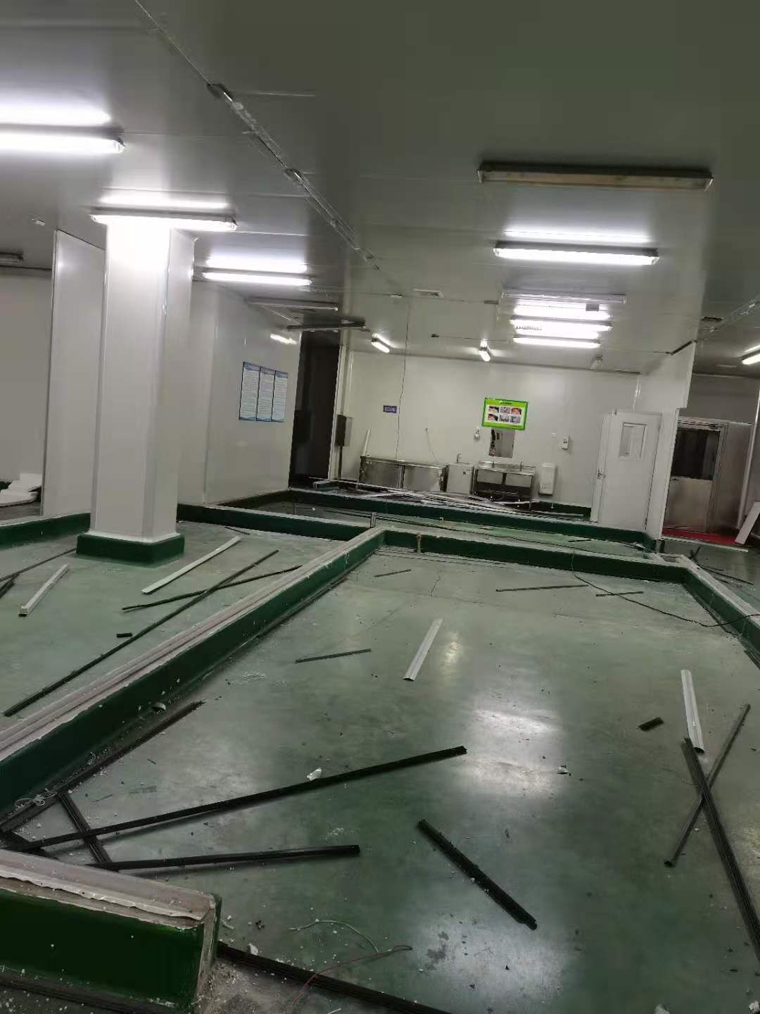 1、墻板拆除完成95%; 2、開關插座拆除完成95%; 3、外包間及反應釜車間燈具拆除完成100%; 4、場地清理。