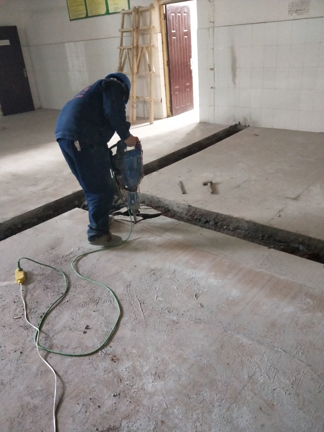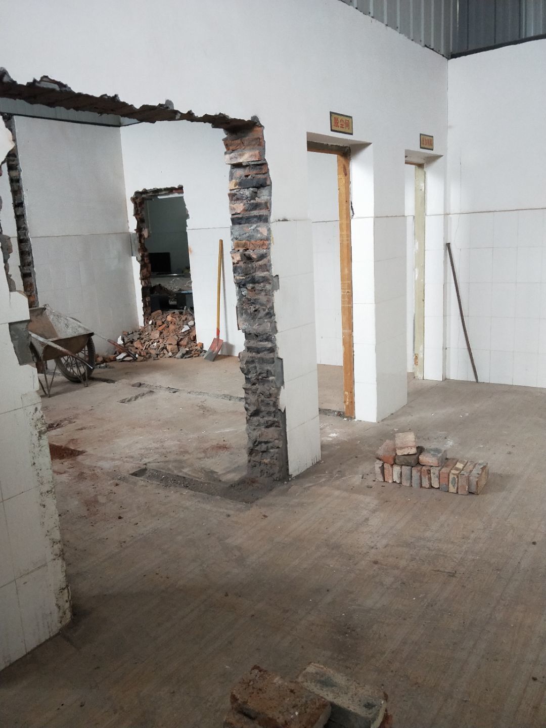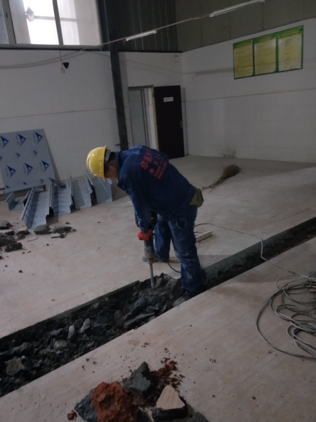 板材到場下貨,掛鋼繩,門洞貼磚修補,排水點貼磚