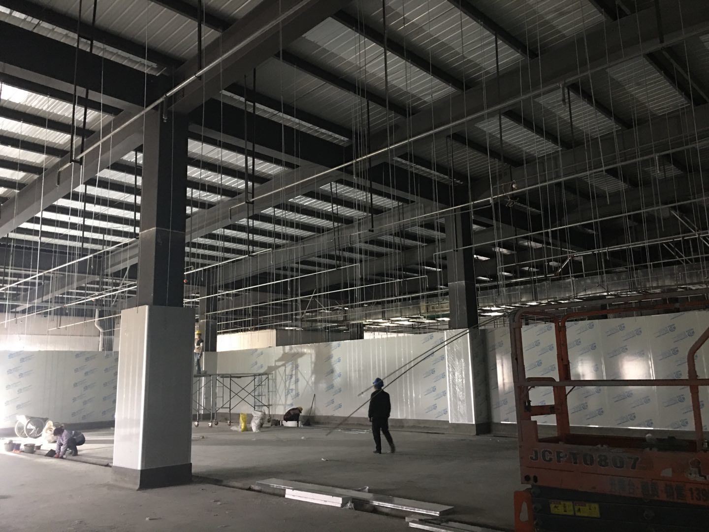 1.簽證彩板內(nèi)包材庫(kù)未封頂,門窗已投合,明日開始全面開預(yù)留孔2.空調(diào)班組、風(fēng)盤絲桿支架固定,管道布置焊接。3.水電班組-燈具安裝,配線配管。全部燈具安裝完成。
