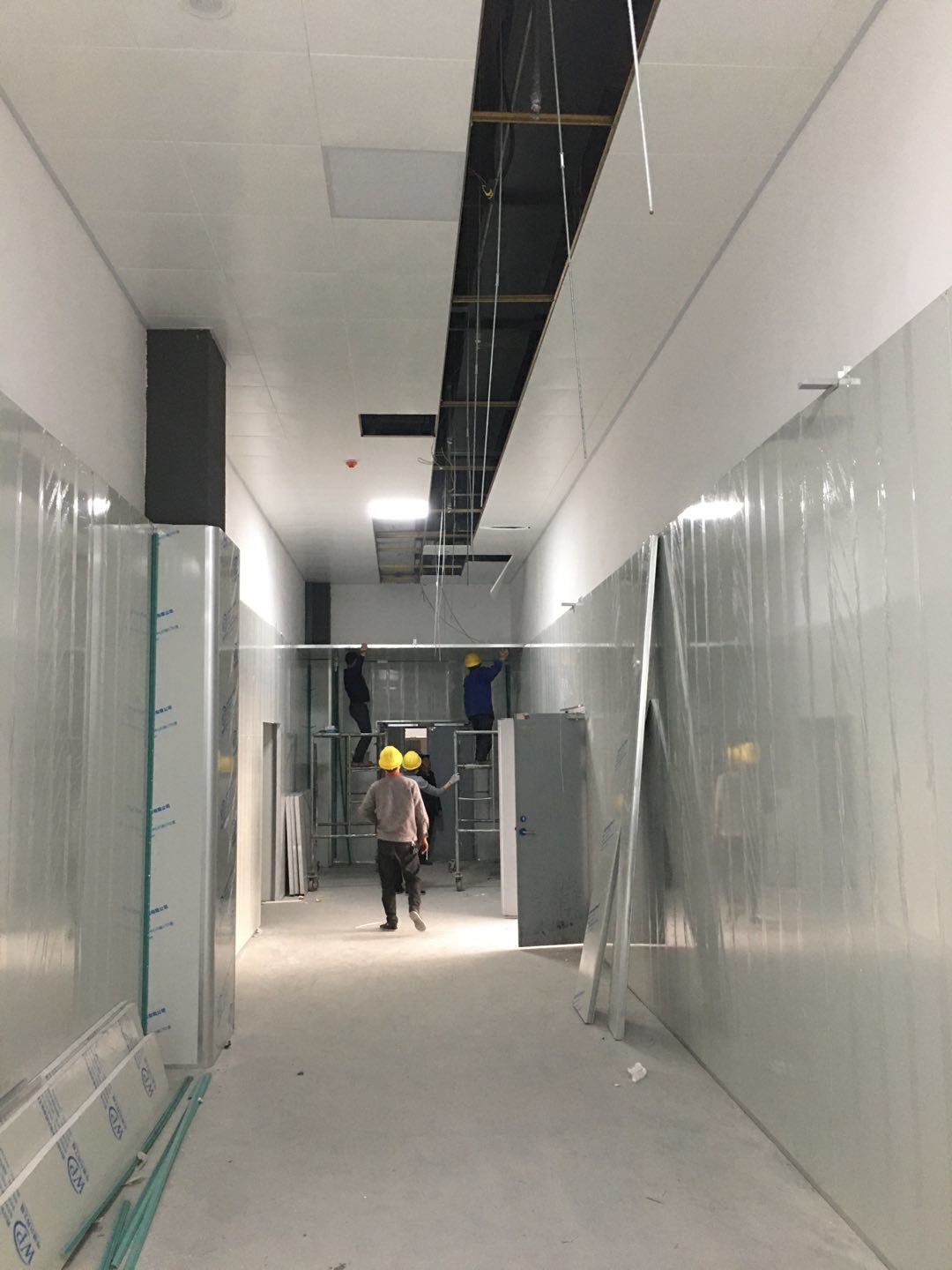 1:泡制車間T型鋁掛設(shè)完成2:前處理區(qū)絲桿掛設(shè)完畢,整體進(jìn)度約為65%。3:隔墻通道門洞包飾處理進(jìn)度較慢,已完成約25%