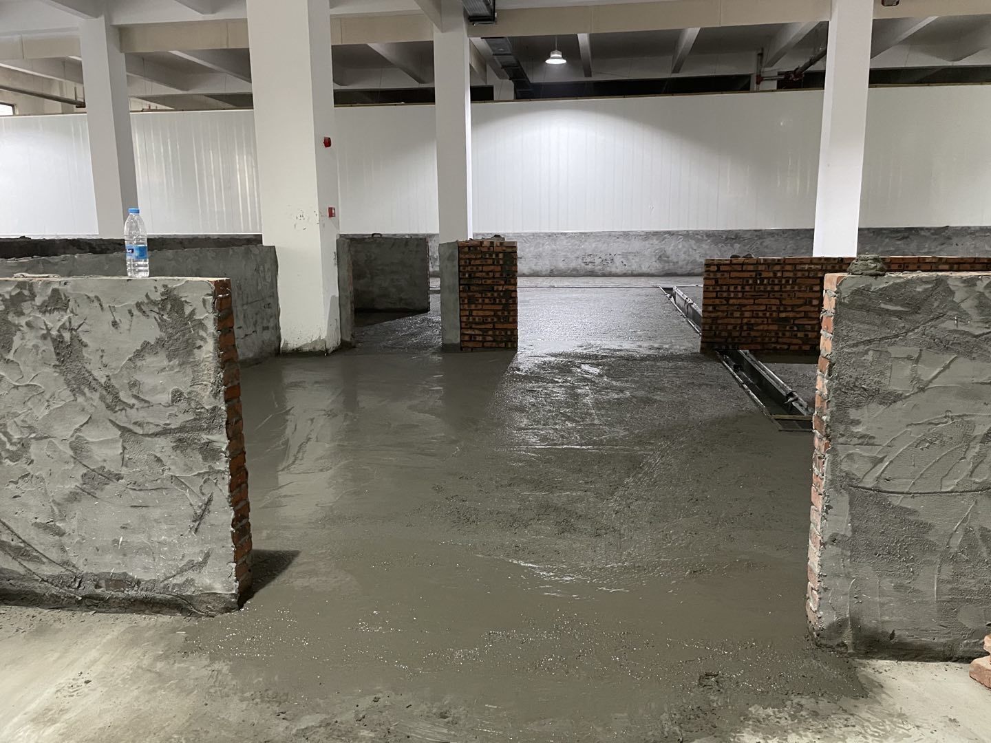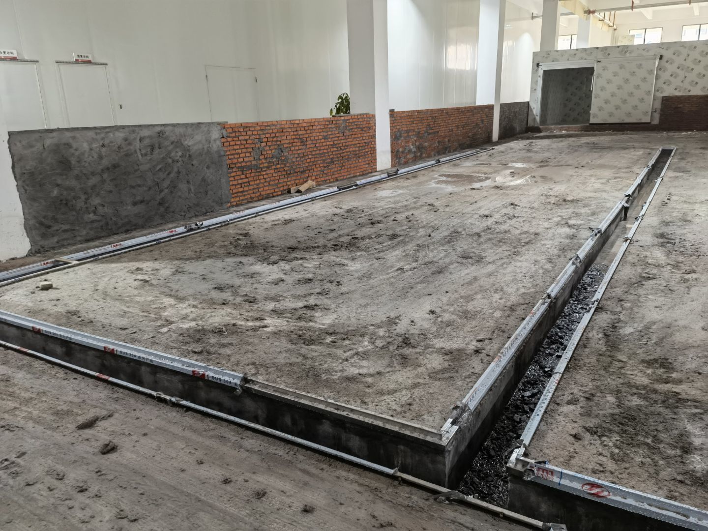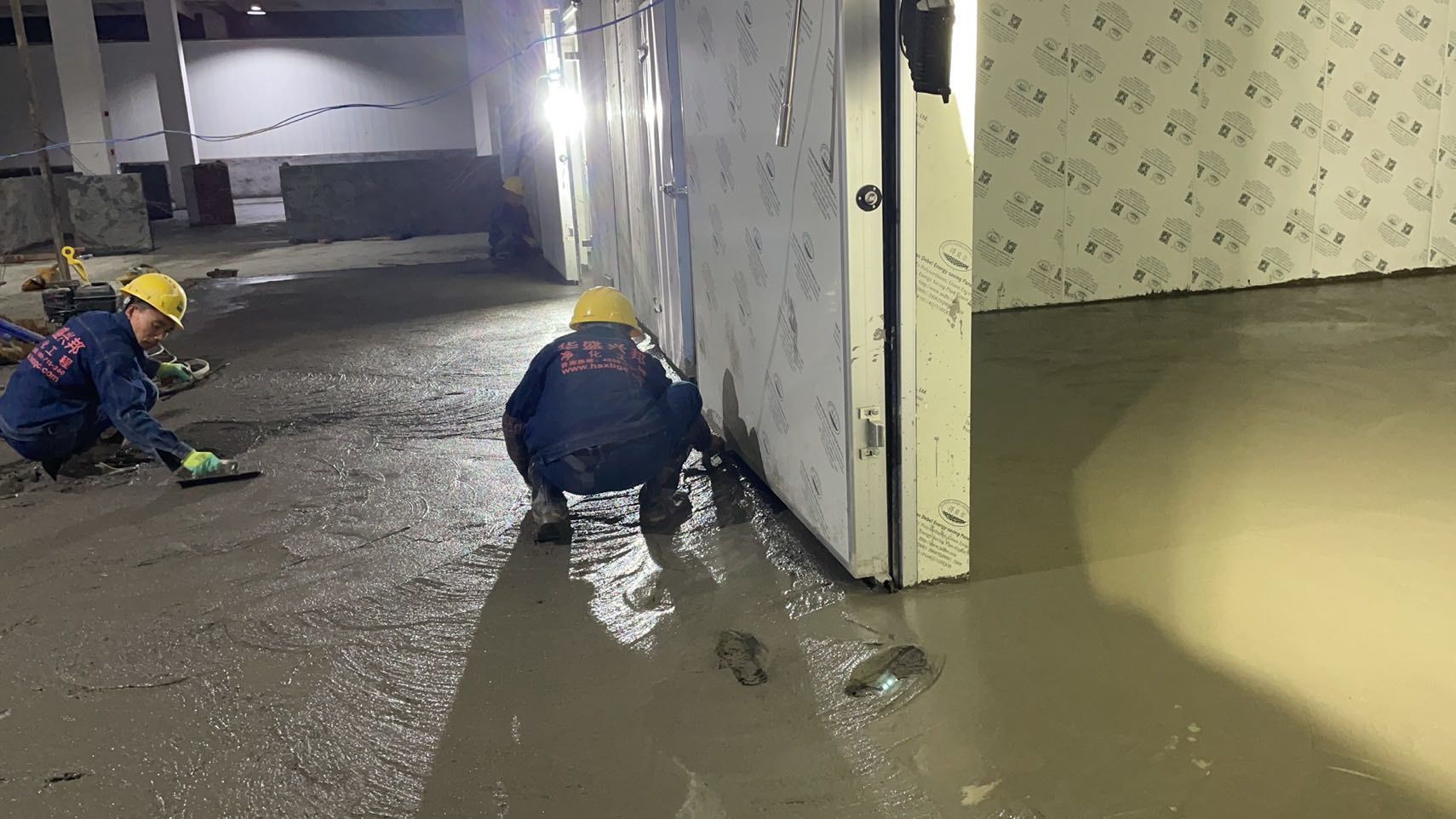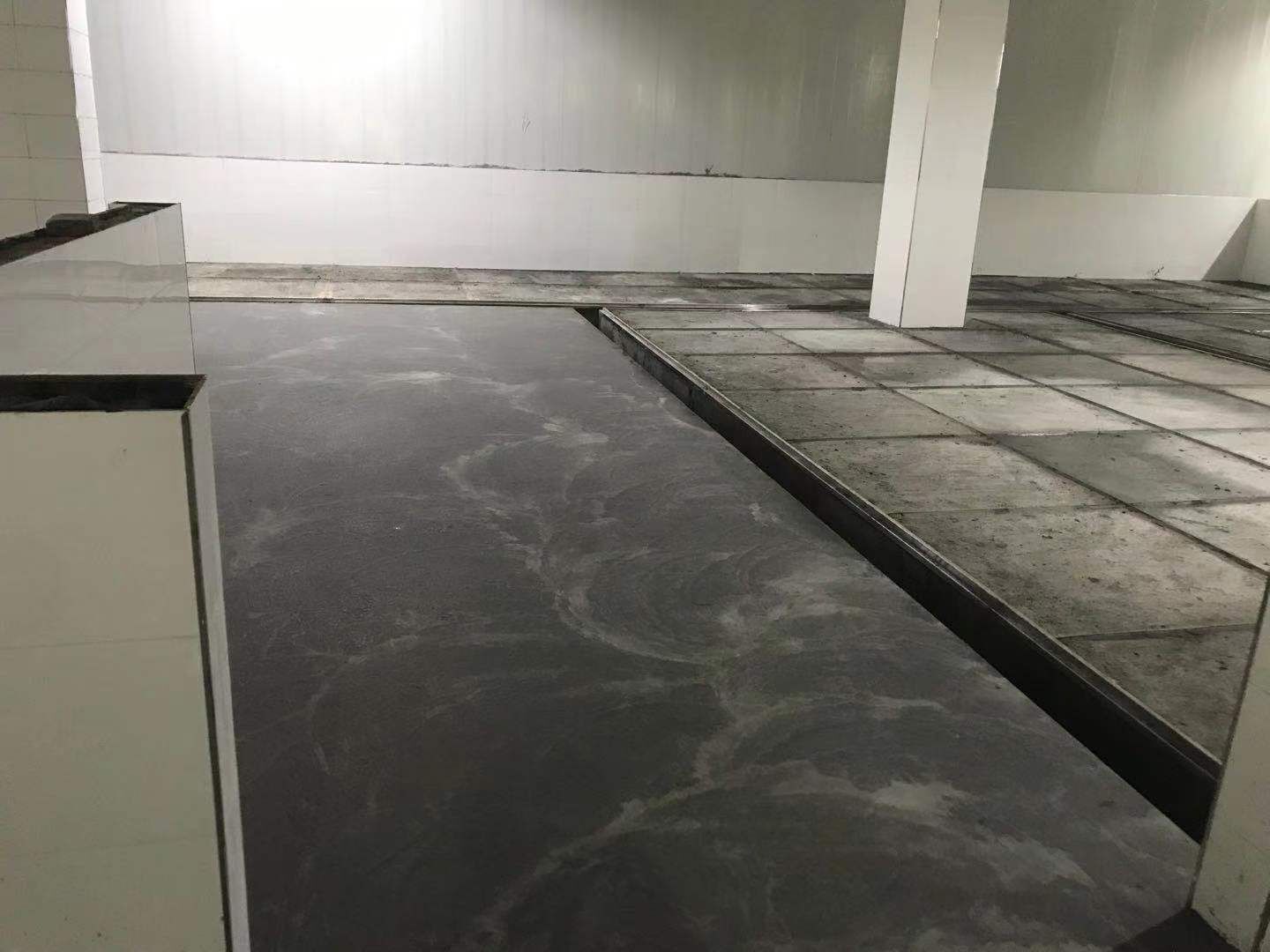 1. 擋水墻防水涂抹。2.水磨石墊層完成。3.凍庫金剛砂地坪完成