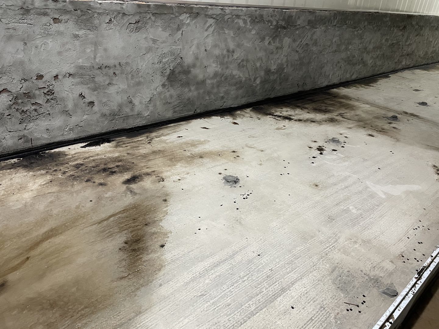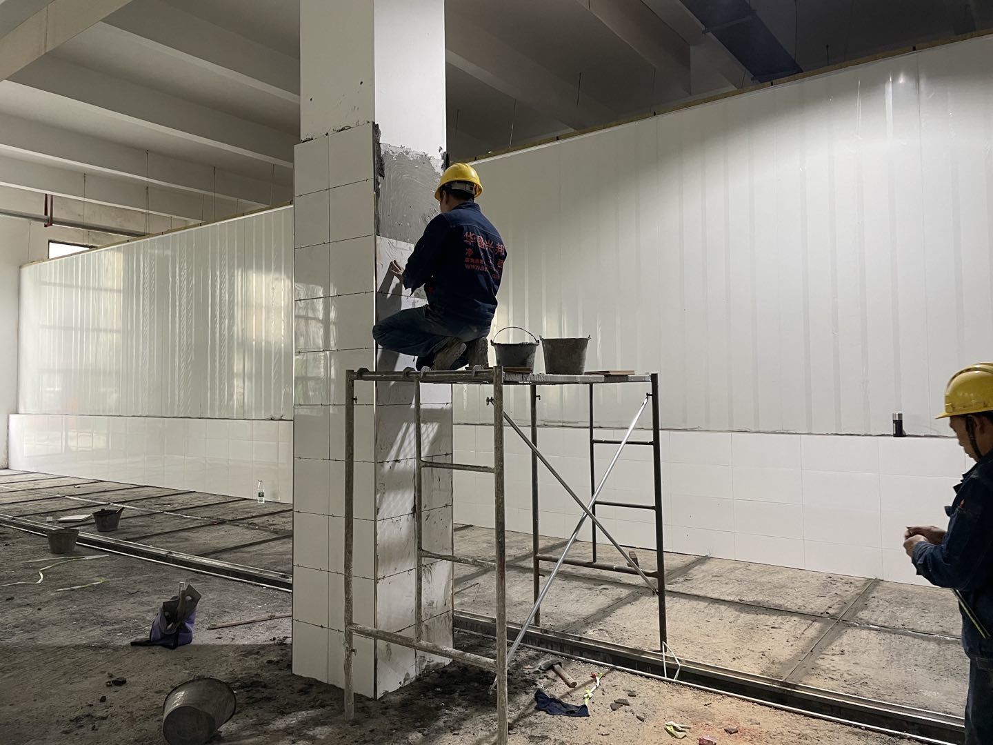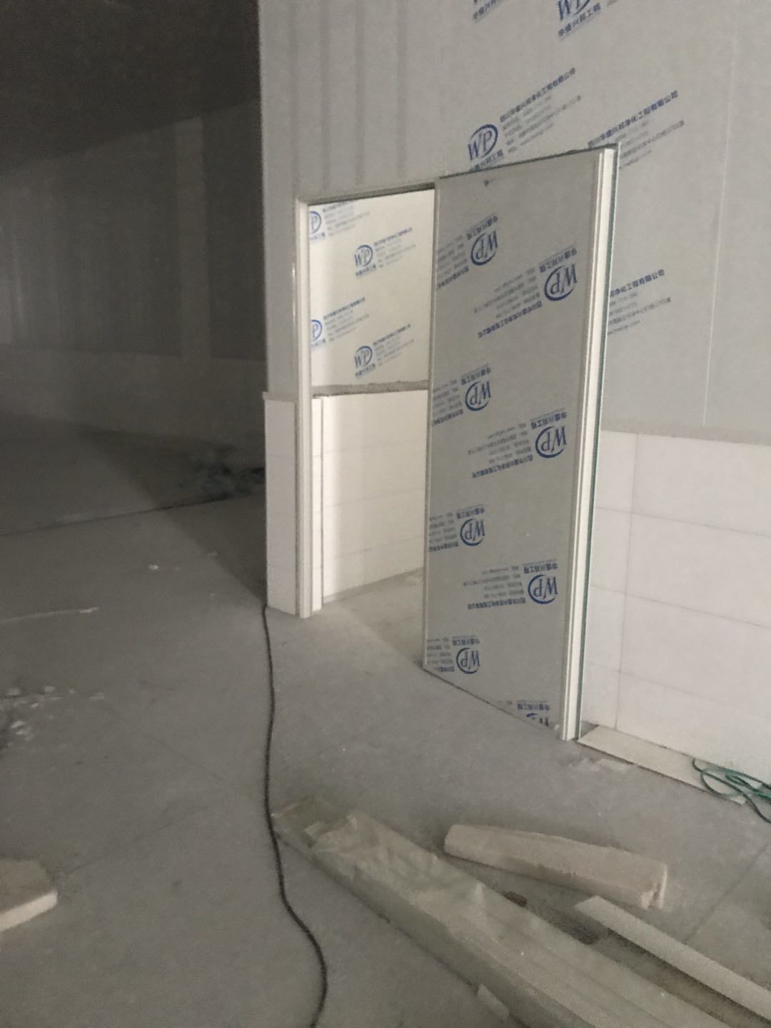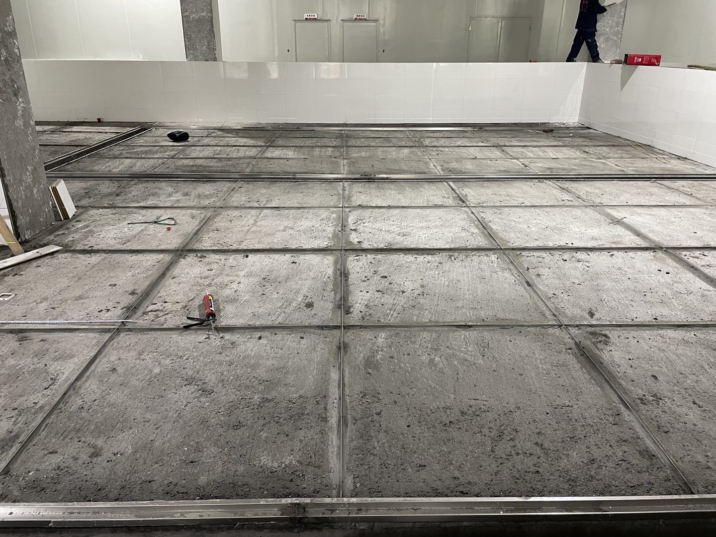 1. 擋水墻防水涂抹。2.水磨石墊層完成。3.凍庫金剛砂地坪完成