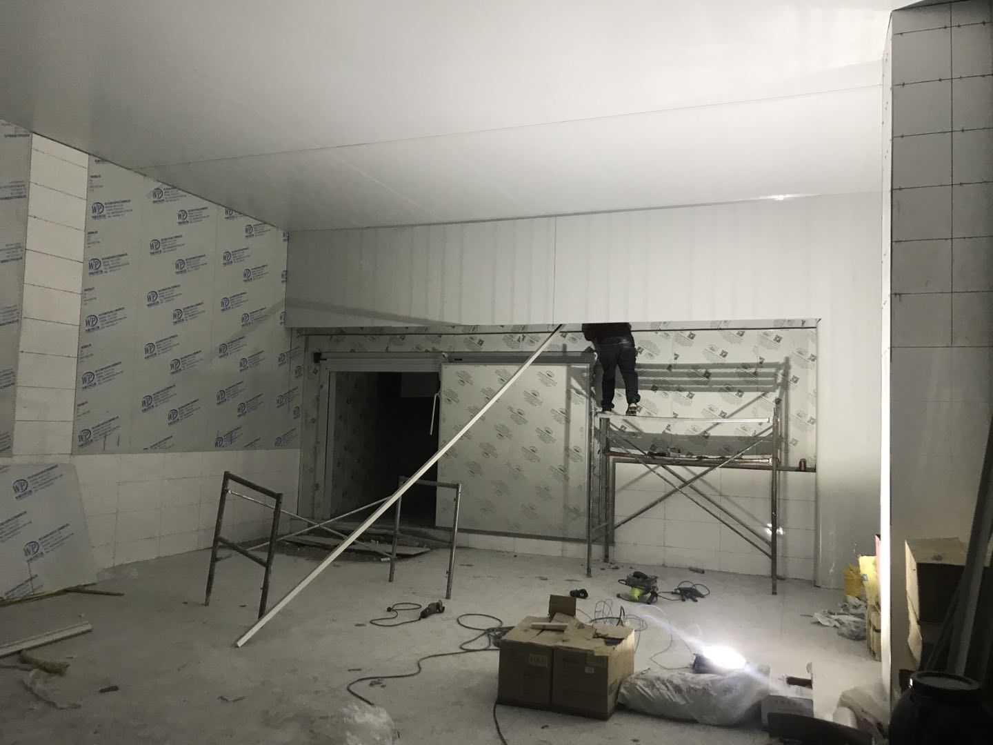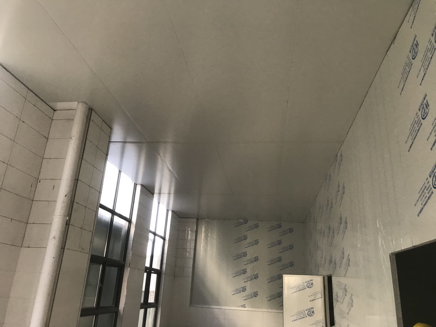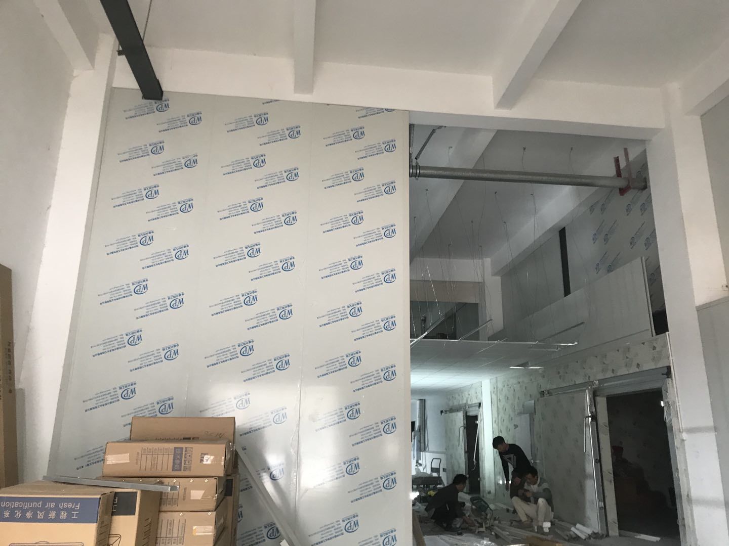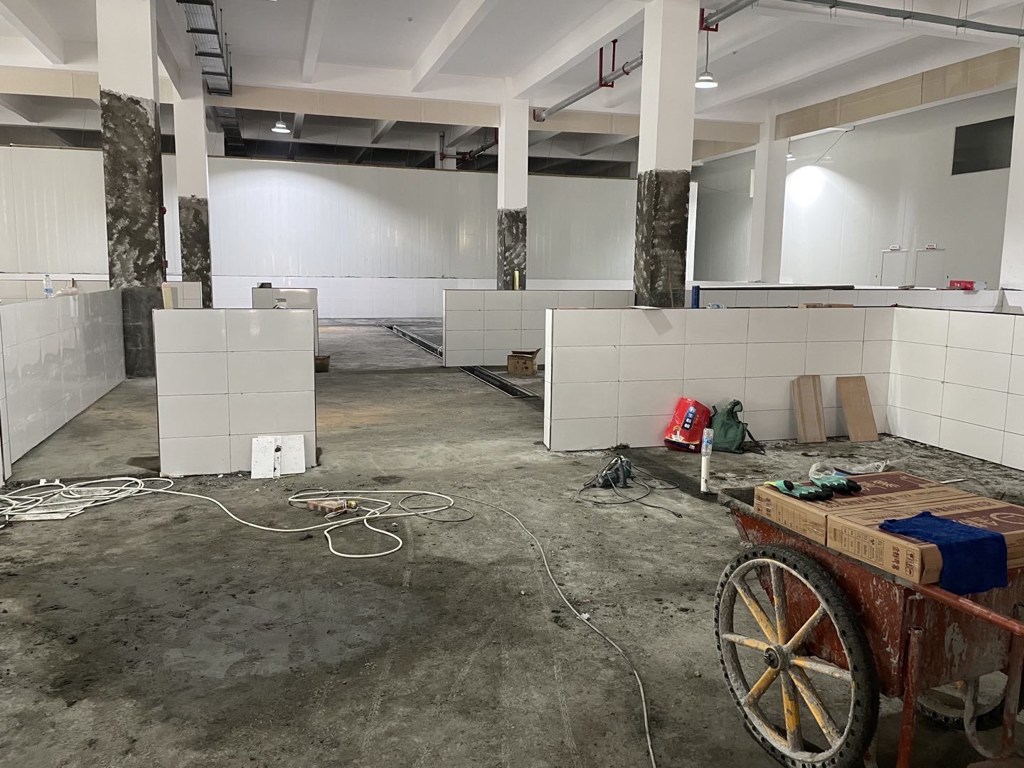 1. 擋水墻防水涂抹。2.水磨石墊層完成。3.凍庫金剛砂地坪完成