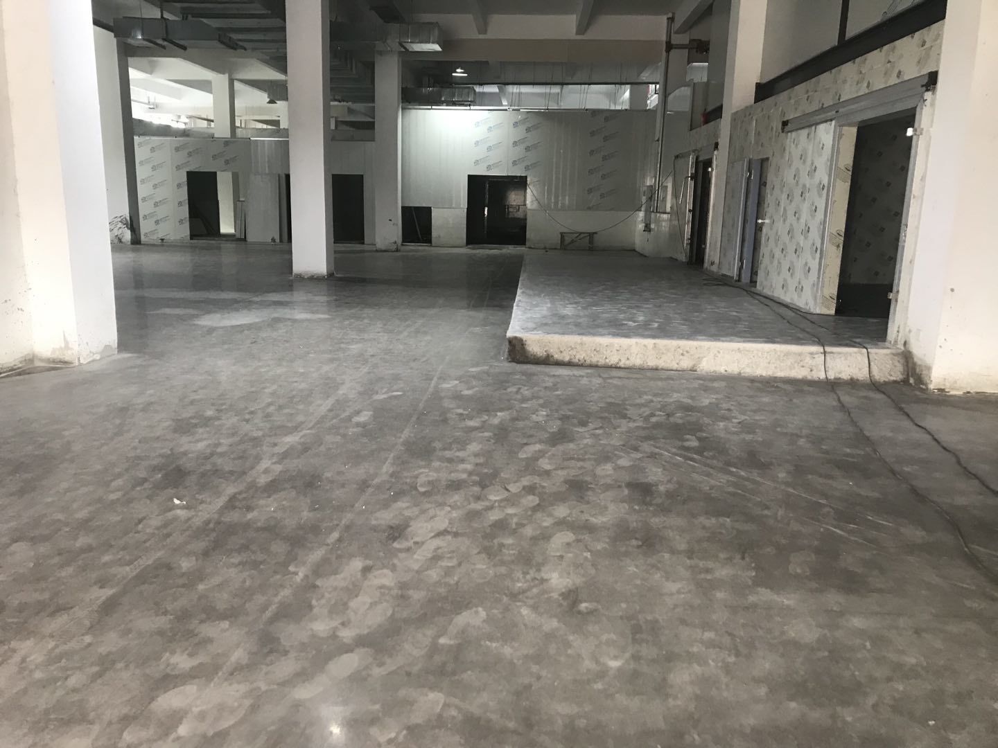 四川鮮美滋食品有限公司廠房裝修現場:1、擋水墻抹灰完成百分之30。 2、水磨石地面抓毛完成百分之35。