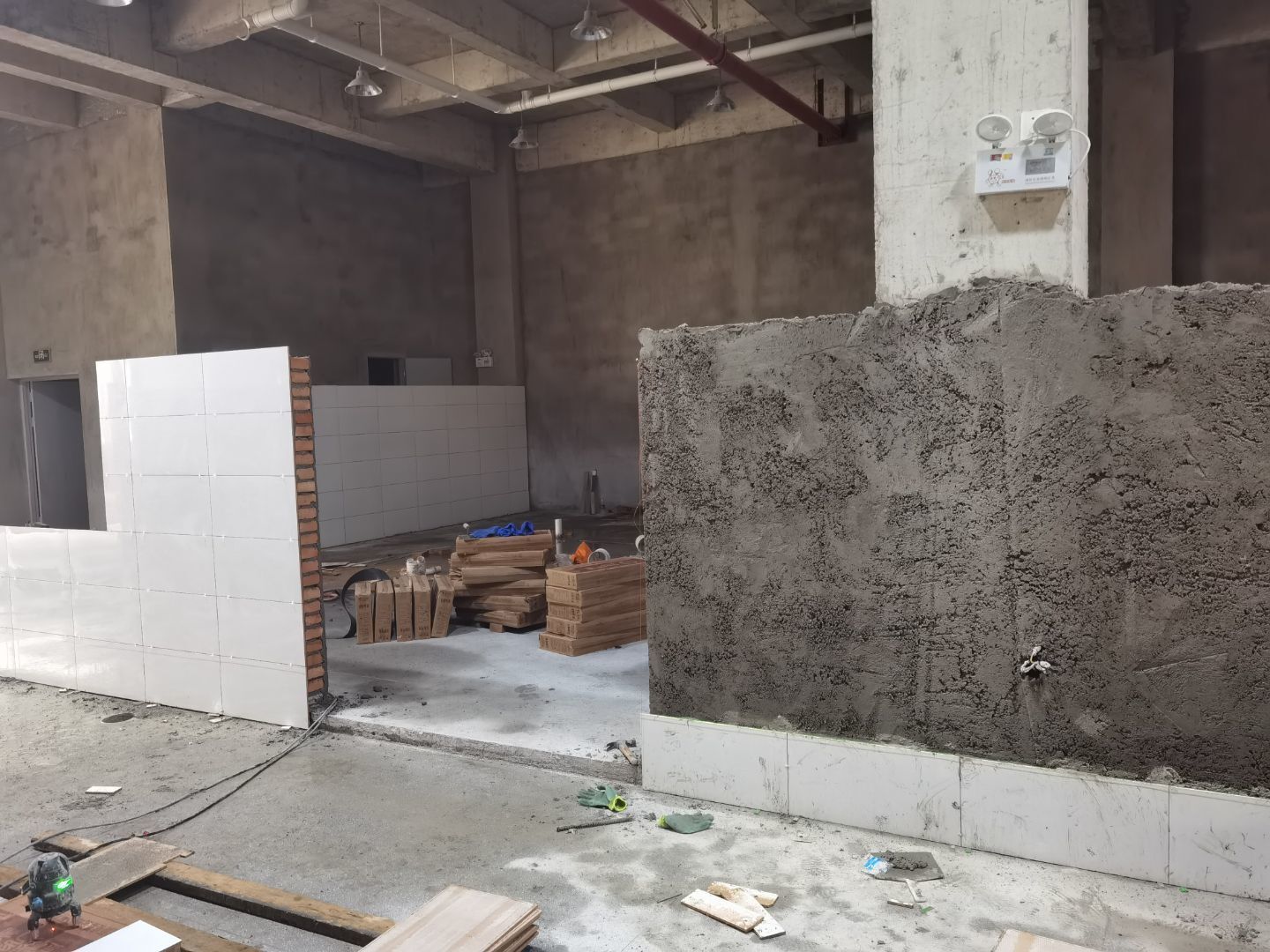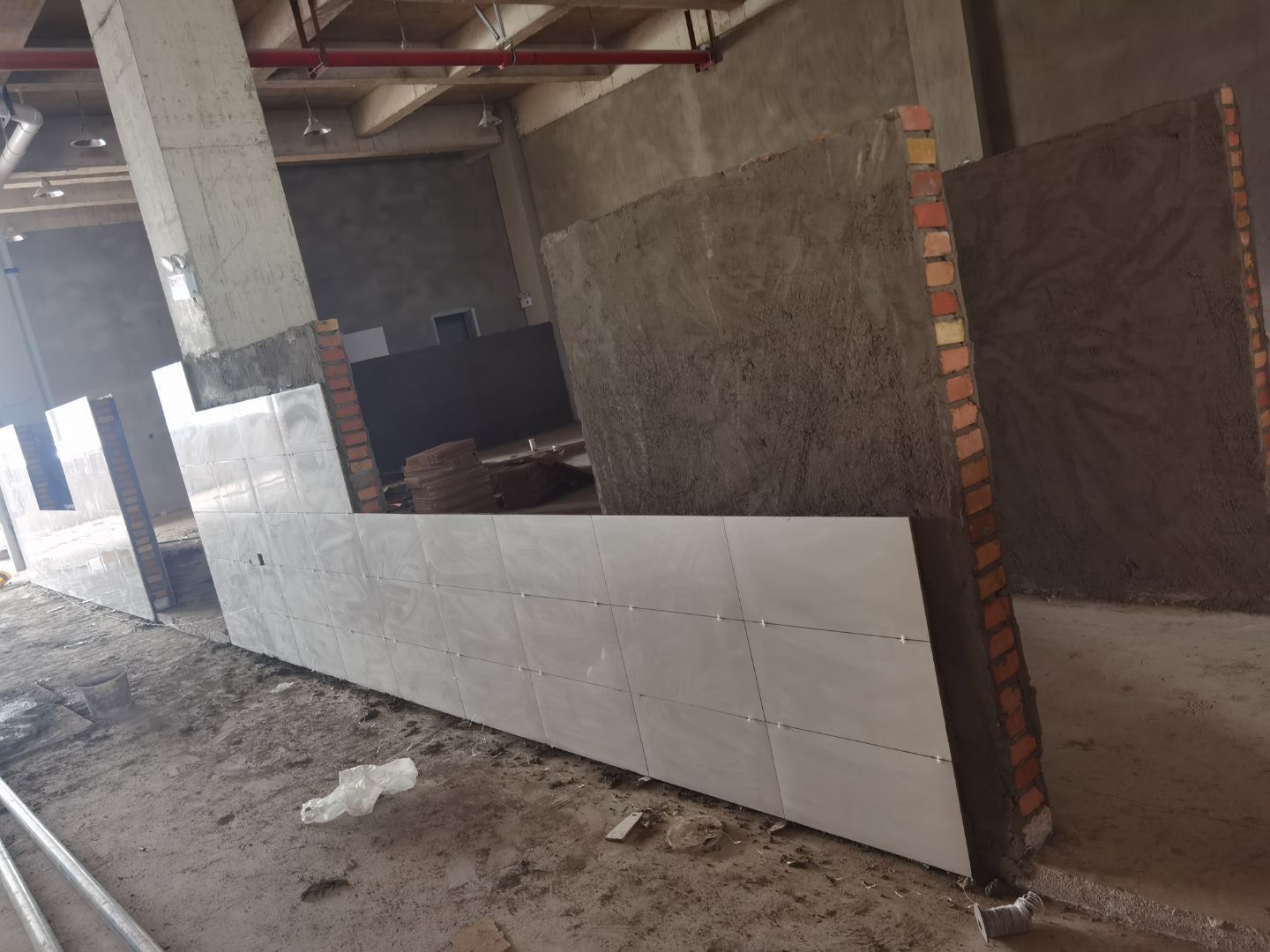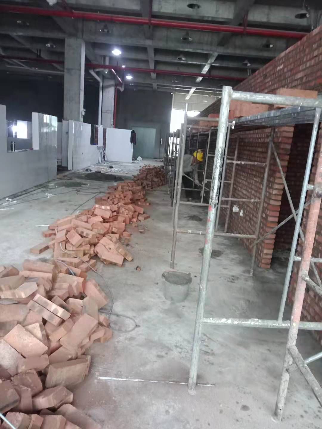 1、廁所貼磚,三層烘房磚勾縫; 2、照明線路敷設 ;3、彩板門體安裝 ;4、二三樓門體安裝。