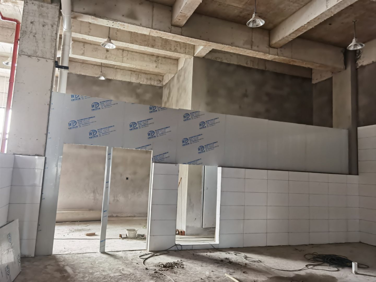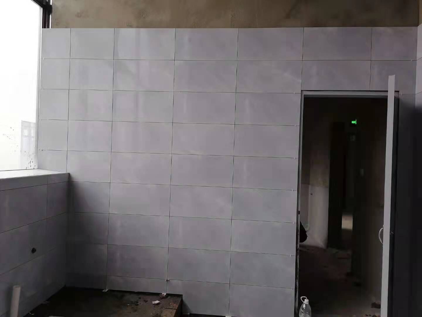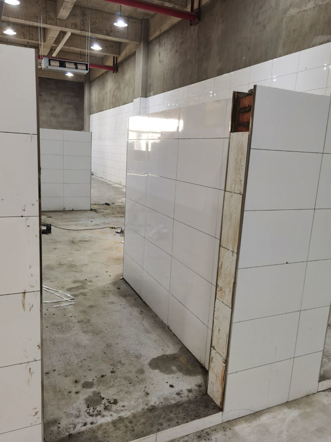 1、廁所貼磚,三層烘房磚勾縫; 2、照明線路敷設 ;3、彩板門體安裝 ;4、二三樓門體安裝。