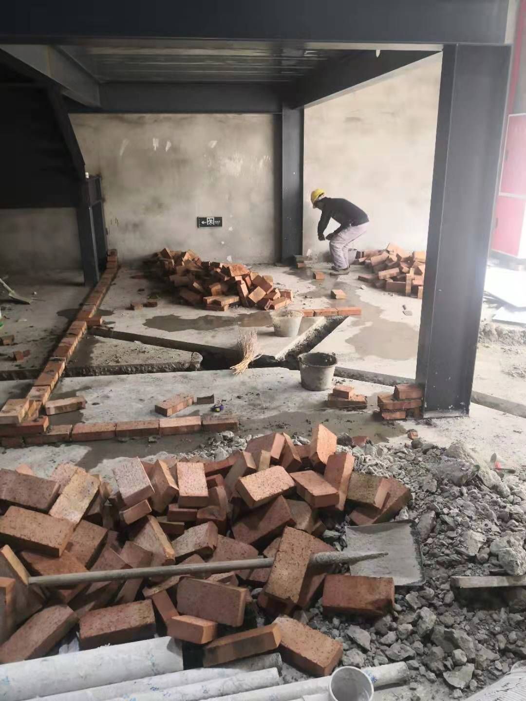 1三層磚墻砌筑 2二層磚墻貼磚 3一層破碎地面 4二三樓鋼管焊接 加固