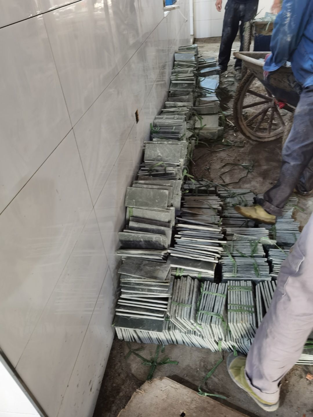 1、一層廁所砌磚完成 ;2、烘房貼磚 ;3、衛生間貼磚 ;4、彩板頂板到場。