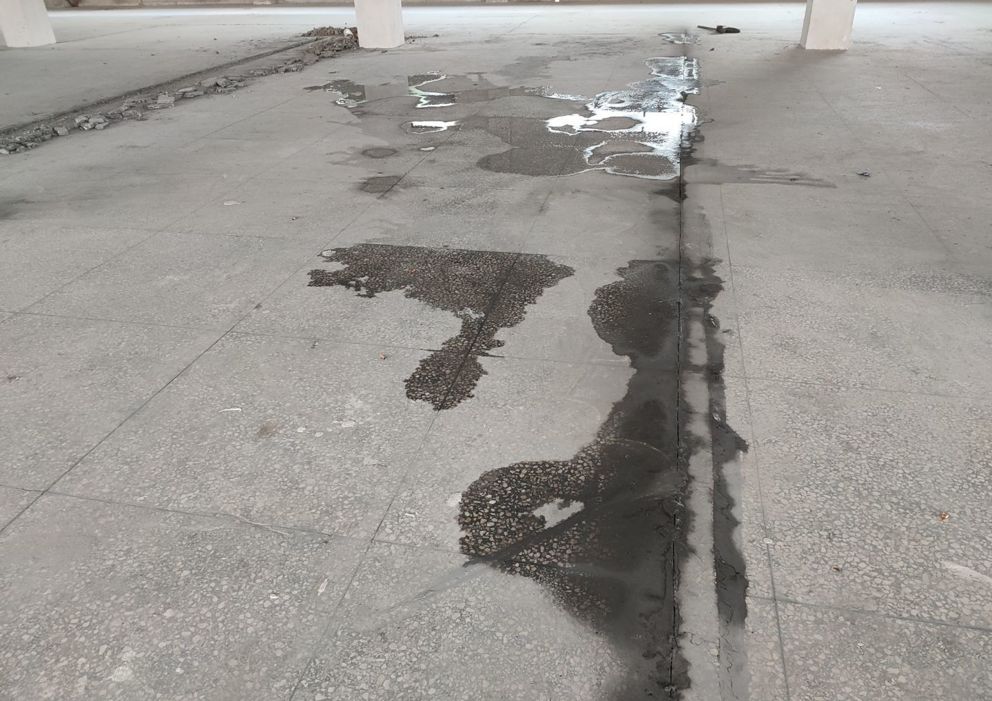 1.排水管溝回填及細石混凝土找補完成,車間坑洼補爛完成; 2.擋水墻放線完成,止水帶切割完成。
